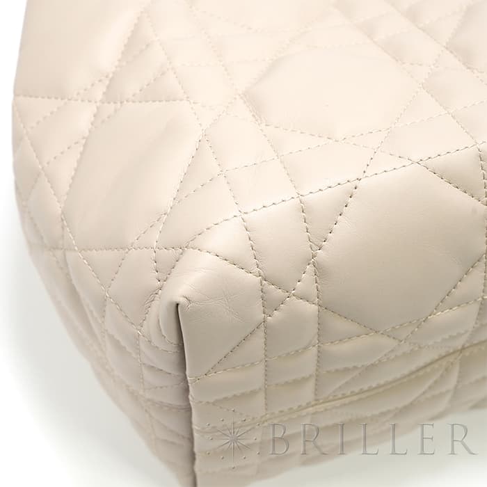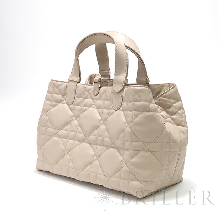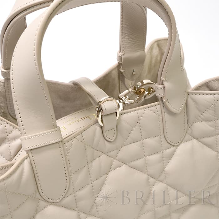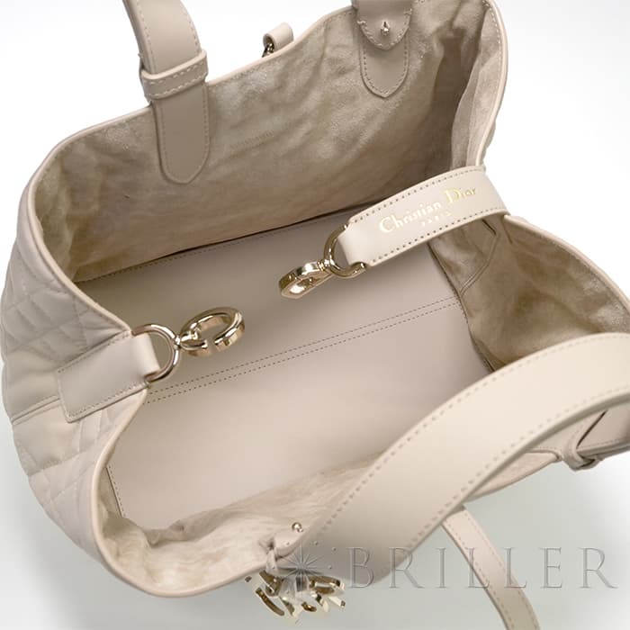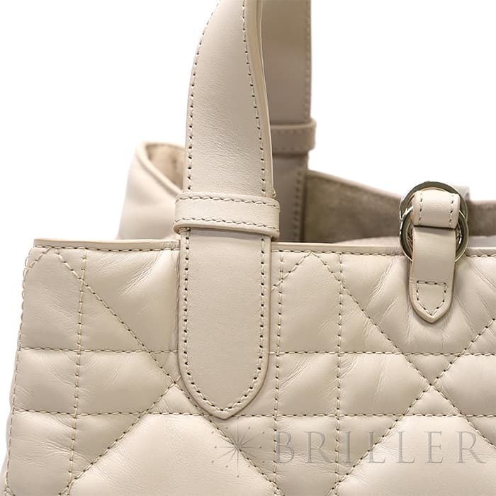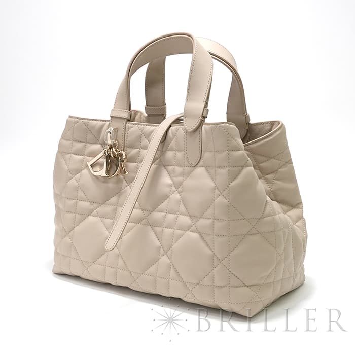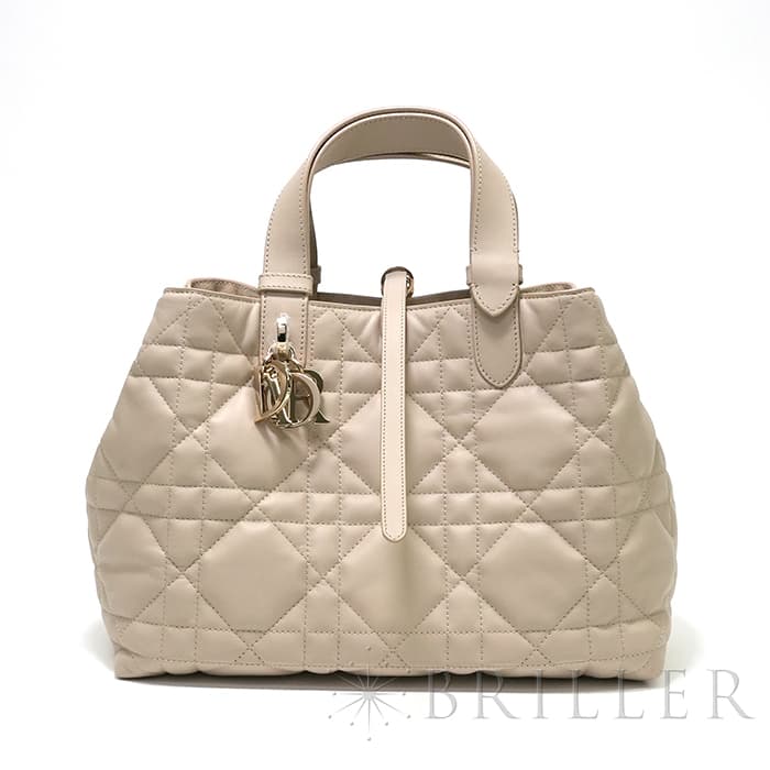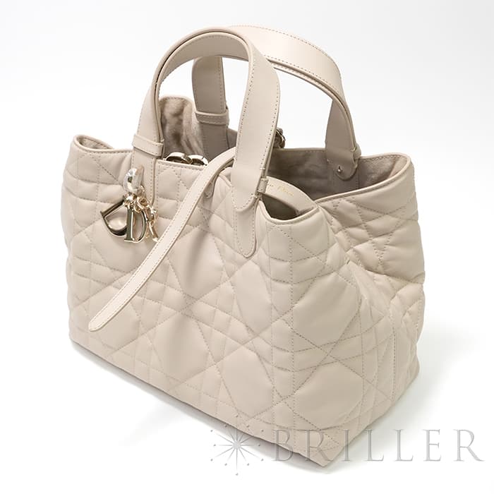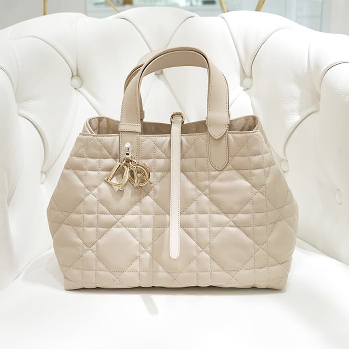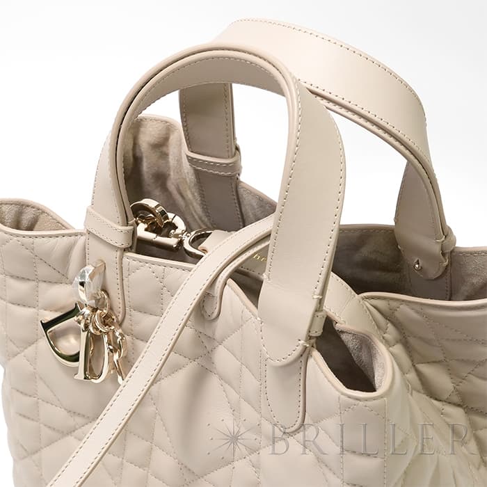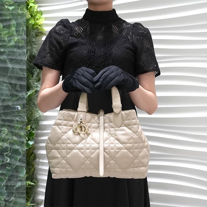 2023年春夏コレクションショーにて発表されたディオール トゥジュール。しなやかなカーフスキンにマクロカナージュステッチが施されたトートバッグです。 秋冬コレクションの新色パウダーベージュはどんな着こなしにも合わせやすく、 サイドにあるDの文字をかたどったCDロック付きのストラップにより、通常のシルエットの他に両サイドを内側に畳んだシルエットも楽しめます。またハンドル部分にはノッチがついているため、長さを調節することでハンドバッグからトートバッグまで気分に合わせてアレンジが楽しめます。 中身の整理に便利な取り外し可能なポーチ付きもついた万能アイテムです。