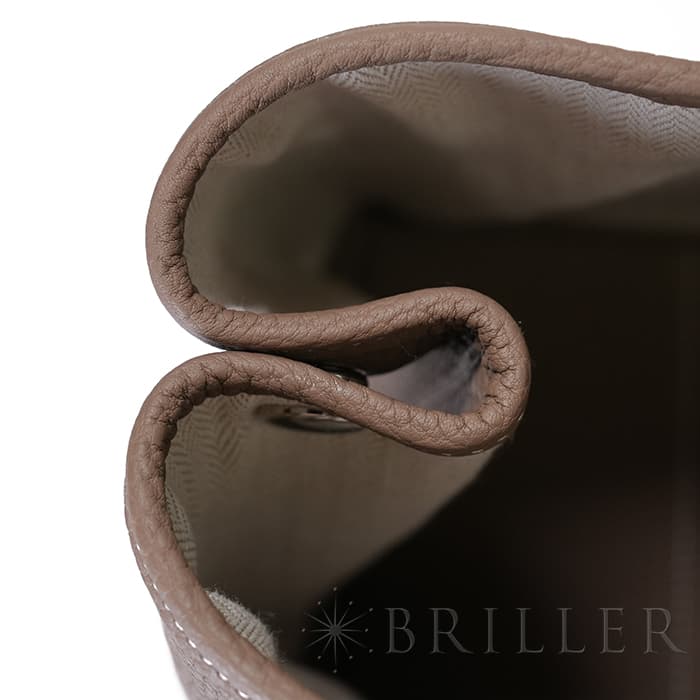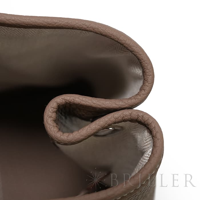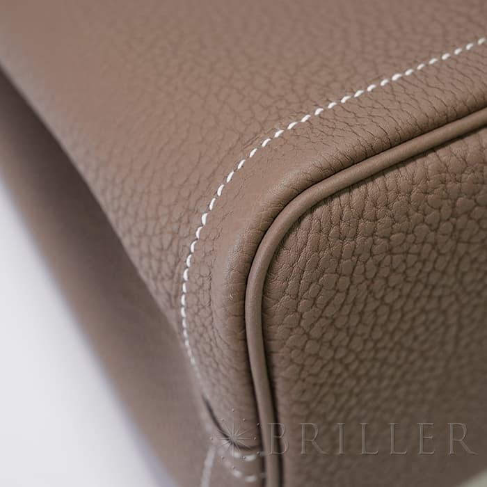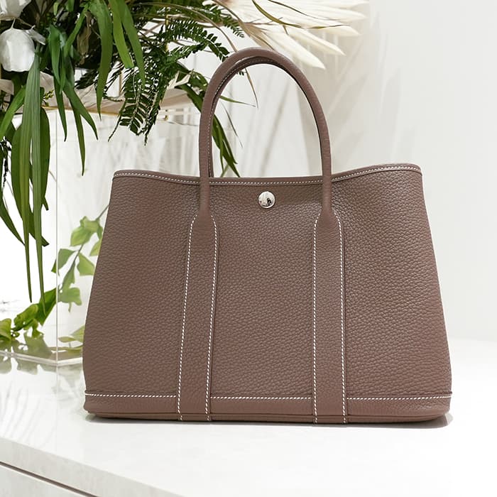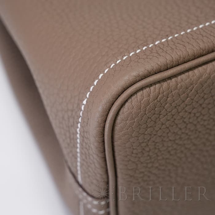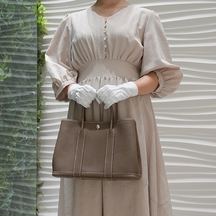 オールレザー仕様の「ネゴンダ」は目の大きな素材で傷が目立ちにくく、ムニッとした独特の手触りが癖になります。ファーストエルメスとしても人気の高いグレージュカラーの「エトゥープ」が、上品で大人らしい雰囲気を演出します。ハンドルにツイリーやチャームを合わせてアレンジいただくのもおすすめです。