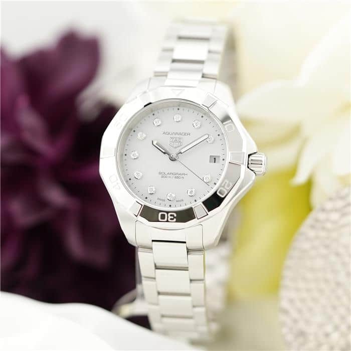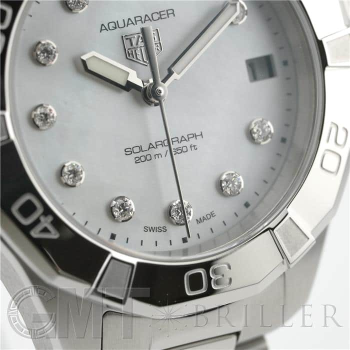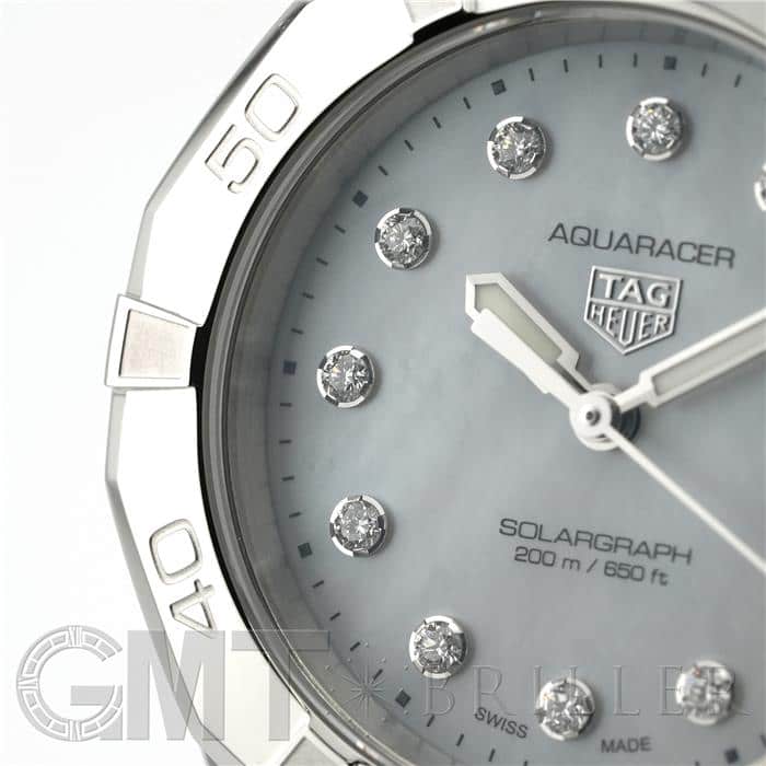 タグ・ホイヤー アクアレーサー プロフェッショナル200 ソーラーグラフ WBP1313.BA0005 1860年創業のスイスを代表する時計ブランド「タグホイヤー」。長年プロ仕様の高精度クロノグラフなどを研究・開発し、長年にわたってモータースポーツ界と関連が深いブランドです。こちらはタグホイヤーが作るマリンスポーツウォッチ「アクアレーサー」。タグ・ホイヤーとラ・ジュー・ペレが提携し共同開発したソーラーグラフキャリバー「TH50-01」は約2分間太陽光を当てるだけで一日分が充電が行われ、更に約20時間当てることでフル充電しおよそ6か月も駆動します。ホワイトMOP文字盤にダイヤインデックスは美しく、スポーティさとエレガントさが融合したモデルで、オンオフ問わずご使用できます。タグホイヤー 時計の買取り・下取りも行っておりますので、お気軽にご相談ください。
