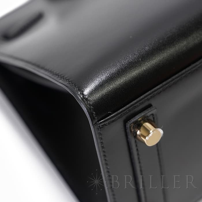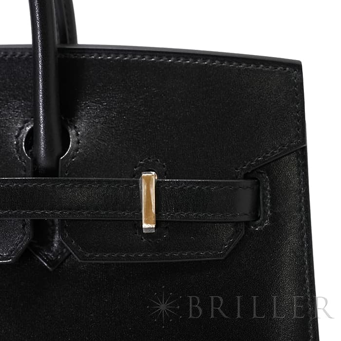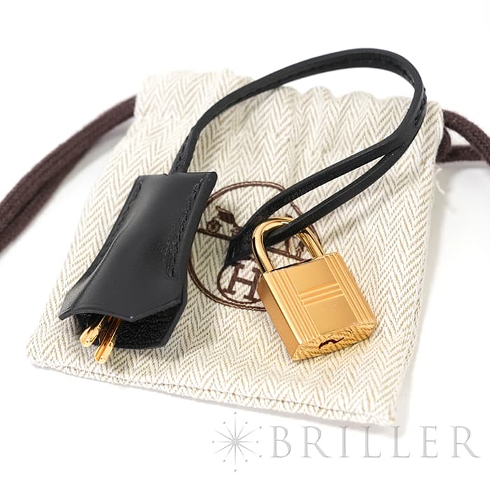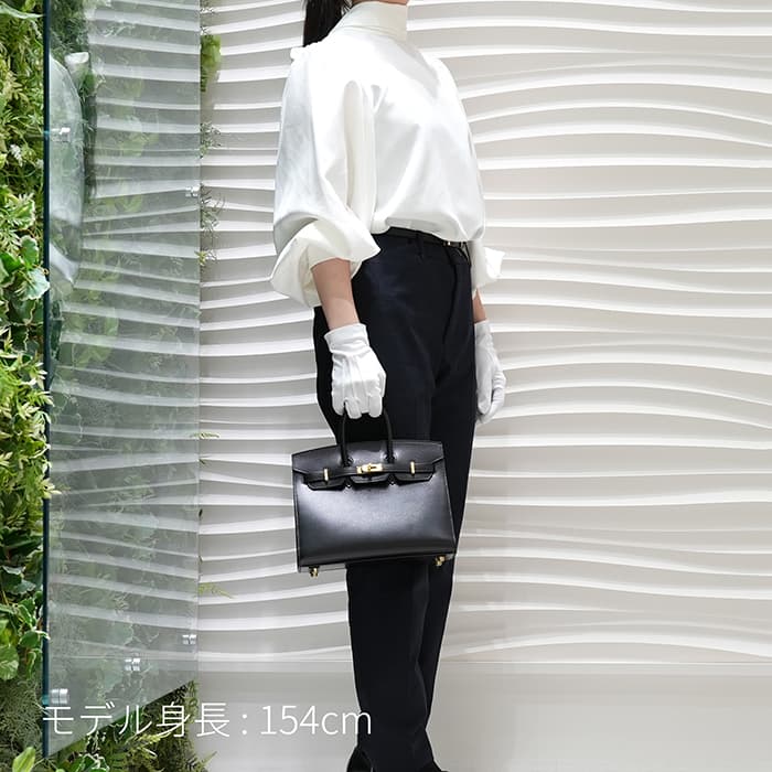 「バーキン」の由来は女優の「ジェーン・バーキン」が航空機でエルメスの社長と出会い、物があふれかえりそうになっている彼女のバッグを見て、収納がたくさんできるバッグとして創られました。整理せず物を入れることができる秀逸な「バーキン」は全世界で愛されています。 25サイズはやや小ぶりなサイズ感が特徴で、ミニ財布やポーチなど外出時に必要最低限の持ち物でお出かけされる方に大変おすすめです。外縫いのバーキン セリエは、内縫いと違ってケリーのようなかっちりとしたフォーマルな雰囲気が特徴です。まだ流通量が少ない希少なバッグとなっています。こちらは素材に優美な光沢感があるフォーマル素材「ボックスカーフ」を使用しており、ファーストエルメスとして絶大な人気を誇るブラックとゴールド金具の組み合わせがリッチでエレガントな雰囲気を演出します。