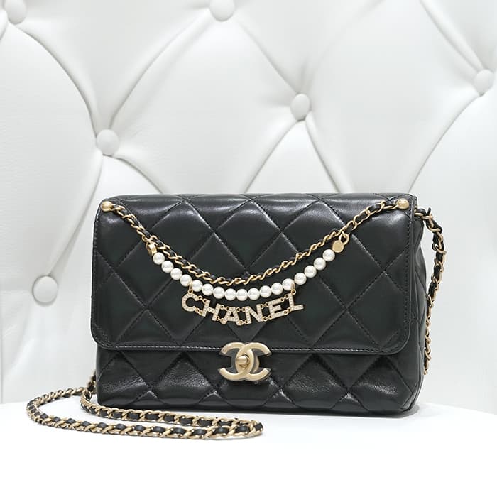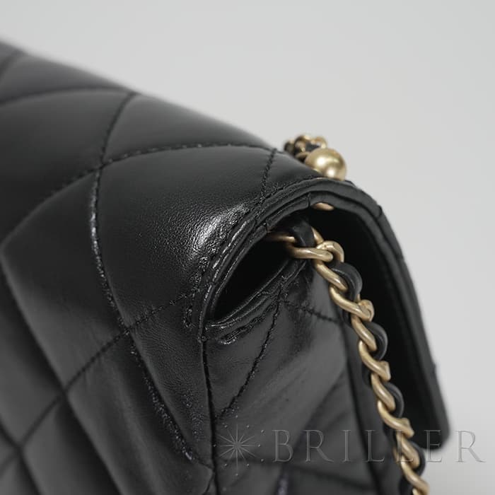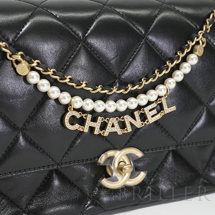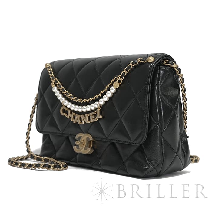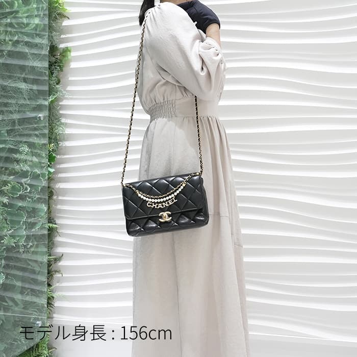 シャネルの中でも人気の高いブラックが入荷いたしました。揺れるパールがかわいいミニフラップ バッグです。シャネルのバッをの代表する「マトラッセ」は、1929年の発売以来、幅広い世代から愛されてきたモデルです。型崩れしにくくなる効果があるキルティング加工を施すことで、リッチな質感だけでなく、デイリーユースしやすい実用性をも実現しています。2枚の生地を縫い合わせたキルティングによって美しい模様が浮かび上がり、ふっくらとした印象で女性らしさを感じられます。ミニフラップバッグのチェーンにコスチュームパールと「CHANEL」ロゴがあしらわれ、動きに合わせて揺れるモチーフがとても可愛らしいバッグです。
