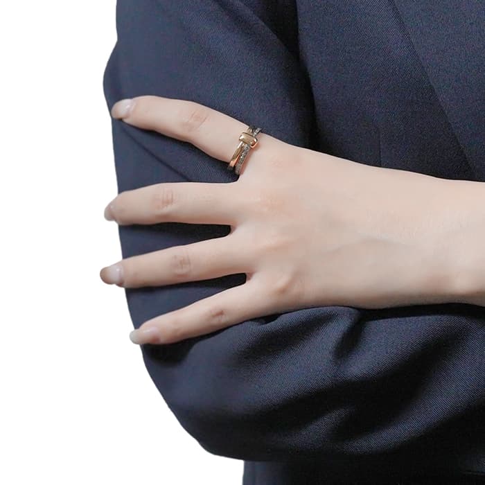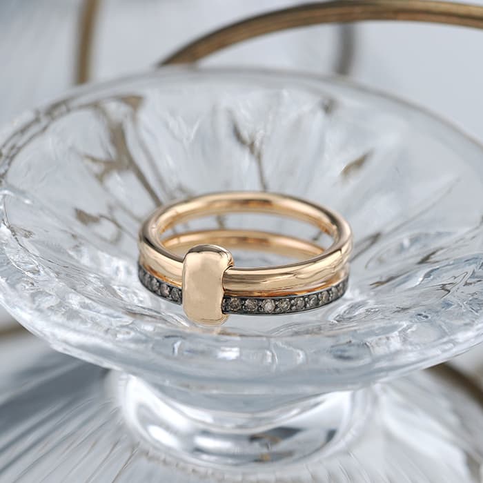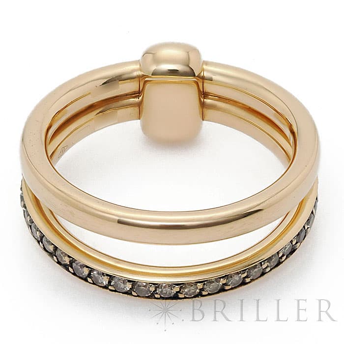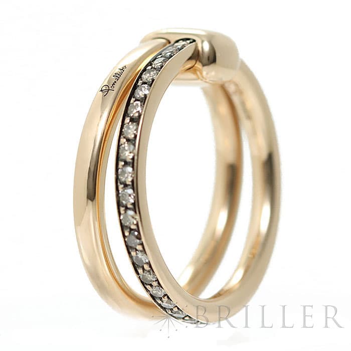 1967年にミラノで生まれたジュエリーブランド「ポメラート(POMELLATO)」。2023年に誕生した普遍の愛の力を賛美するコレクション「POMELLATO TOGETHER」のリングが入荷いたしました。 ふたつのエレメントを束ねる一体感の強さを表す中心のモチーフは、永遠の抱擁を象徴しています。 肌なじみの良いローズゴールド素材に、贅沢に32粒のブラウンダイヤモンド(0.4カラット)をセッティング。 リンクの部分を表に見えるようにしたり後ろ側に隠したりと二通りの着け方が楽しめます。 ふたつのリングのコンビネーションは、ミラノの控えめな優雅さを最大限に演出しています。