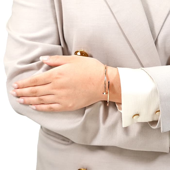 フランスで誕生し、独創的なデザインや技術力の高さから圧倒的な支持を受けるブランド「カルティエ」。 1本の釘から誕生したジュエリー「ジュスト アンクル」のブレスレットは、個性的かつ上品なデザインが人気のジュエリーです。 大胆かつモダンな雰囲気で、洗練された美しさを放ちます。こちらは、ピンクゴールドのスモールサイズです。