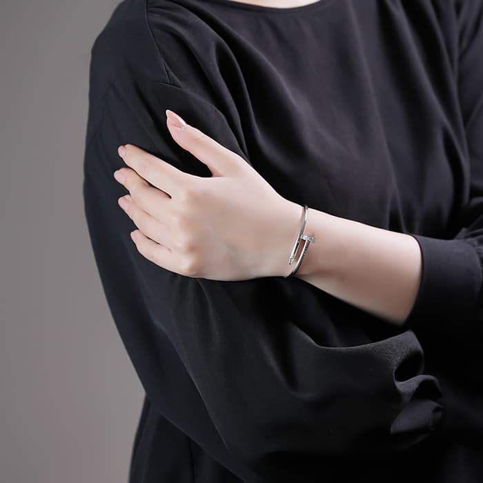 大胆かつモダンなデザインのホワイトゴールドブレスレットは、適度な力強さと美しさを兼ね揃えています。