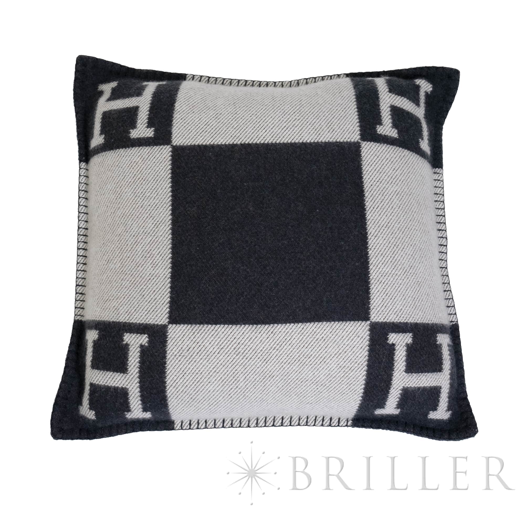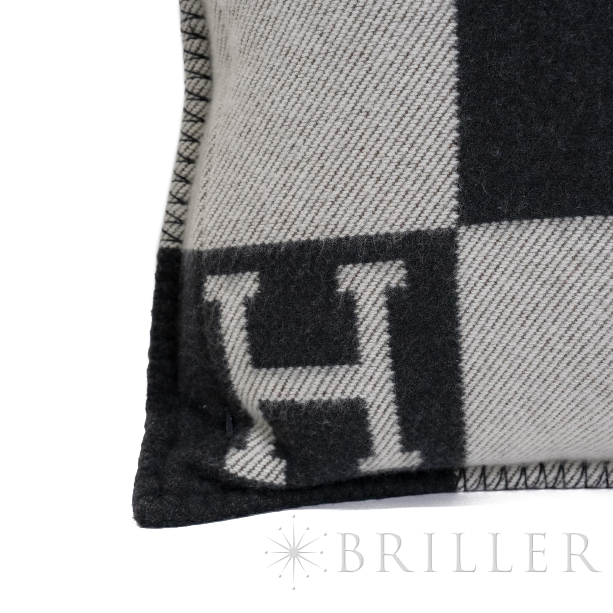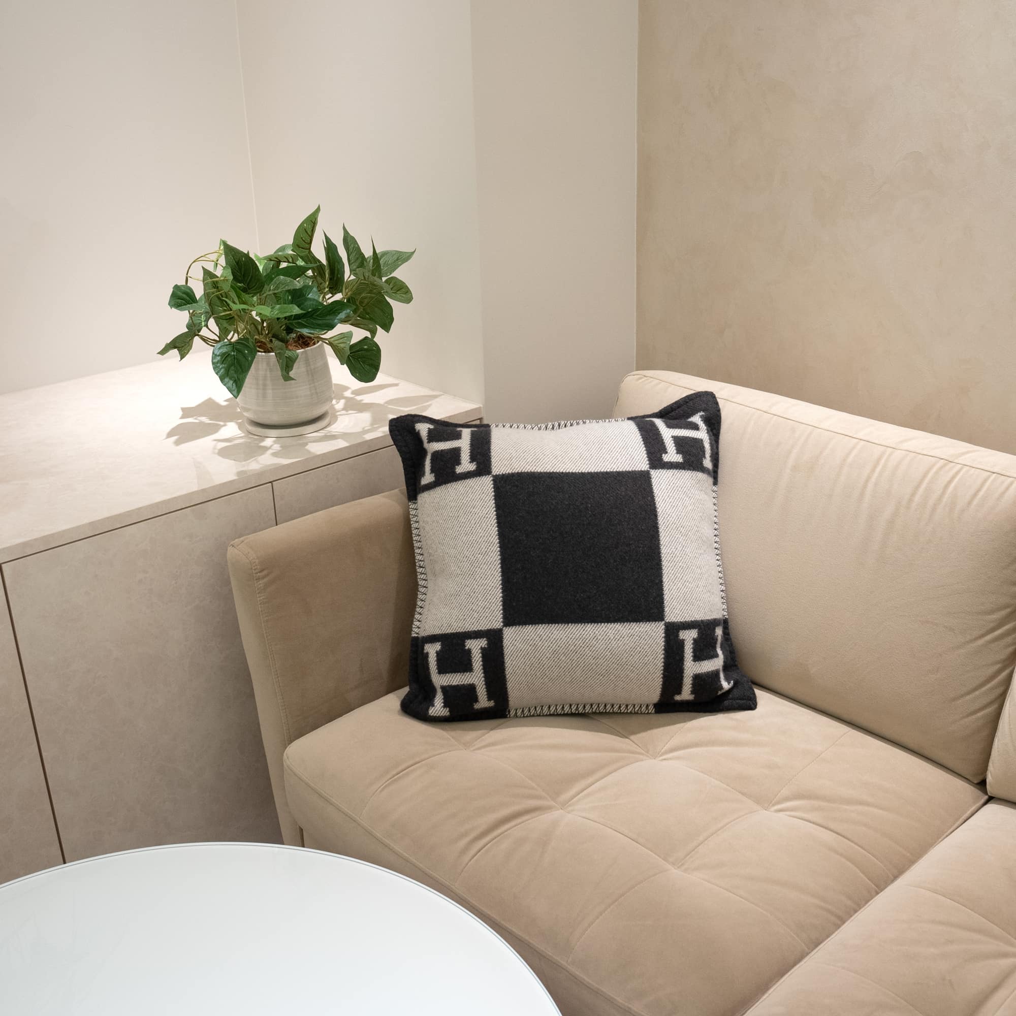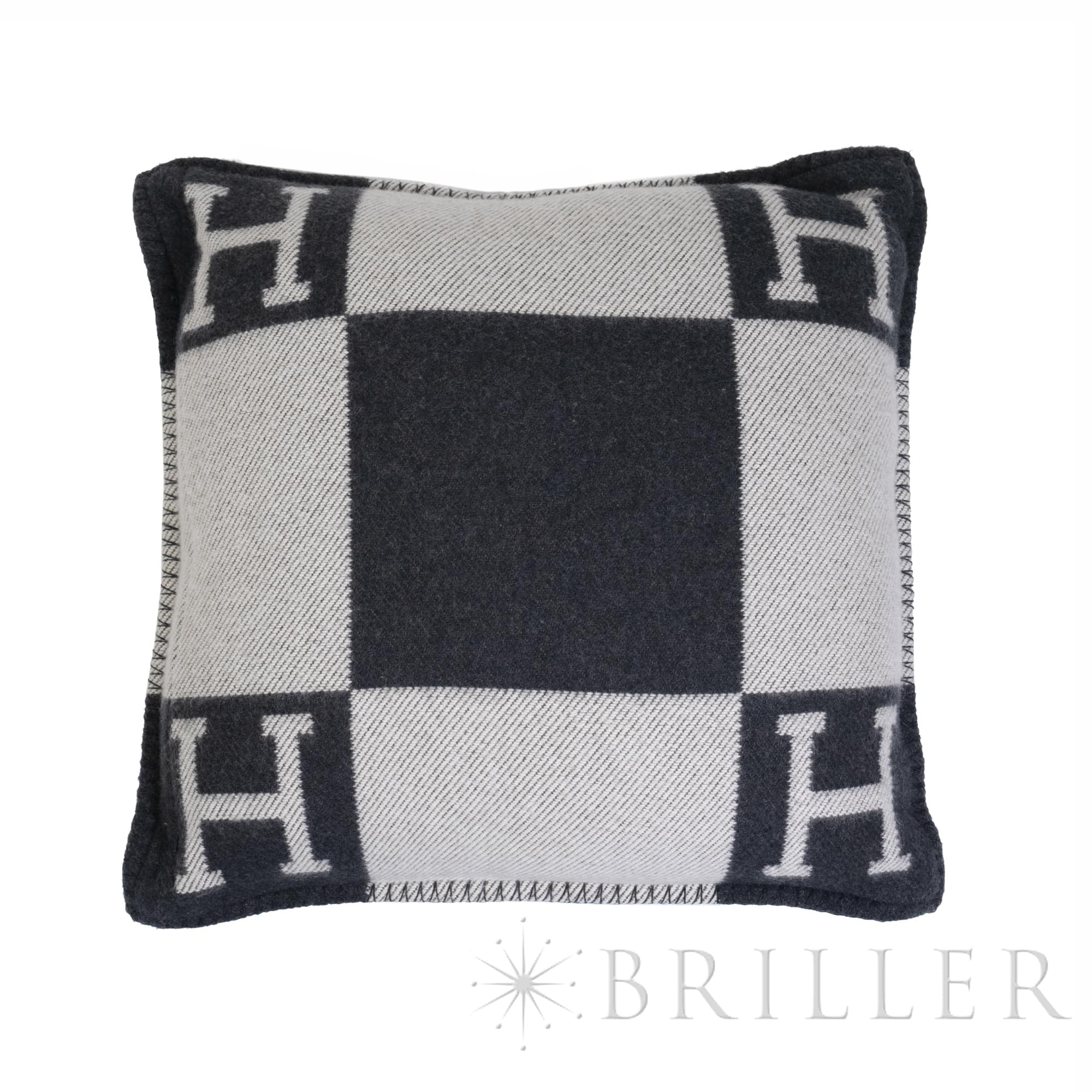 エルメス 《アヴァロン》 クッション エクリュ / グリ・フォンセ PM H102667M 53 Hermès 隅を彩るH文字が特徴的な《アヴァロン》。 熟練の職人技と精密な機械技術が融合したエルメスの代表作です。 ブランドを象徴する「H」が四隅にあしらわれ、上質なメリノウール/カシミヤの手触りが極上のひとときを演出します。 カラーバリエーションも豊富で色違いで揃えたくなる、プレゼントにもおすすめのクッションです。 メリノウール/カシミヤのジャカード織カバーは取り外し可能です。