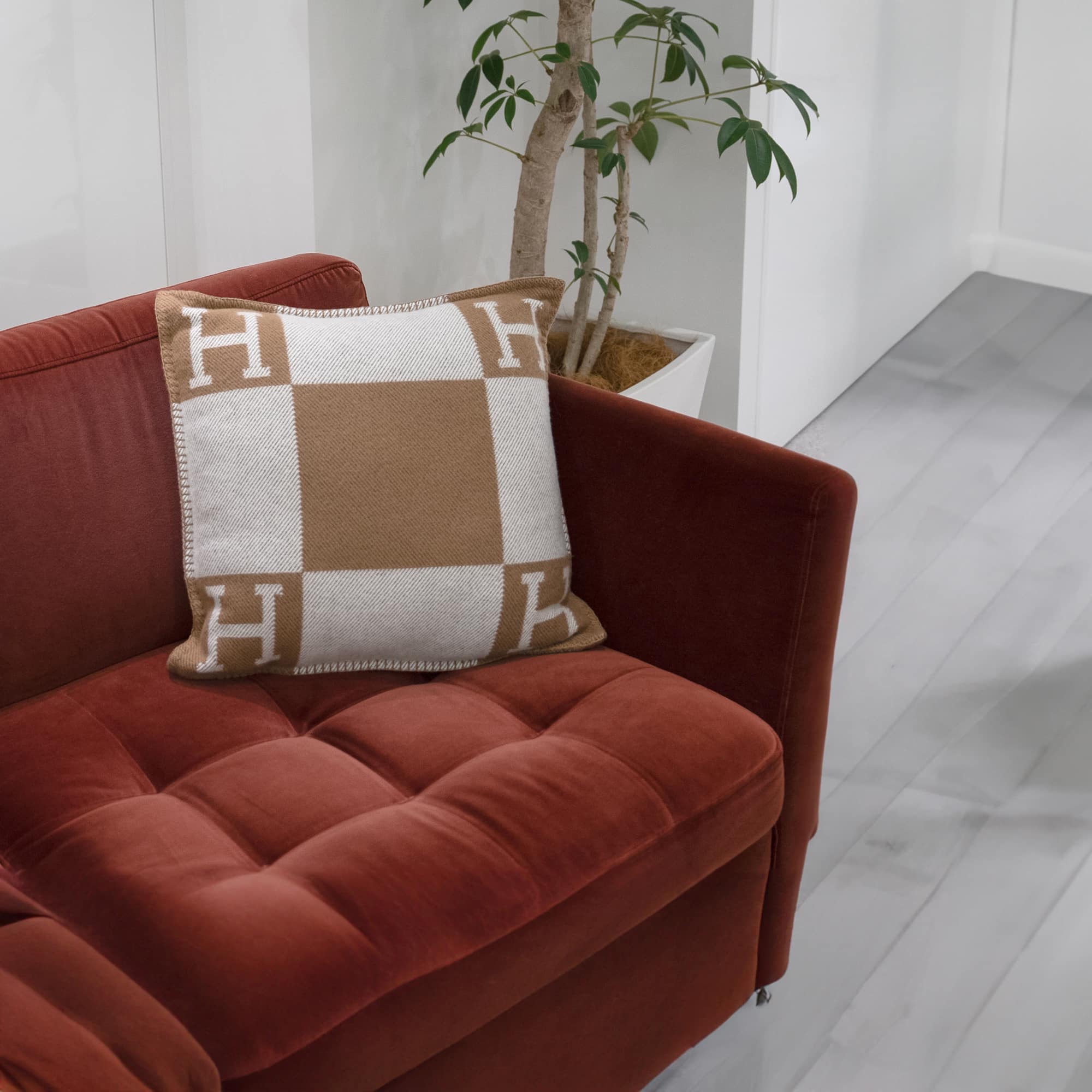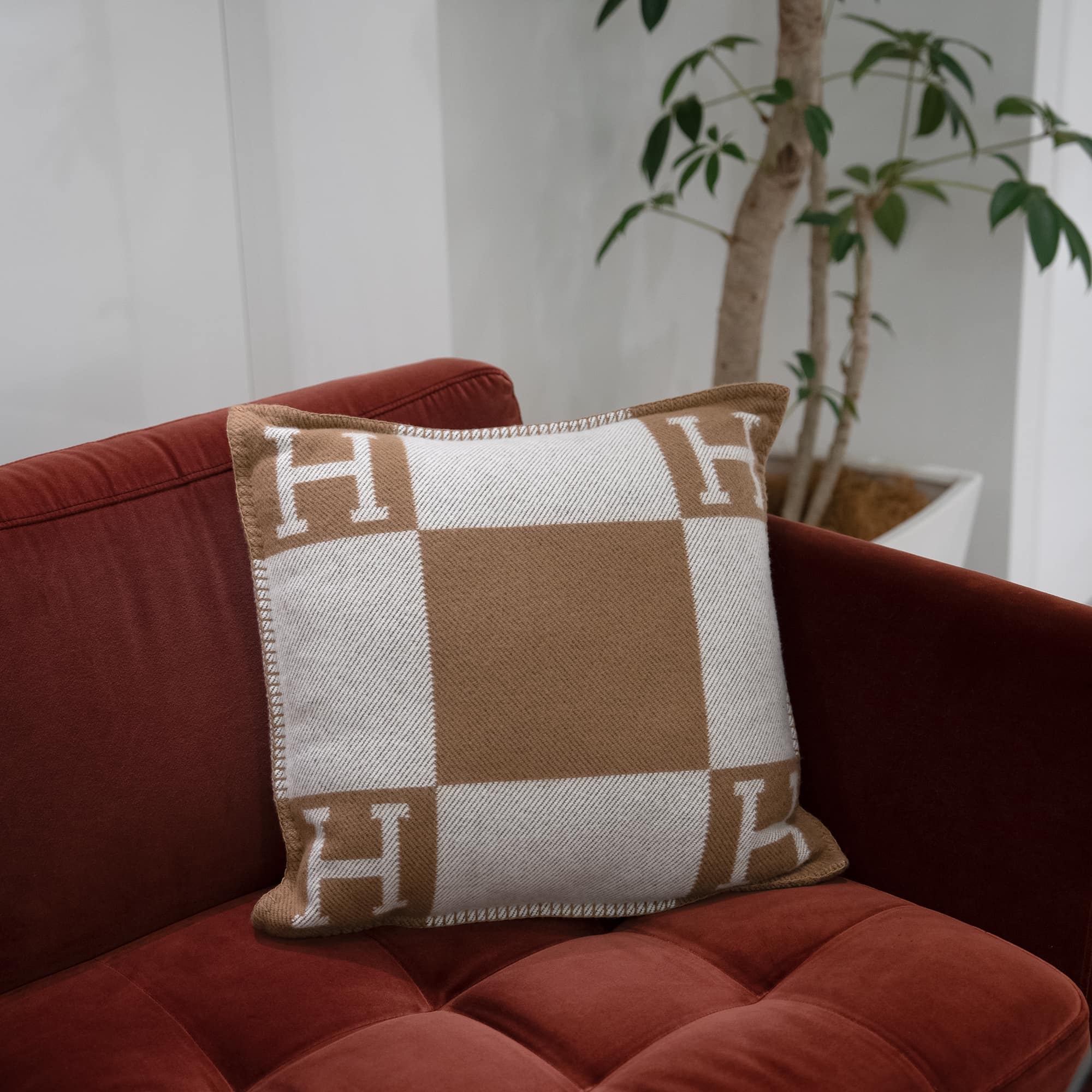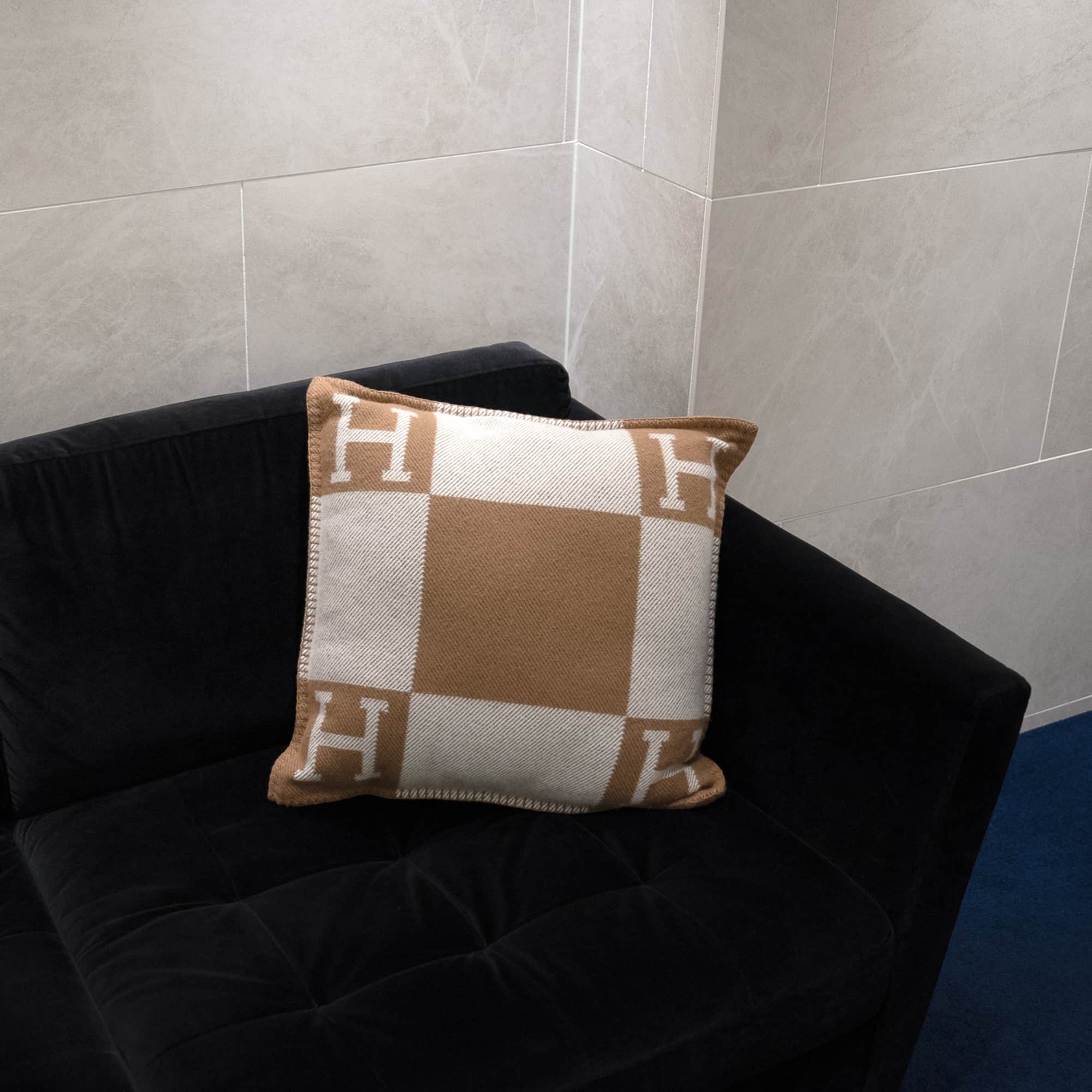 隅を彩るH文字が特徴的な《アヴァロン》。 熟練の職人技と精密な機械技術が融合したエルメスの代表作です。 ブランドを象徴する「H」が四隅にあしらわれ、上質なメリノウール/カシミヤの手触りが極上のひとときを演出します。 カラーバリエーションも豊富で色違いで揃えたくなる、プレゼントにもおすすめのクッションです。
