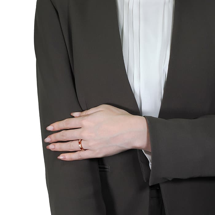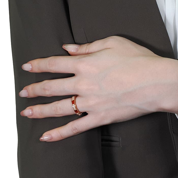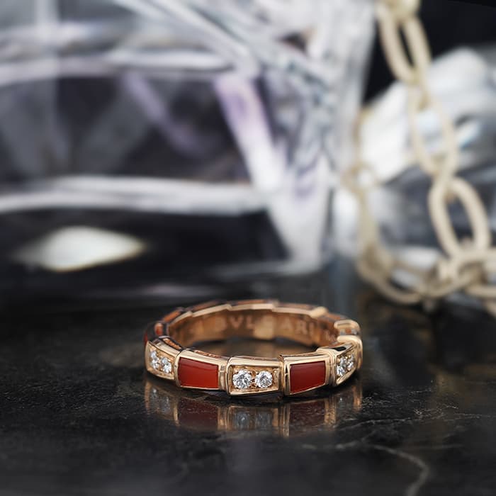 ブルガリを代表するアイコンであるセルペンティを、その洗練されたデザインが際立つよう再解釈して生み出された「セルペンティ ヴァイパー」 様式化された鱗のモチーフが連なる構造は、新たな蛇の魅力を大胆に表現しています。 シンプルな構成ながらもカーネリアンとダイヤモンドが交互に輝く存在感のある指輪です。