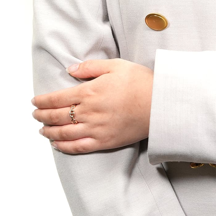 船の錨をモチーフにした、エルメスを象徴するようなデザインのシェーヌダンクル。1937年、ロベール・デュマはノルマンディの海岸を、船を眺めながら散策していた際に船を岸につなぎとめる錨の鎖が視線を捉えたことをきっかけにして、エルメスを代表する《シェーヌ・ダンクル》が誕生しました。男女兼用でお使いいただけるリングです。