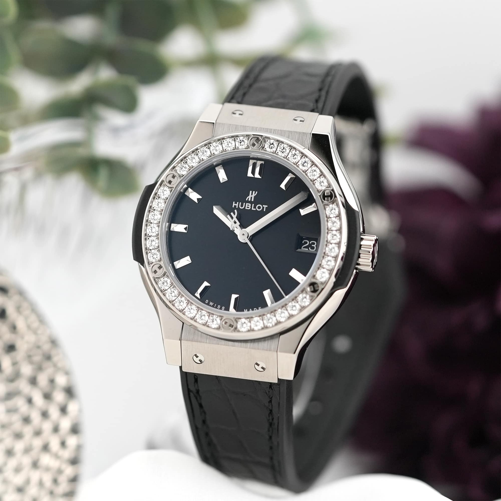シンプル&ベーシックが魅力的な「クラシックフュージョン」のレディースサイズ。ベゼルには36個計0.8ctものダイヤモンドをセッティングしたラグジュアリーモデル。信頼性の高いクォーツムーヴメントを搭載、ケースにはチタンを使用し、軽量です。ケースサイズが33mmとレディースではやや大きめで、ウブロの魅力を活かしています。ペアウォッチとしてもおすすめのこちらの時計は、シーンを選ばずにご利用いただけます。