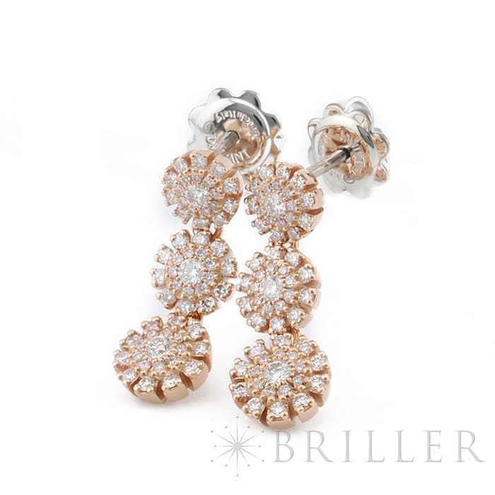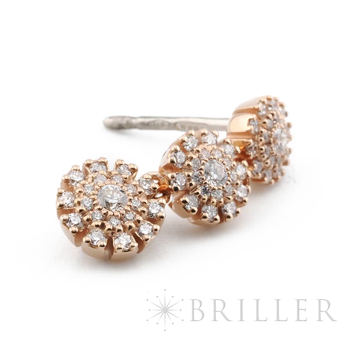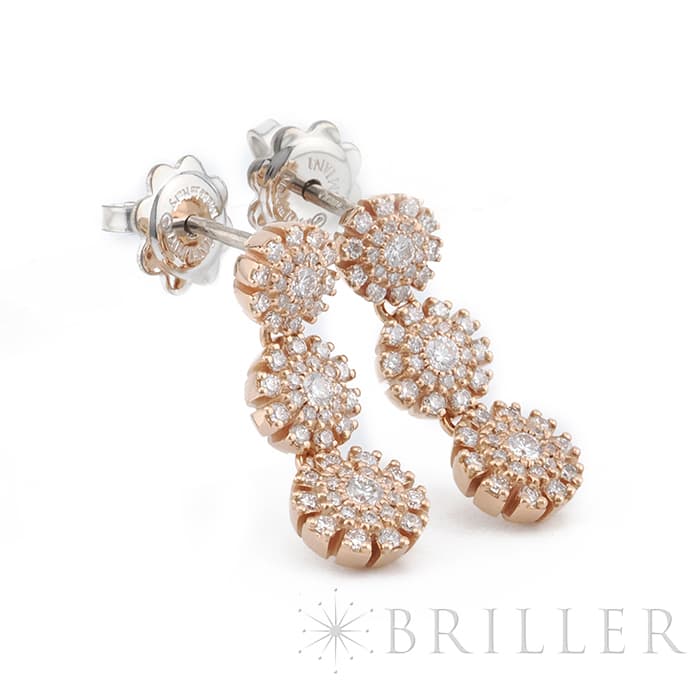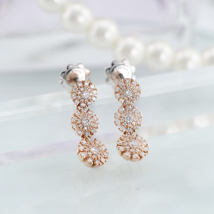 ダミアーニの人気コレクション「マーガレットの花」を意味する「マルゲリータ」ピアス。 二十世紀の初めにエンリーコ・グラッシ・ダミアーニがマルゲリータ女王に捧げた指輪から着想を得たコレクションです。 3つ連なったピンクゴールドのマーガレットの花が優雅に輝き、繊細でロマンチックな女性の美しさを際立たせ、耳元を華やかに演出します。