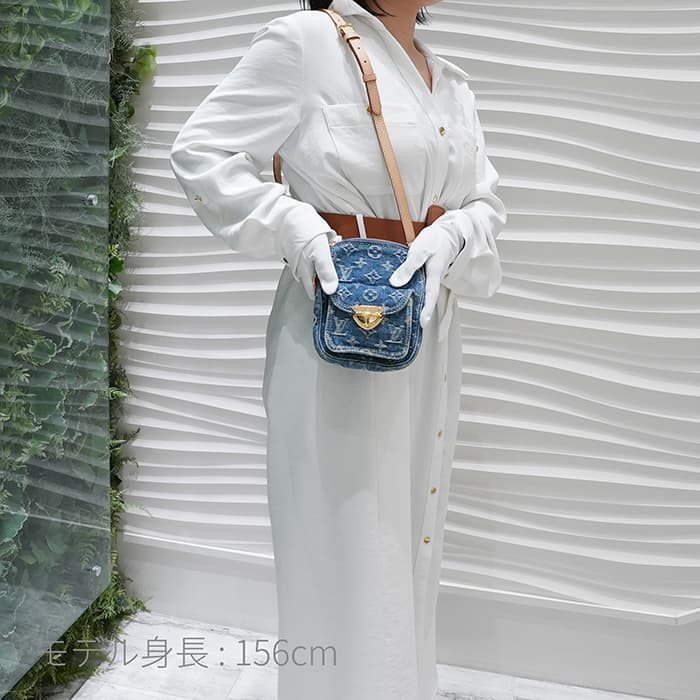 過去作品の魅力を現代的にアレンジした最新コレクション「LV リミックス」。ブランドの象徴であるモノグラムやデニム素材を活用し、クラシカルなデザインに現代的な要素を加えたコレクションです。コットンデニムをブリーチ加工し、バッグの形状に組み立て、最後にストーンウォッシュ加工を施すことで、1点1点異なる表情を生み出しています。フロントの差し込み式金具が特徴的な「ポシェット・フェアファックス」。スマートフォンやカードケースなどを収納するのにぴったりなアイテムです。