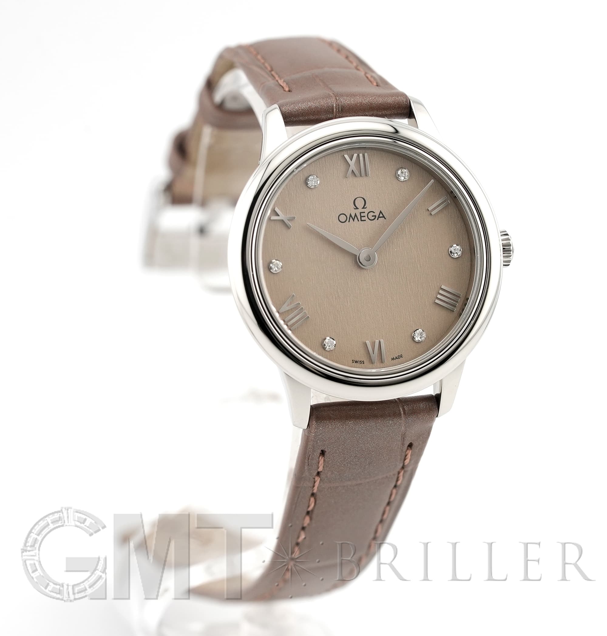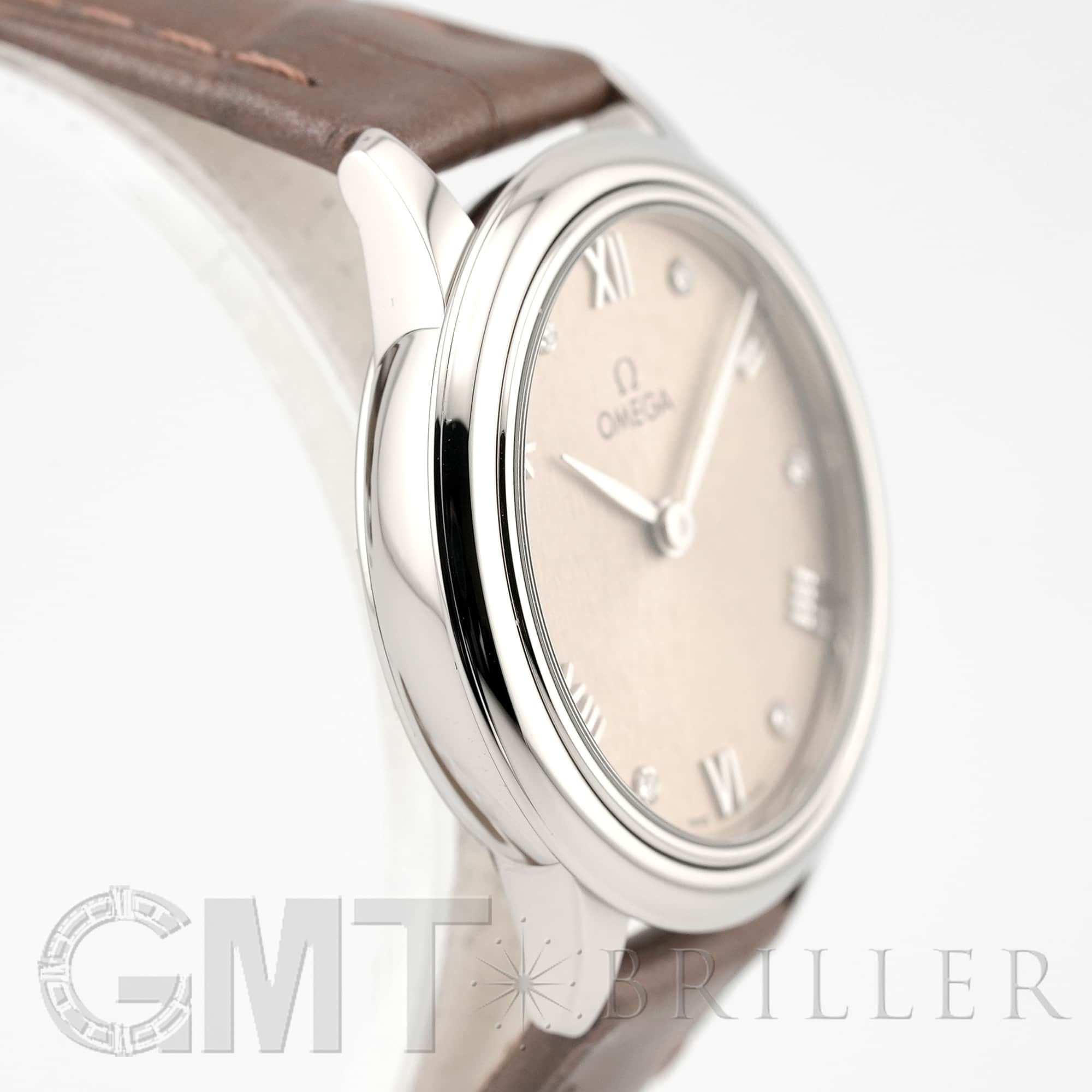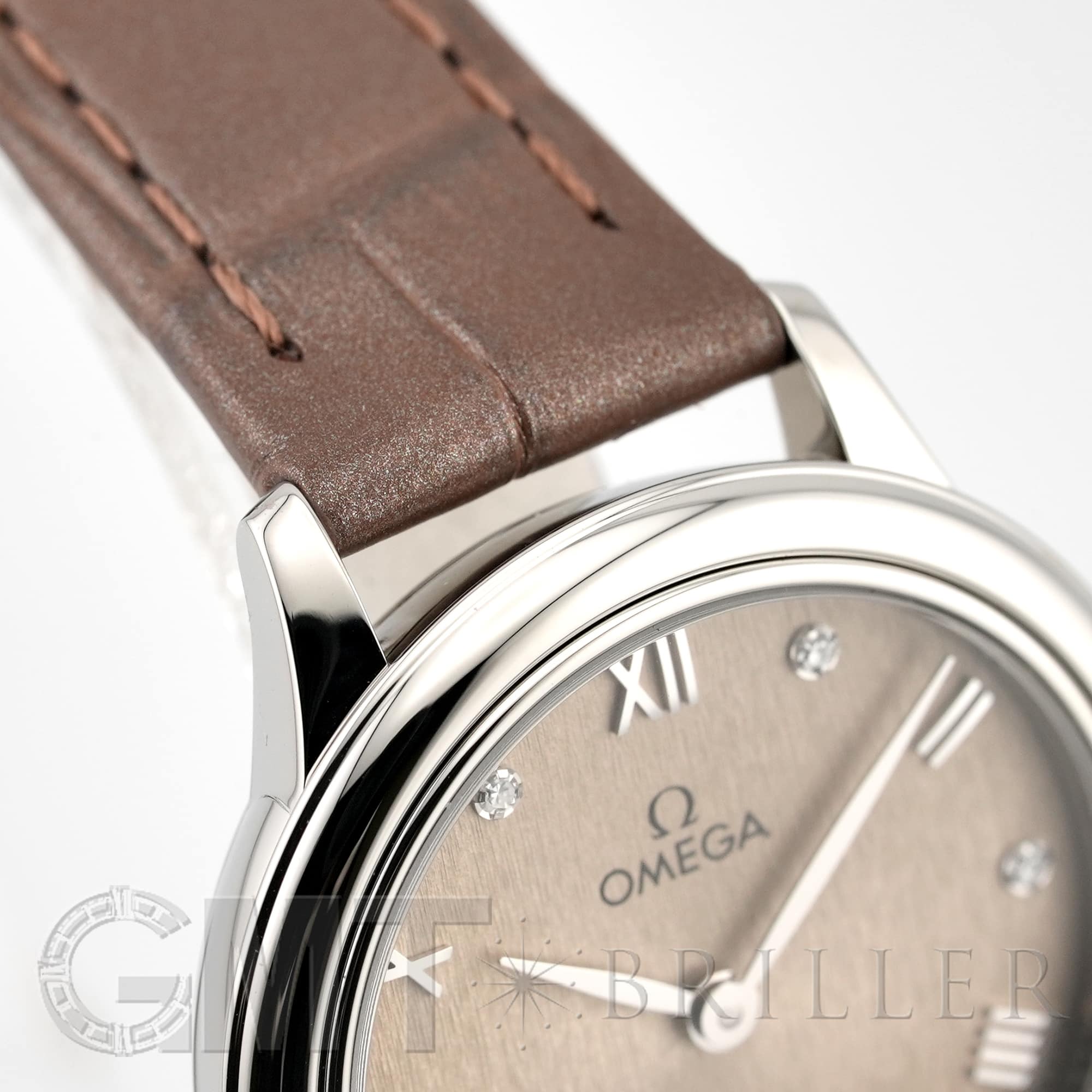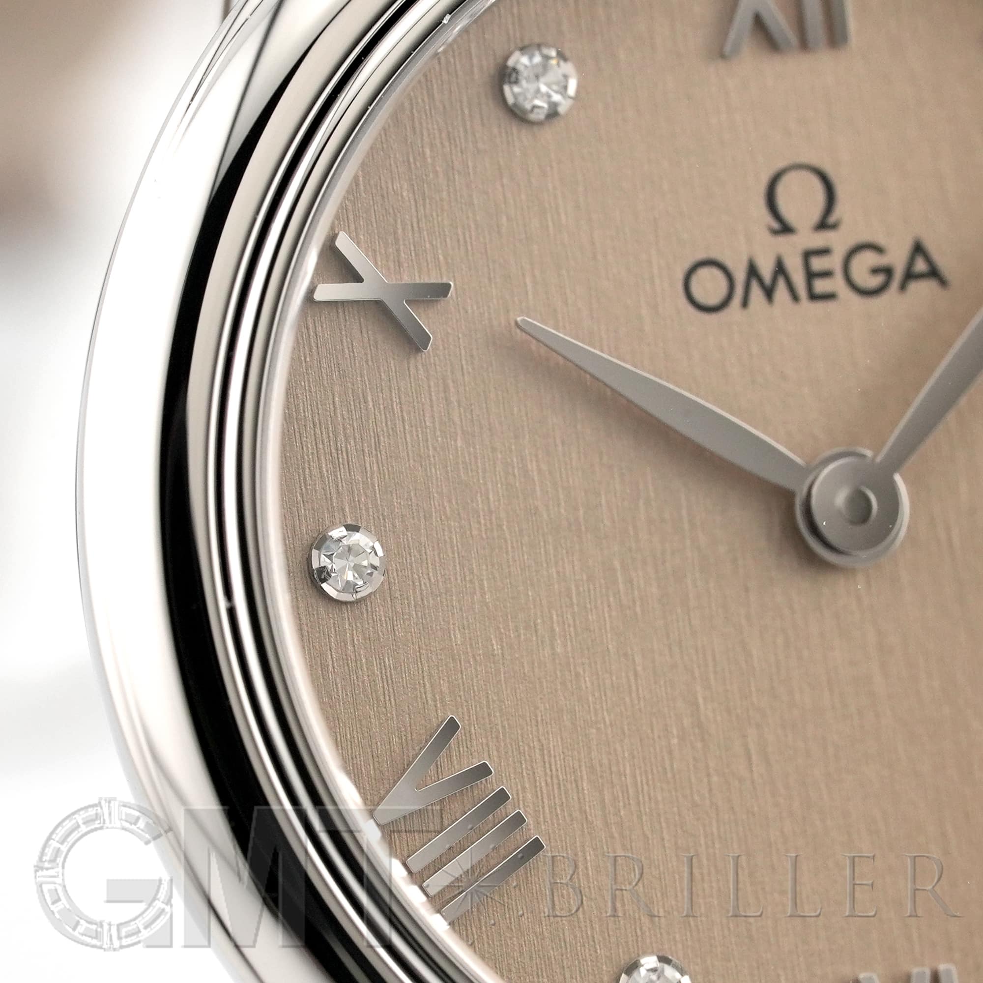 フランス語で「街角」を意味するデヴィル。オメガのドレッシーなモデルとして象徴的な存在の時計です。ランダムなバーティカルパターンが型押しされたサンブラッシュ仕上げのPVDリネンカラーの文字盤にローマ数字の間に6石のダイヤモンドがセッティングされさりげない高級感を演出しています。