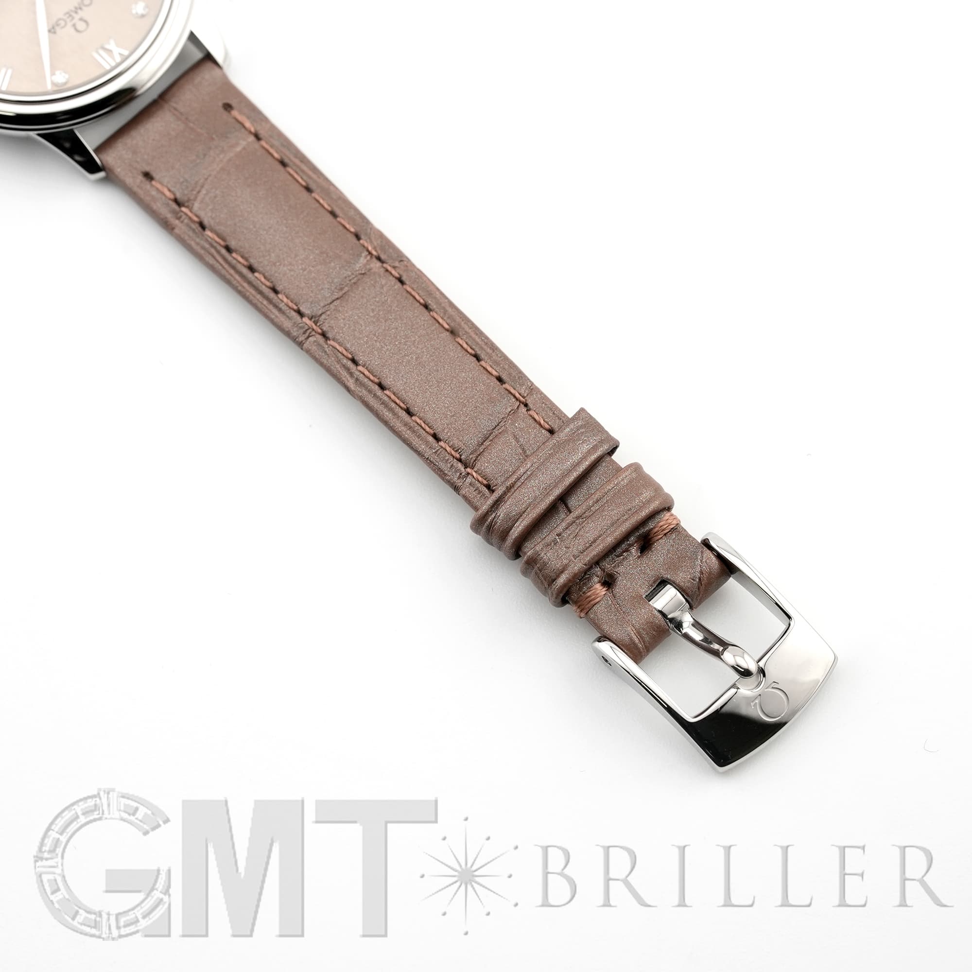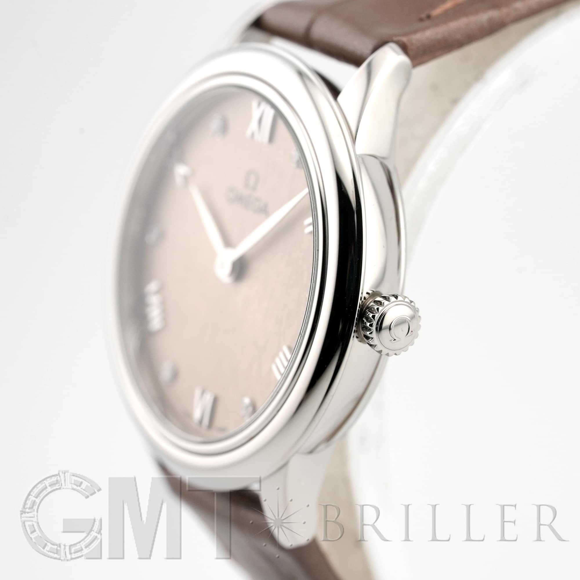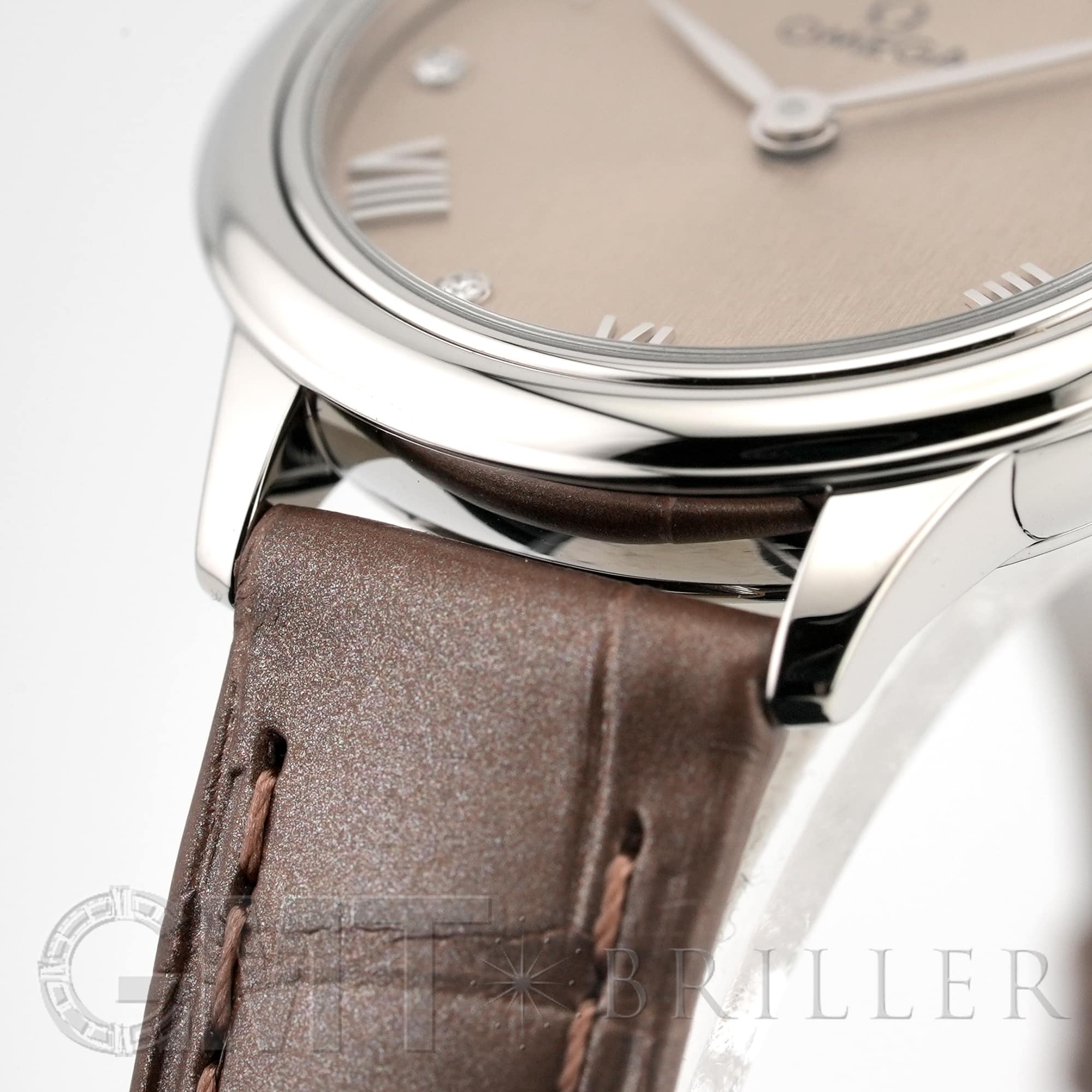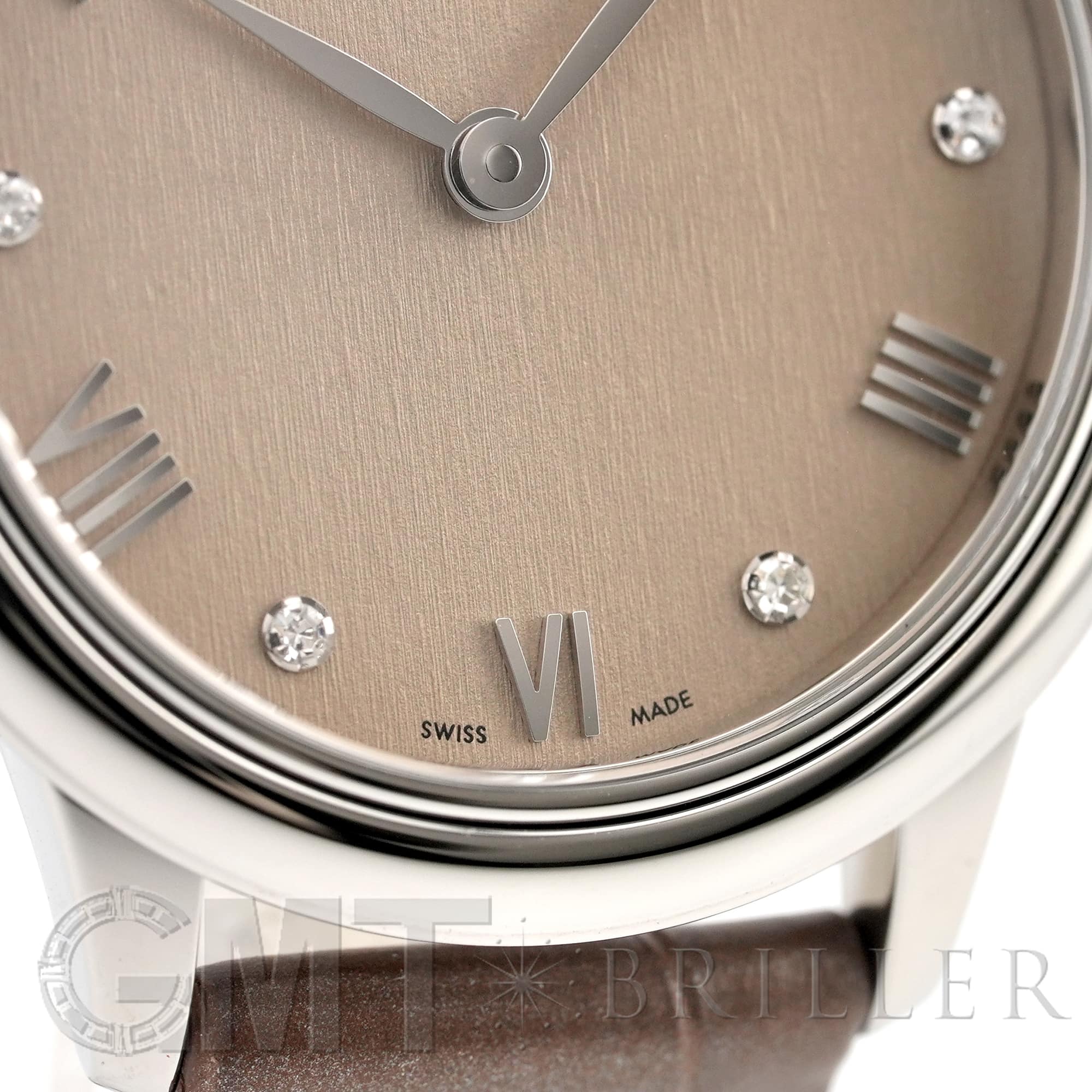 フランス語で「街角」を意味するデヴィル。オメガのドレッシーなモデルとして象徴的な存在の時計です。ランダムなバーティカルパターンが型押しされたサンブラッシュ仕上げのPVDリネンカラーの文字盤にローマ数字の間に6石のダイヤモンドがセッティングされさりげない高級感を演出しています。