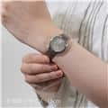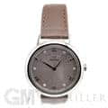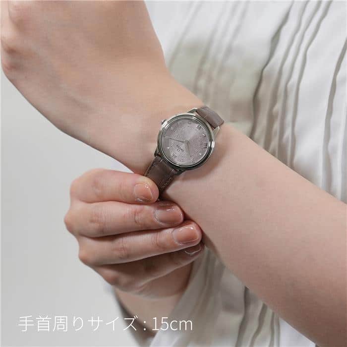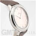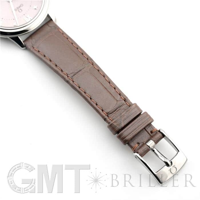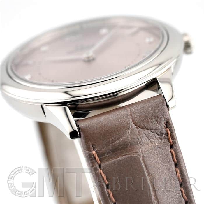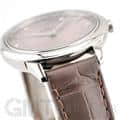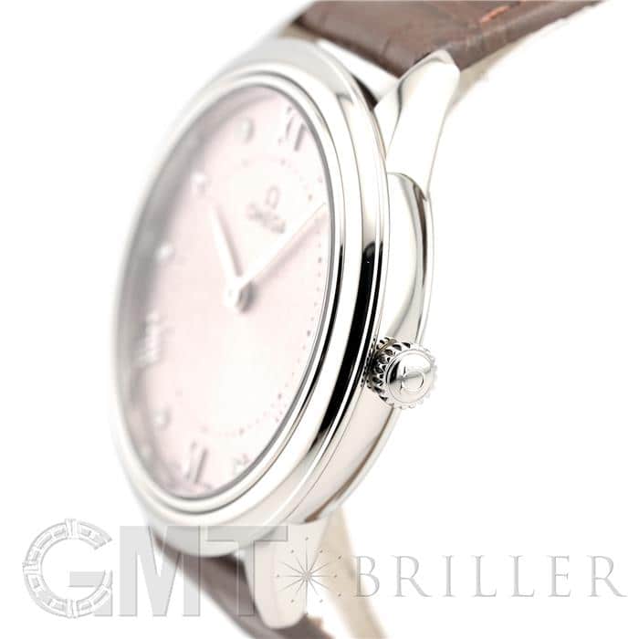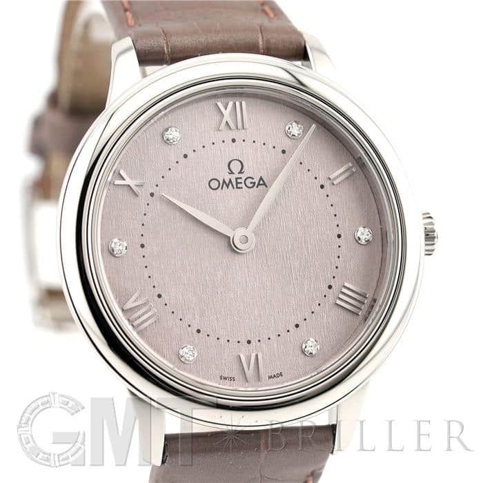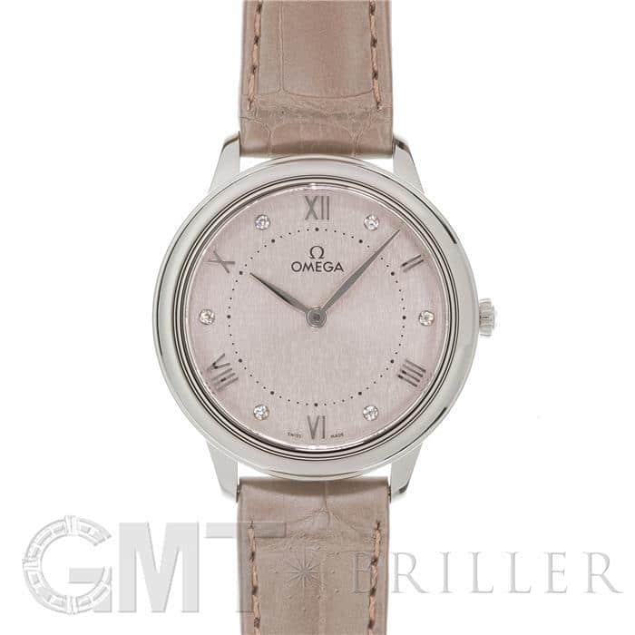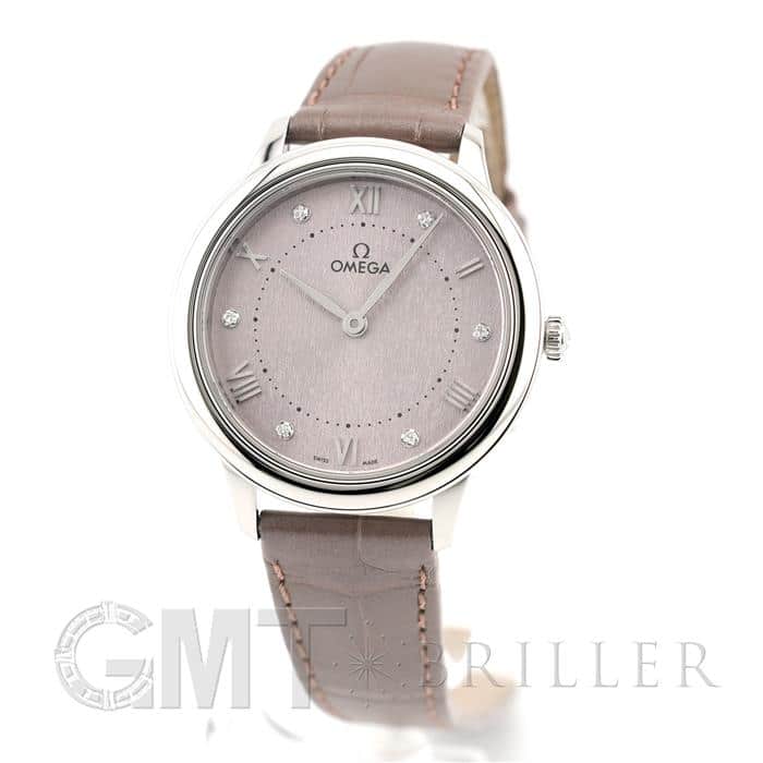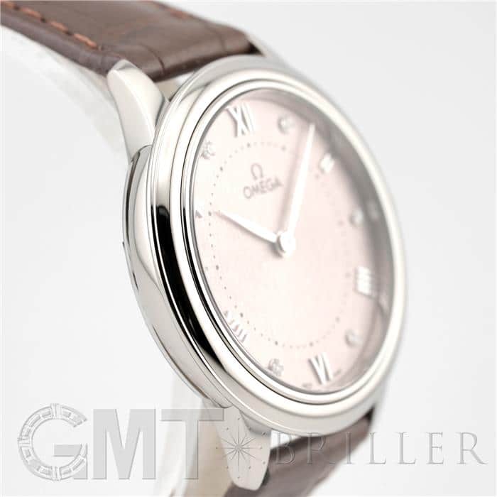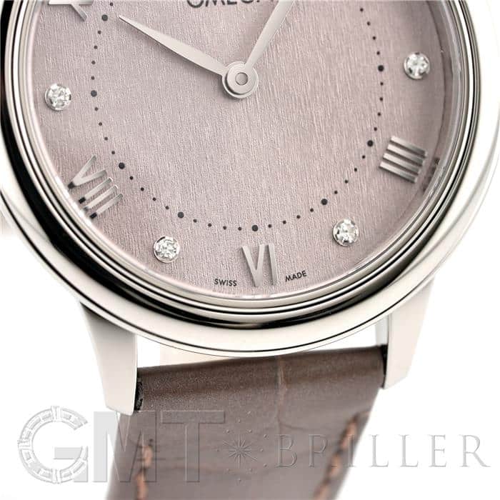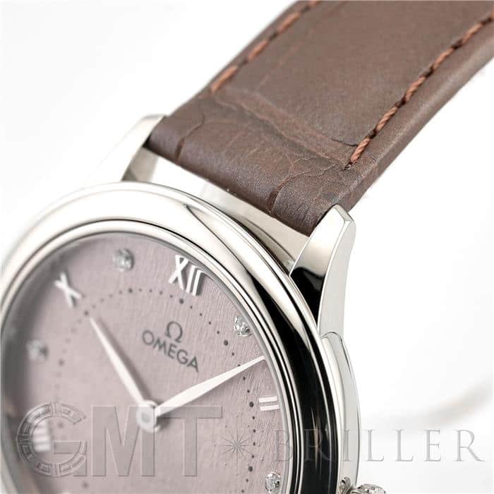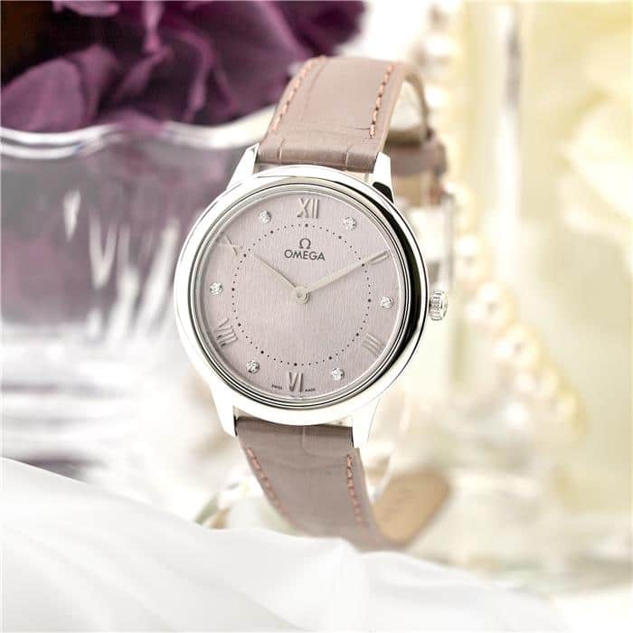 フランス語で「街角」を意味するデヴィル。オメガのドレッシーなモデルとして象徴的な存在の時計です。ランダムなバーティカルパターンが型押しされたサンブラッシュ仕上げの PVDローズシルバーの文字盤にローマ数字の間に6石のダイヤモンドがセッティングされさりげない高級感を演出しています。
