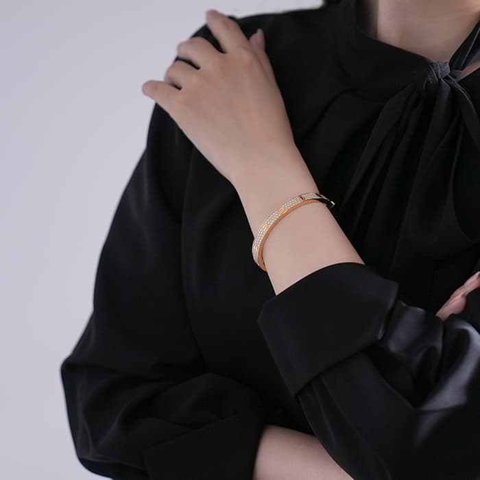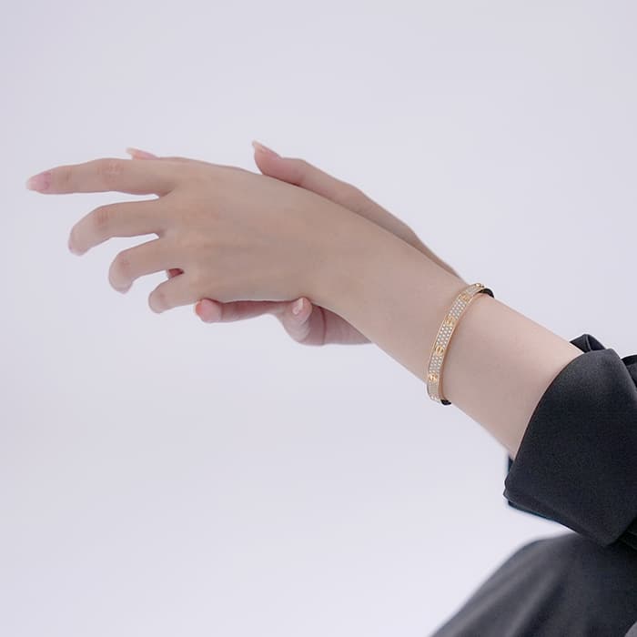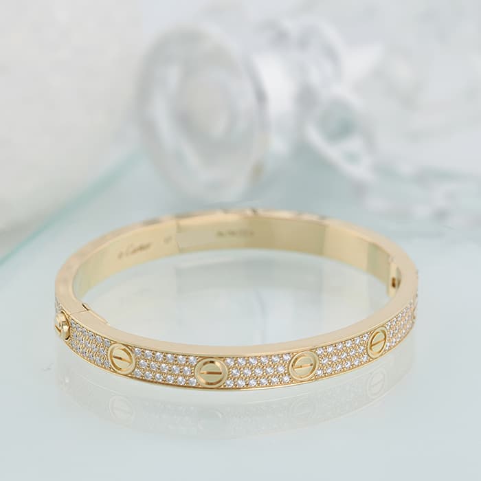 世界5大ジュエラーとして世界中から愛されるブランド「カルティエ」。カルティエが手掛ける「束縛」や「愛の絆」をテーマにして作られた「ラブコレクション」は、老若男女問わず不動の人気を博しています。こちらは華やかなイエローゴールドのブレスレットの表面に、贅沢にダイヤを配置した華やかでゴージャスなブレスレットです。煌びやかなダイヤとイエローゴールドのブレスレットが美しく飾ります。