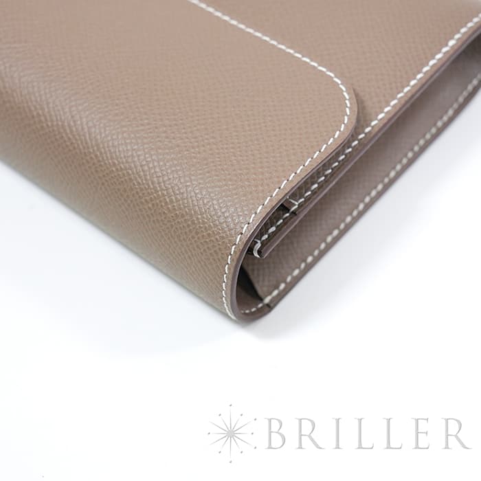 型崩れしにくくキズに強い「エプソン」素材は、滑らかな触り心地と洗練された見た目が魅力です。 グレージュカラーの「エトゥープ」は、ブラウンとグレーの中間のような柔らかい色合いで、エレガントでありながらもかわいらしさを感じる大人のカラーです。 ゴールド金具との組み合わせはより柔らかさが増し華やかな雰囲気でご着用いただけます。