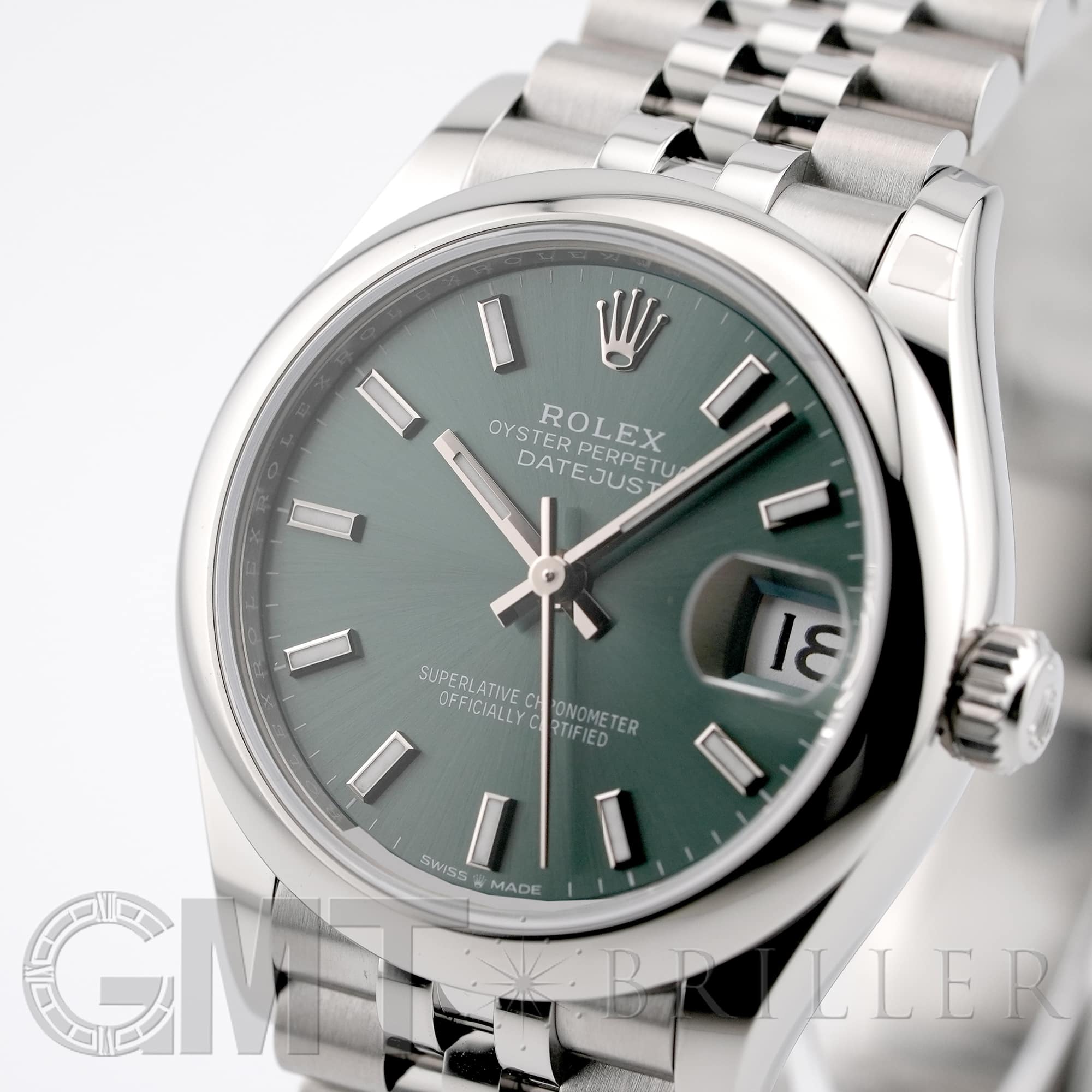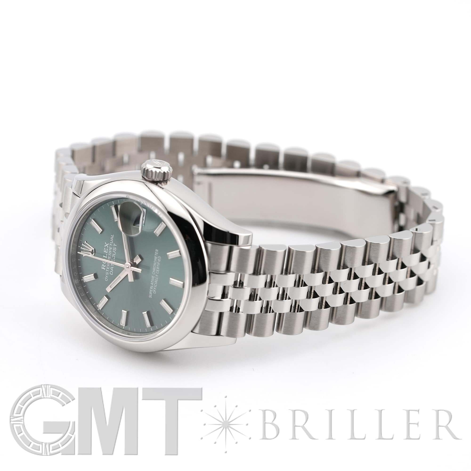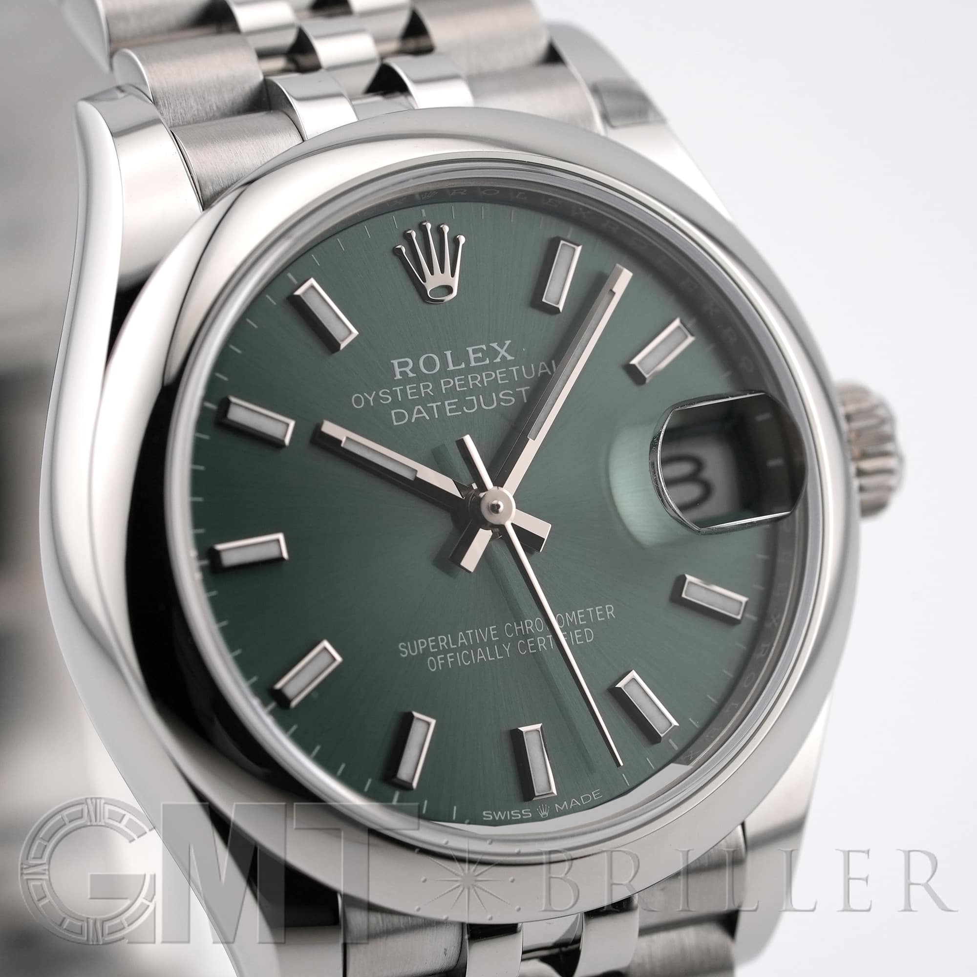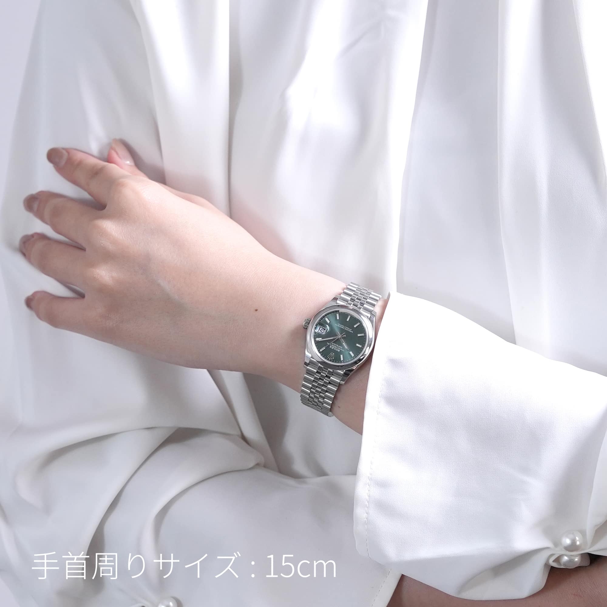 こちらのモデルは2020年に誕生した31mmケースのデイトジャスト「278240」完全自社製造の自動巻き「Cal.2236」を搭載し、カレンダー操作の禁止時間帯がないムーブメントです。落ち着いたミントグリーンのダイアルにバーインデックスとジュビリーブレスレットを組み合わせており、マニッシュな雰囲気でオフィスでも活躍するモデルです。