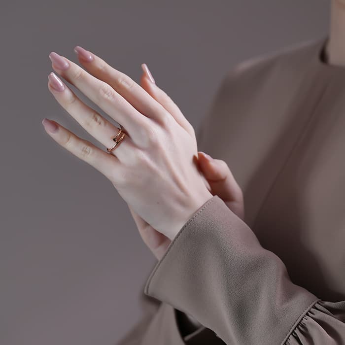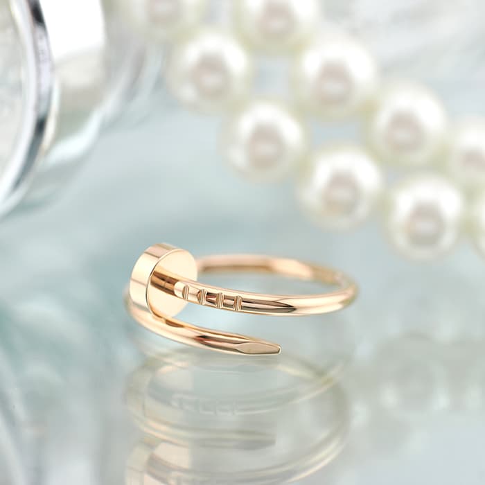 フランスで誕生し、独創的なデザインや技術力の高さから圧倒的な支持を受けるブランド「カルティエ」。 フランス語で「1本の釘」を意味する「ジュスト アン クル」は、エレガントなアクセサリーの多いカルティエにおいては異色のジュエリーです。 こちらはジュストアンクル リングではスモールモデルに分類され、リングの幅が細いため女性的な繊細さをより感じさせます。