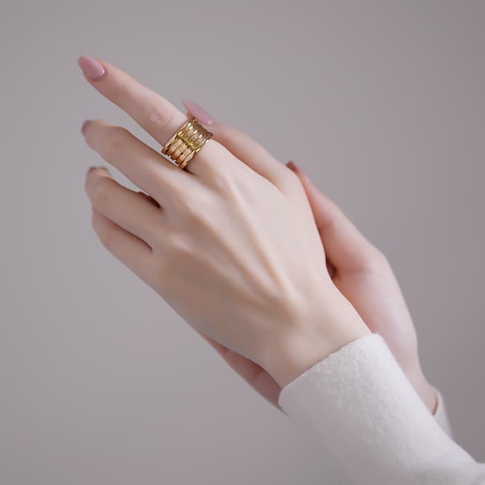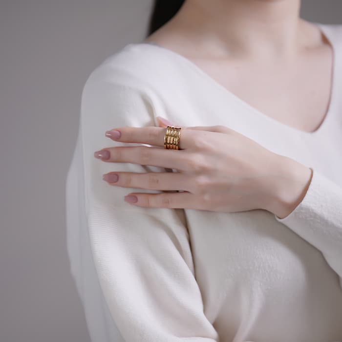 ブルガリの代表コレクション「ビー・ゼロワン」。イタリア・ローマのコロッセオからインスピレーションを受けデザインされた「ビー・ゼロワン」は、1999年に誕生して以来、ブランドのアイコンとして愛され続けています。内側のスパイラル部分が指先の動きに合わせて微細に可動する点やブルガリ独自のロゴと「ゼロ」を重ねたデザインが特徴的です。こちらのモデルは「ビー・ゼロワン」20周年を記念し作成されたモデルで、リングの内側には「XX Anniversary」の文字が刻まれています。