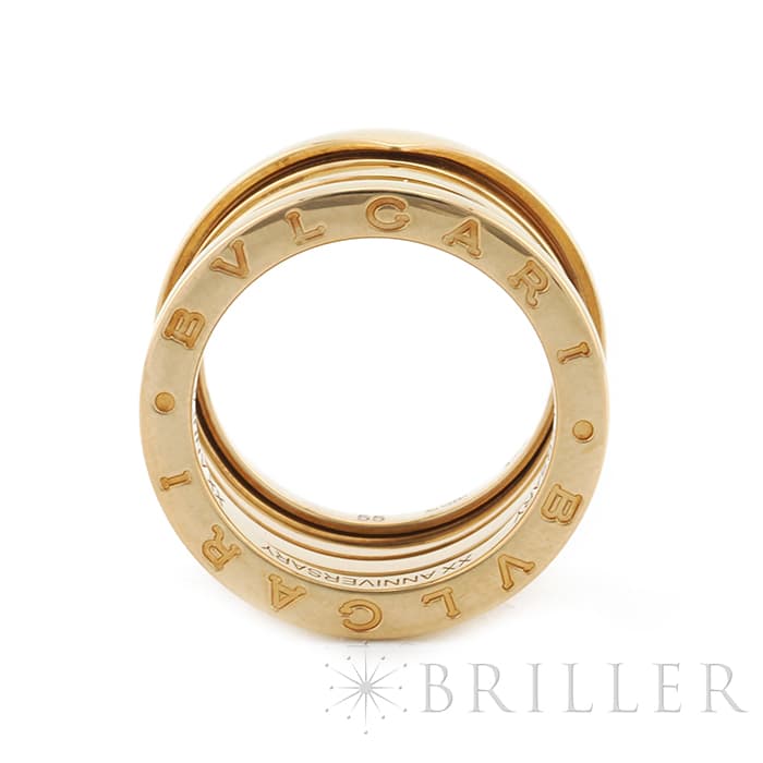 ブルガリの代表コレクション「ビー・ゼロワン」。イタリア・ローマのコロッセオからインスピレーションを受けデザインされた「ビー・ゼロワン」は、1999年に誕生して以来、ブランドのアイコンとして愛され続けています。内側のスパイラル部分が指先の動きに合わせて微細に可動する点やブルガリ独自のロゴと「ゼロ」を重ねたデザインが特徴的です。こちらのモデルは「ビー・ゼロワン」20周年を記念し作成されたモデルで、リングの内側には「XX Anniversary」の文字が刻まれています。