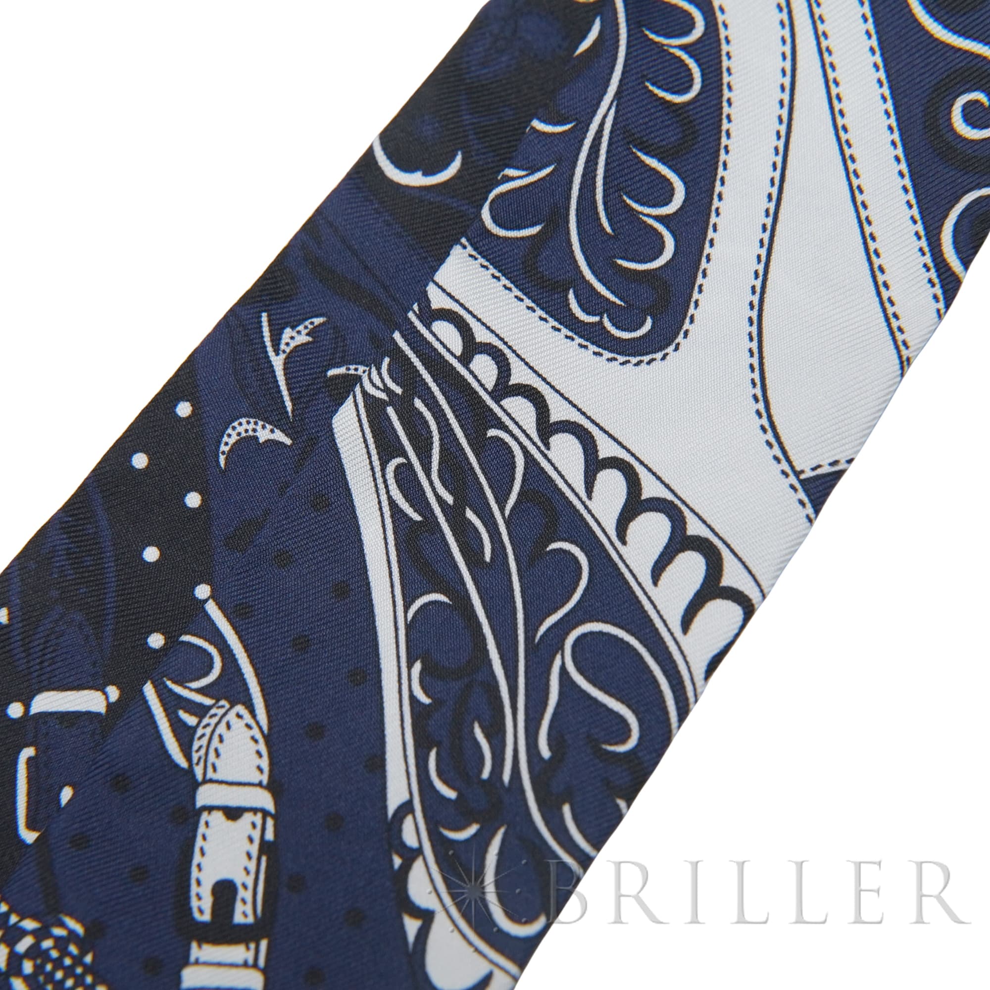 高品質なシルクにこだわり続ける、エルメスならではの上質なアクセサリー。 「ツイリー」は細長いスカーフタイプで、巻き方次第で印象が変わる万能アイテムです。 バッグのハンドルにくるりと巻けば、手元の印象が華やかに変化し、 巻き方によって柄の見え方が変わるため、一枚で複数の表情を楽しめるのも魅力。 ハンドルの擦れや汚れを防止する実用性と、コーディネートのアクセントとしての存在感を両立。ヘアバンドや首元に巻いても軽やかで、日常の装いを一段と引き立ててくれます。 本作のデザインは、アマゾンと称される馬具に施された優美な刺繍を、繊細なタッチで描き出した【アマゾンの祭典】。貴婦人のドレスを思わせるその華やかな装飾は、フェルトやレザーの質感を活かしたモチーフとして息づいています。中央にリズミカルに配された鞍を囲むように、曲線と反曲線が調和し、優雅なリズムを描くように、美しく構成されています。抽象的で魅惑的なフォルムがバンダナパターンとして昇華され、纏うたびにアートのような気品が漂います。ひと巻きで印象が華やぐ、装いのアクセントとして活躍する一本です。