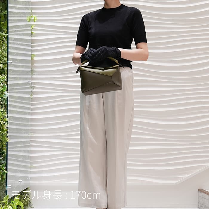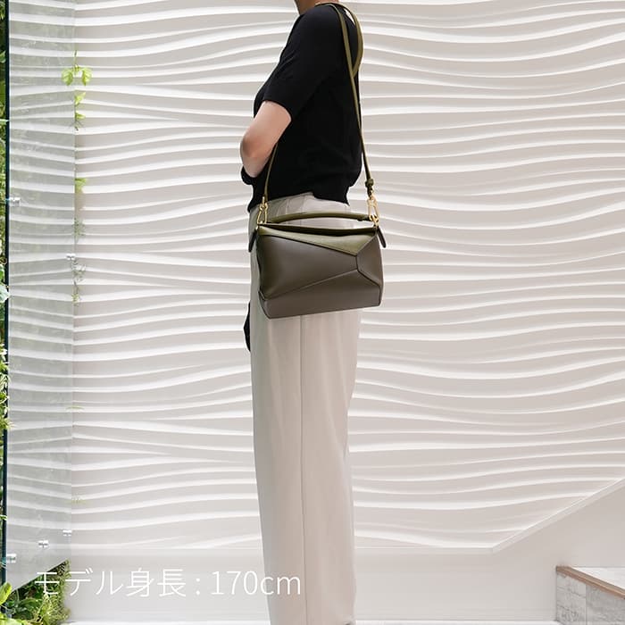 1846年にスペイン・マドリードで創業したLOEWE(ロエベ)は、卓越したレザークラフトを誇るラグジュアリーブランドです。王室御用達の歴史を持ち、伝統技術と現代的な感性を融合させた洗練されたデザインが魅力。ブランドを象徴する“パズル”シリーズは、2015年にクリエイティブ・ディレクターのジョナサン・アンダーソンによって発表された、LOEWEの新時代を象徴するシリーズです。通常のパズルシリーズと異なり、「エッジ」ではレザーパネルの縁を重ねて縫い合わせた仕様になっており、陰影と立体感が一層際立つディテールが魅力。手に取るたび、光の角度で表情が変わる“持つアートピース”として存在感を放ちます。立体的なフォルムと構築的なラインが美しいスモールサイズ。落ち着きのあるオリーブグリーンが、大人のニュアンスを引き立てます。しなやかで上質なクラシックカーフスキンを使用し、使うほどに手になじむ質感も魅力。ショルダー・クロスボディ・ハンドシーンを問わず自由な持ち方が楽しめ、コンパクトながら日常使いに十分な収納力も備えています。