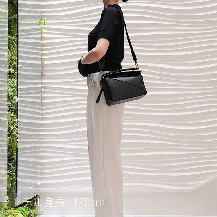 LOEWEは1846年にマドリードで創業した、卓越したレザークラフトで知られるラグジュアリーブランドです。2015年にジョナサン・アンダーソンが発表した“パズル”シリーズは、折り紙のような立体構造が特徴。本モデルは上質なカーフスキンを使用したブラックカラーで、控えめな艶と滑らかな質感が魅力です。ショルダー・クロスボディ・ハンドの3WAY仕様を備え、機能性とデザイン性を兼ね備えた一品です。