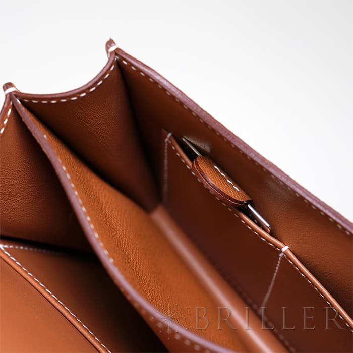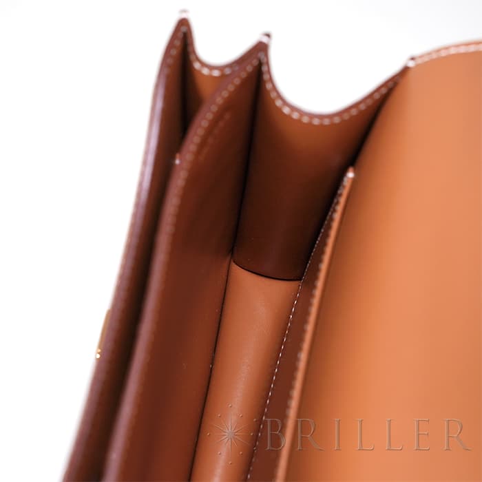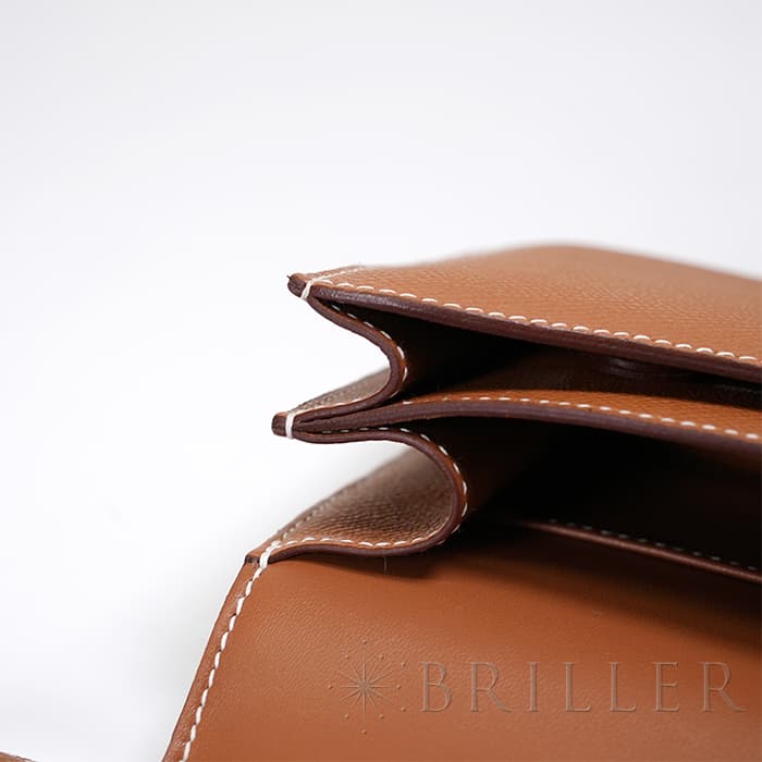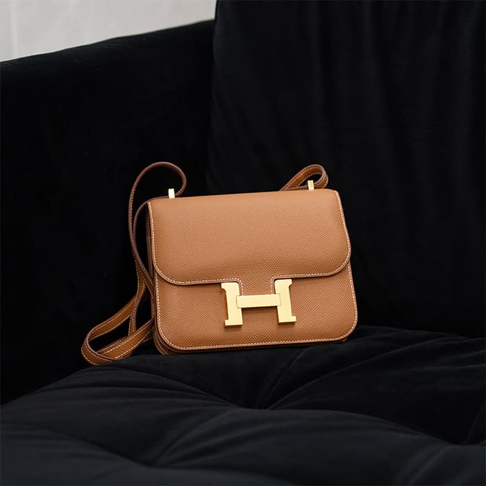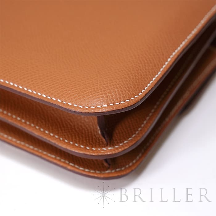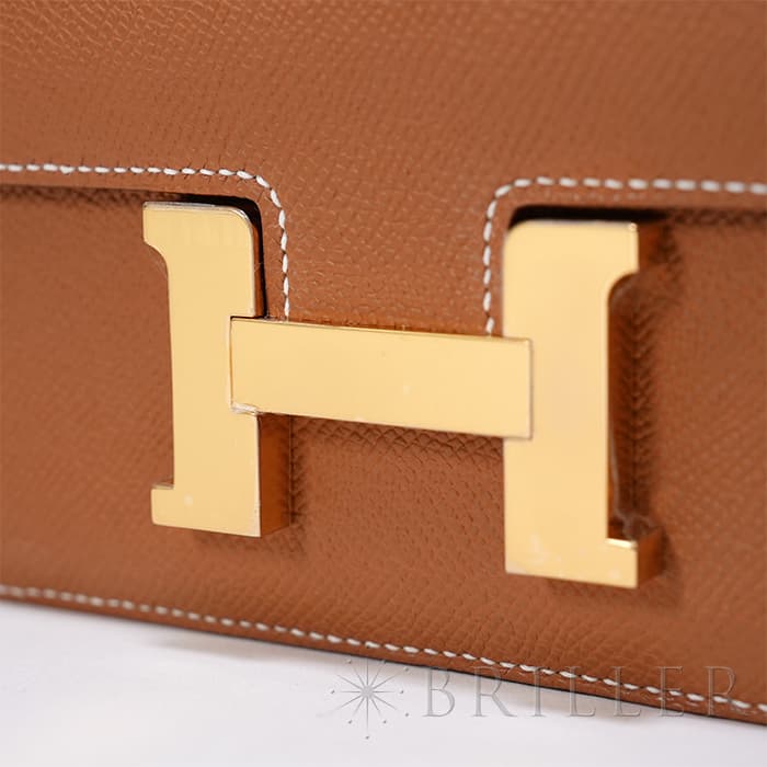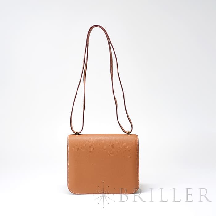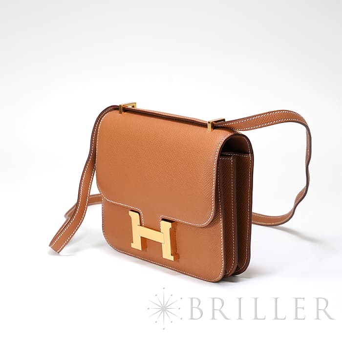 小ぶりで愛らしいフォルムが魅力の「コンスタンス3 ミニ」。 こちらは現行の新型モデルで、内側のオープンポケットが従来の2つから3つに増えており、付属品として便利なミラーも付属しています。 ショルダーストラップは1連にすれば斜め掛けが可能で、2連にすれば小脇に抱えてエレガントな装いにも対応。 カジュアルからフォーマルまで、シーンを問わずお使いいただける人気のサイズ感です。 アイコニックな「H」バックルが印象的で、スタイリングのアクセントとしても存在感を放ちます。 素材には、細かい型押しでキズや汚れが目立ちにくい「エプソン」を採用。 日常使いに嬉しい実用性と、上質さを兼ね備えた仕上がりです。 カラーはエルメスの定番人気色「ゴールド」。 温かみのあるブラウン系トーンが、どんな装いにも品よくなじみます。 さらにゴールド金具が華やかさを添え、ラグジュアリー感も際立ちます。 機能性とデザイン性を両立した、永く愛せる一品です。