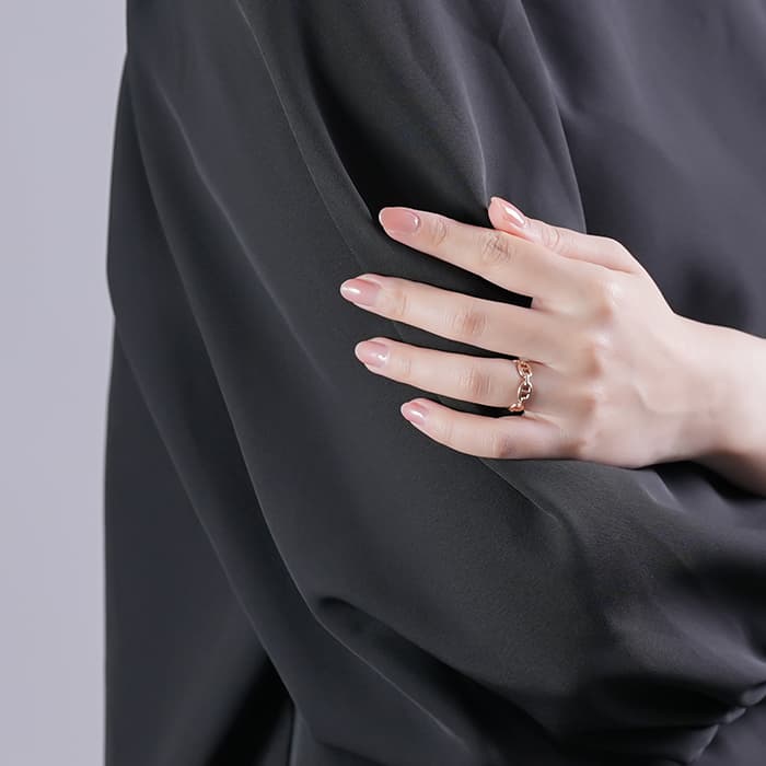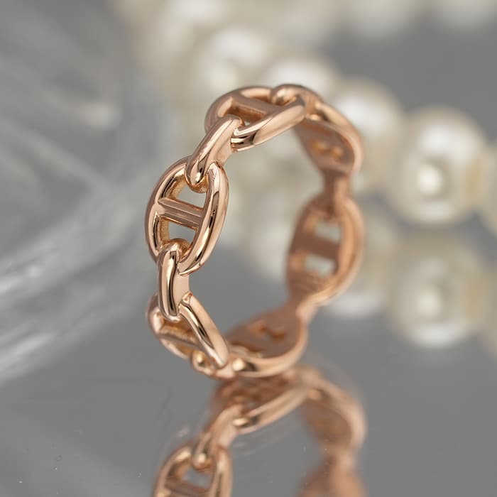 船の錨をモチーフにした、エルメスを象徴するようなデザインのシェーヌダンクル。1937年、ロベール・デュマはノルマンディの海岸を、船を眺めながら散策していた際に船を岸につなぎとめる錨の鎖が視線を捉えたことをきっかけにして、エルメスを代表する《シェーヌ・ダンクル》が誕生しました。男女兼用でお使いいただけるリングです。ピンクゴールは肌なじみが良く、デイリー使用にも大変おすすめです。