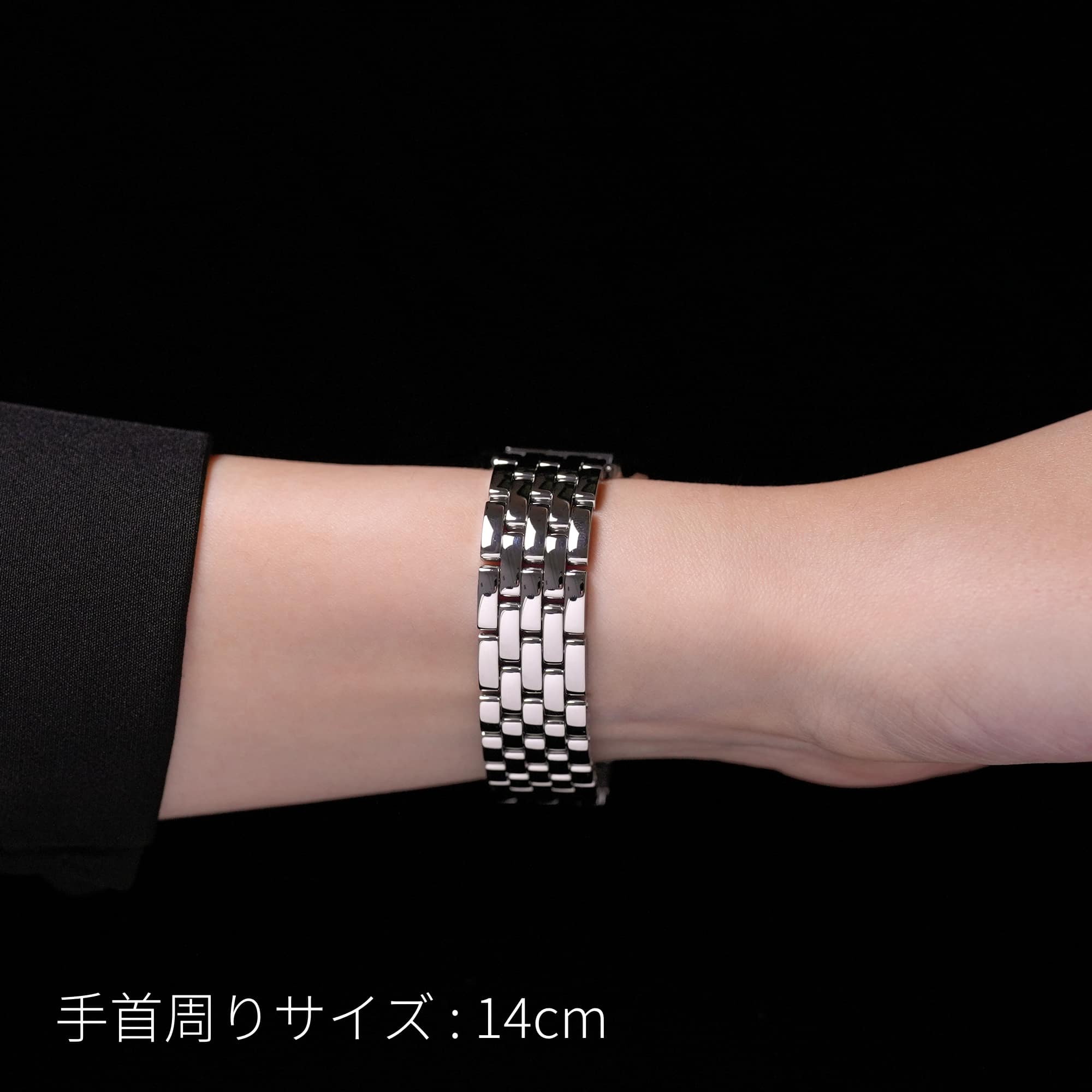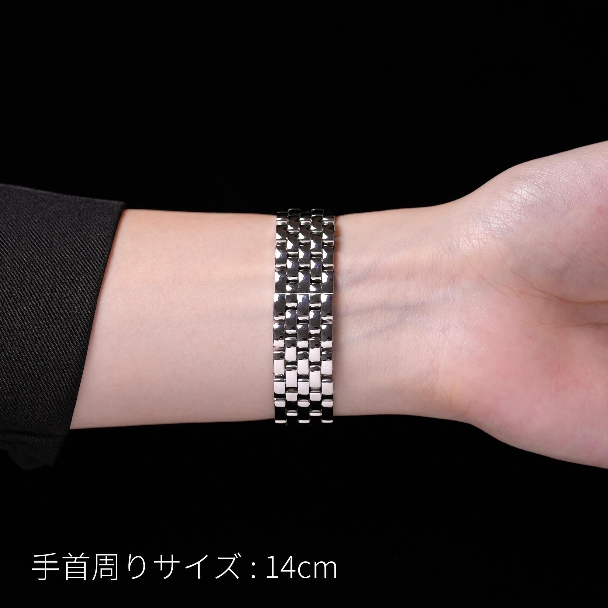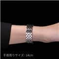 メジャーを手首に巻きつけて、手首のサイズを測ります。 サイズを確認して、ピッタリのサイズをお知らせください。お知らせいただいたサイズを元に、「標準的な余裕」がでるようにブレスレットサイズを調整いたします。 写真の場合、手首周りは「14cm」となります。