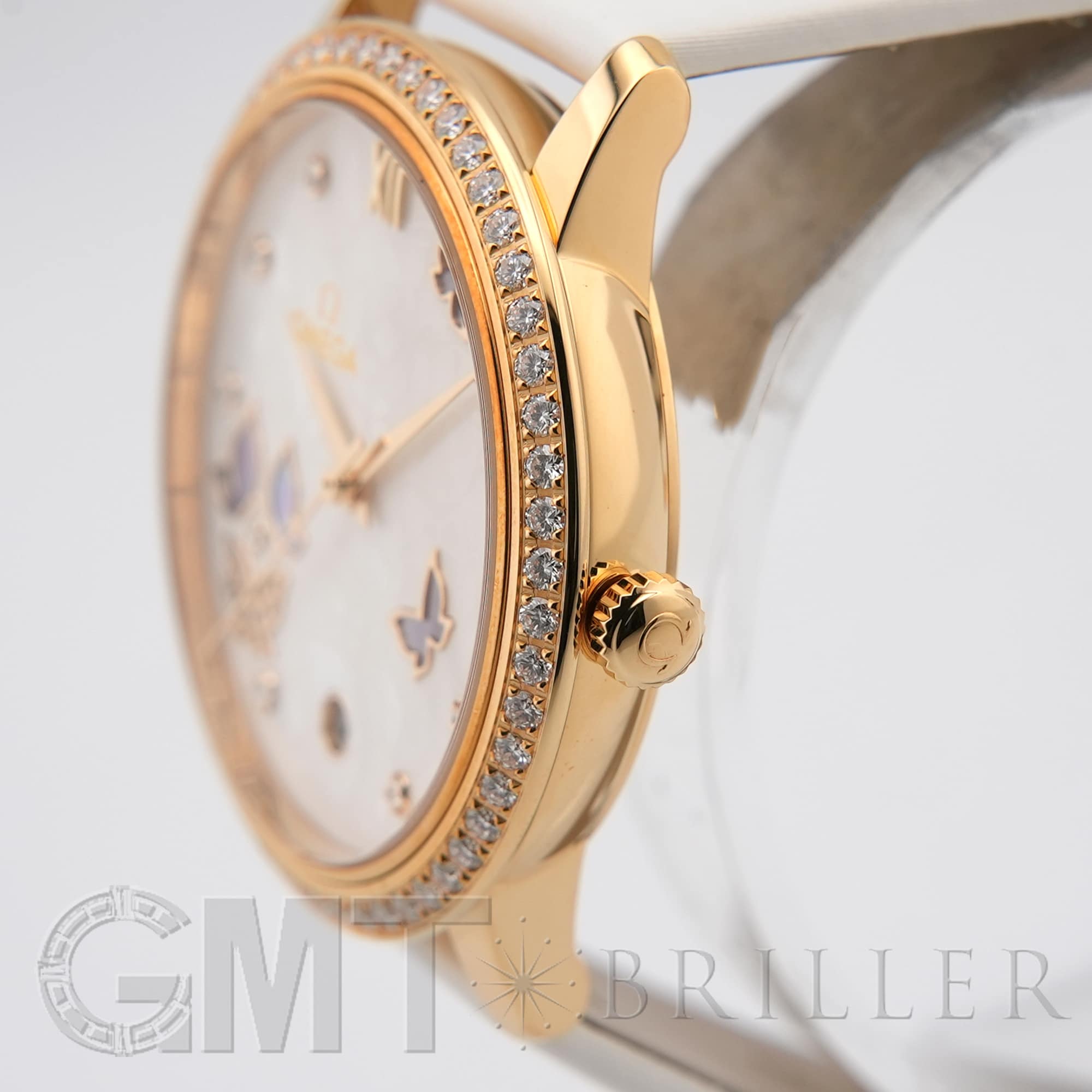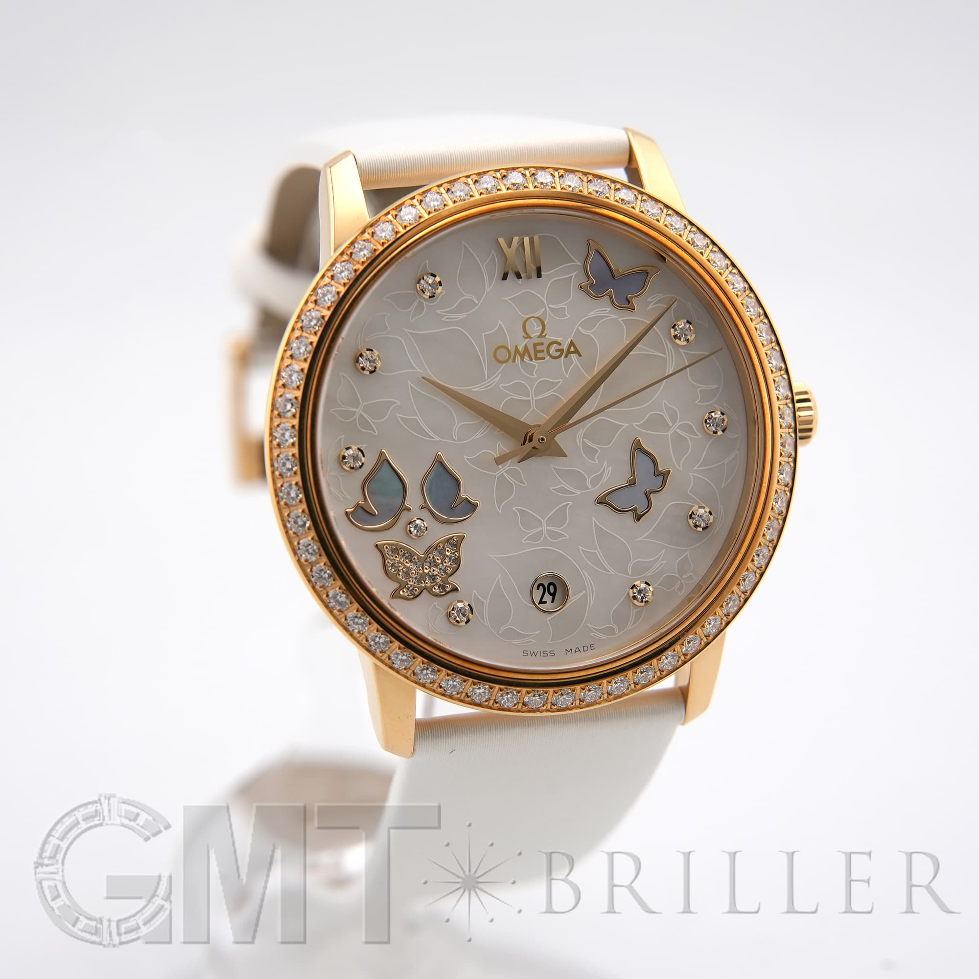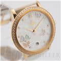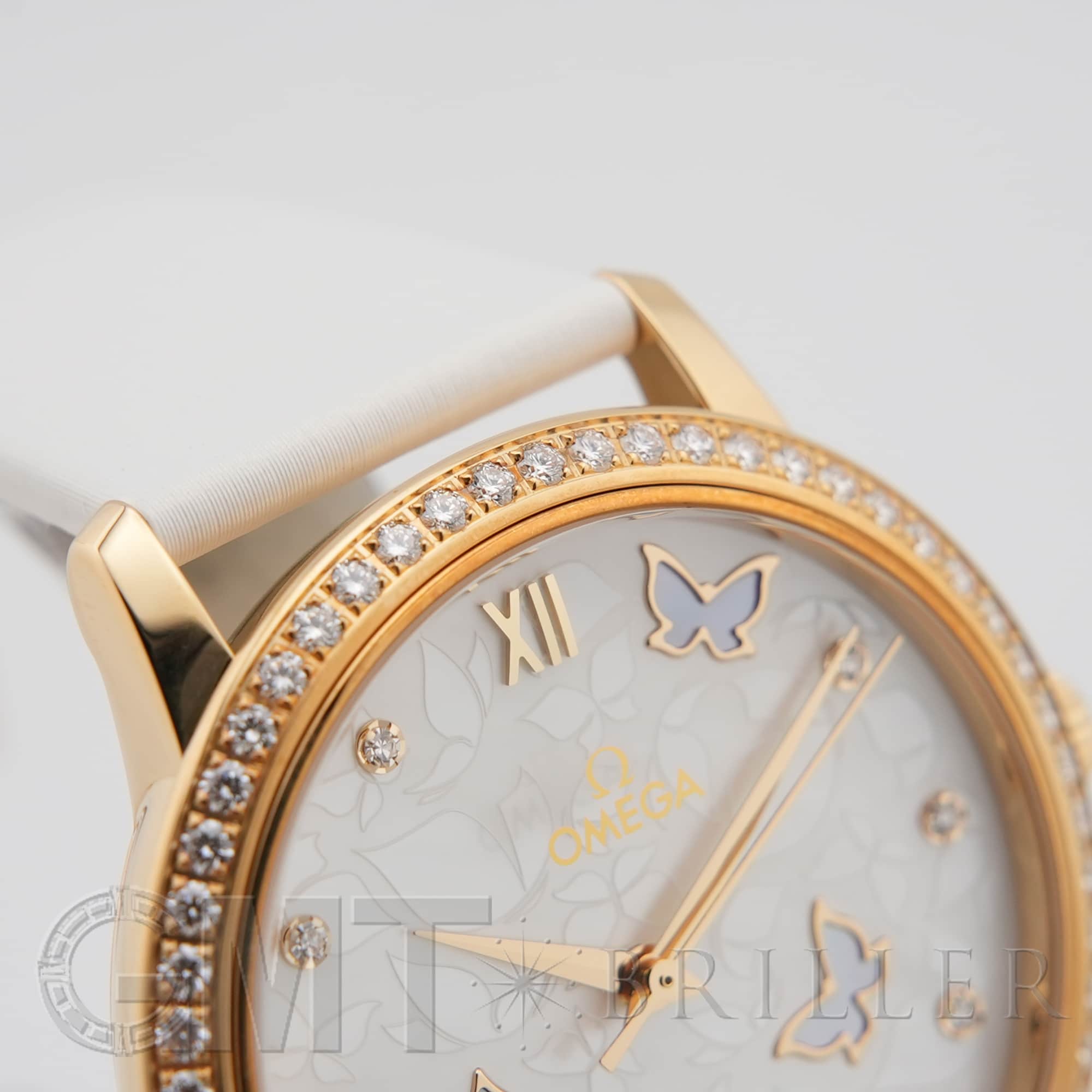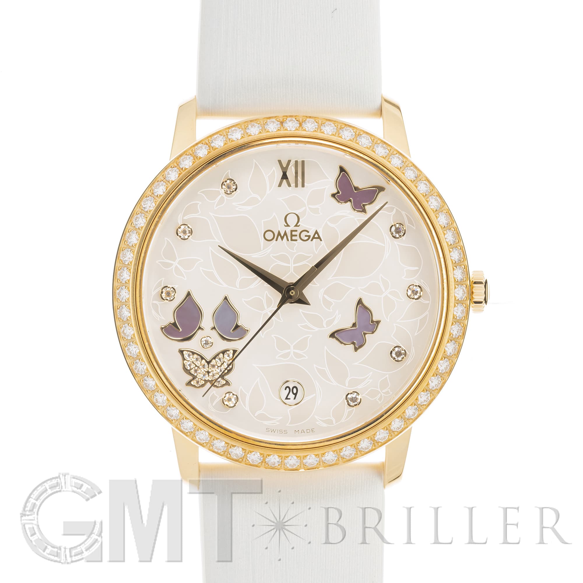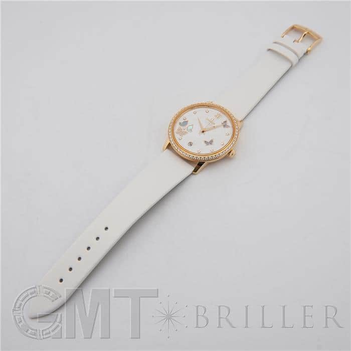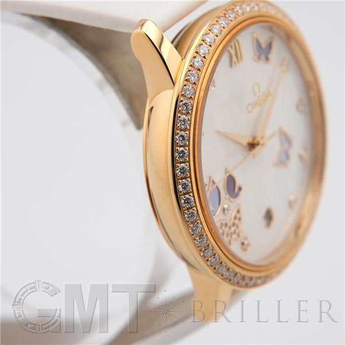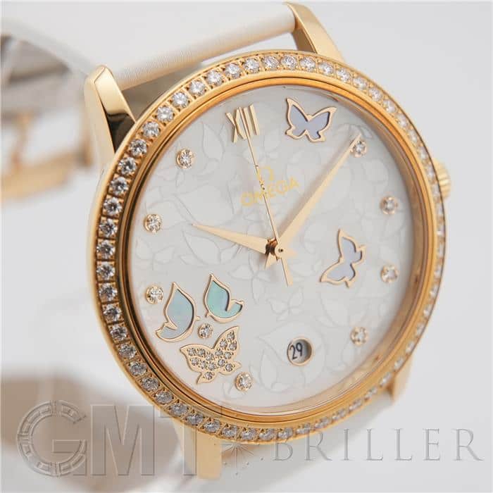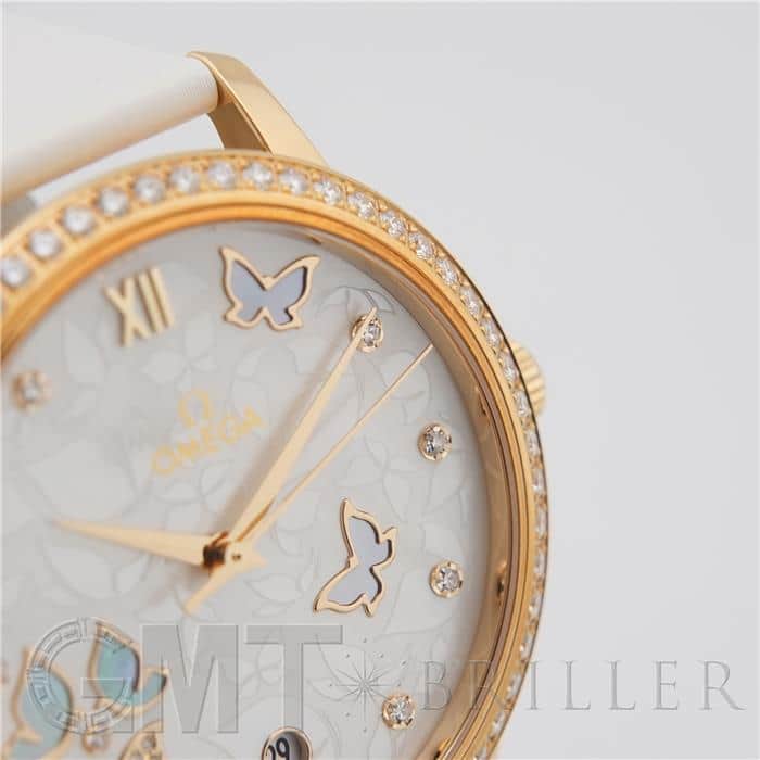 オメガ デヴィル プレステージ 424.57.37.20.55.001 OMEGAオメガの伝統が息づく「デ・ヴィル プレステージ」より、息を呑むほど優美なバタフライのデザイン。イエローゴールドのケースと、ベゼルを埋め尽くすダイヤモンドが、圧倒的なオーラで手元を照らします。ホワイト・マザーオブパールの文字盤には、ダイヤモンドと共に繊細な蝶の舞が描かれ、見るたびに心がときめく幻想的な仕上がりに。ホワイトのサテンレザーストラップがゴールドの華やかさを上品に引き立てます。時を刻むジュエリーとして、貴女の日常を最も輝く瞬間へと変える傑作です。オメガ 時計の買取り・下取りも行っておりますので、お気軽にご相談ください。
