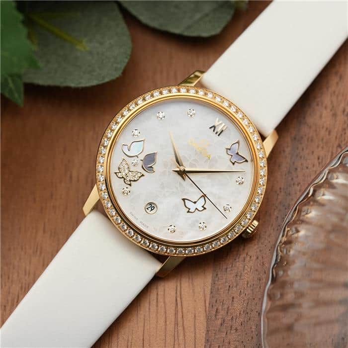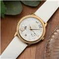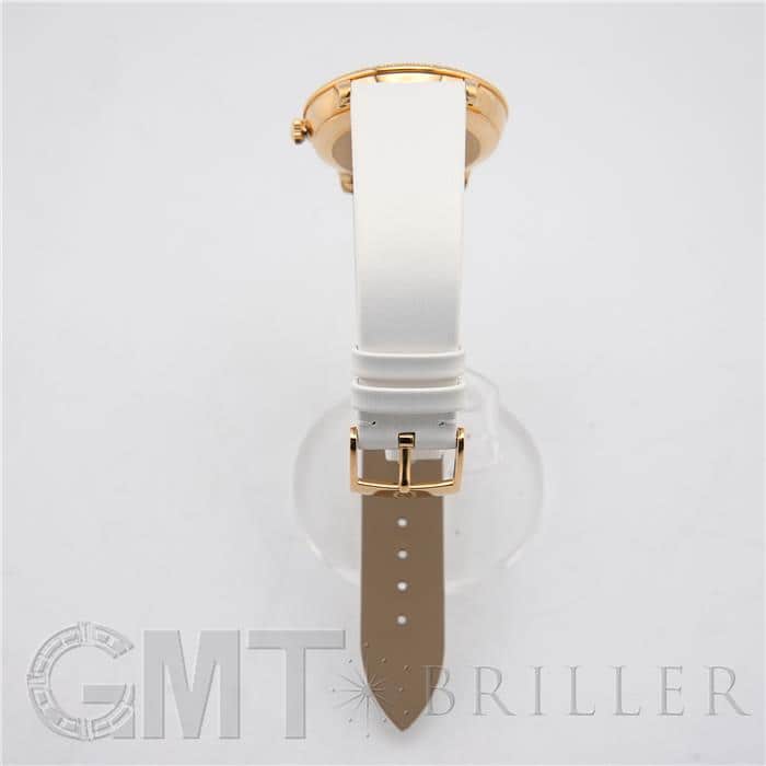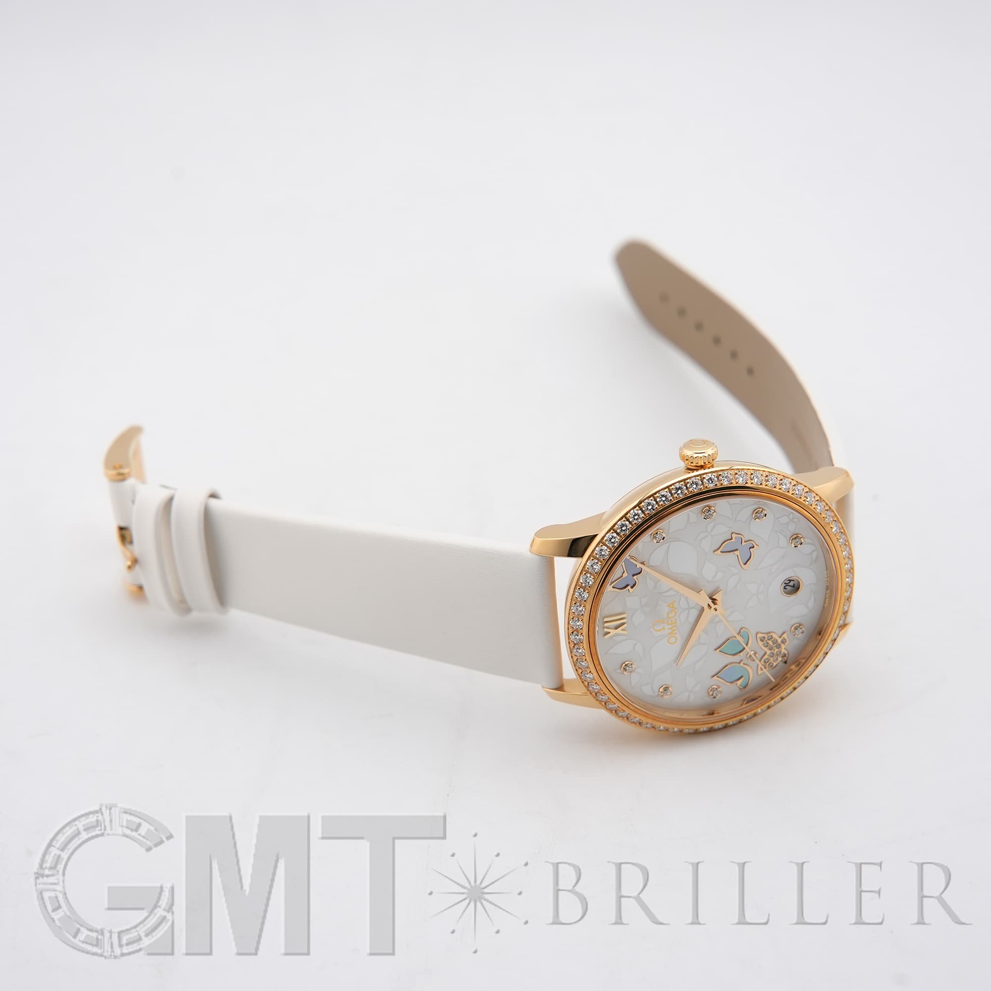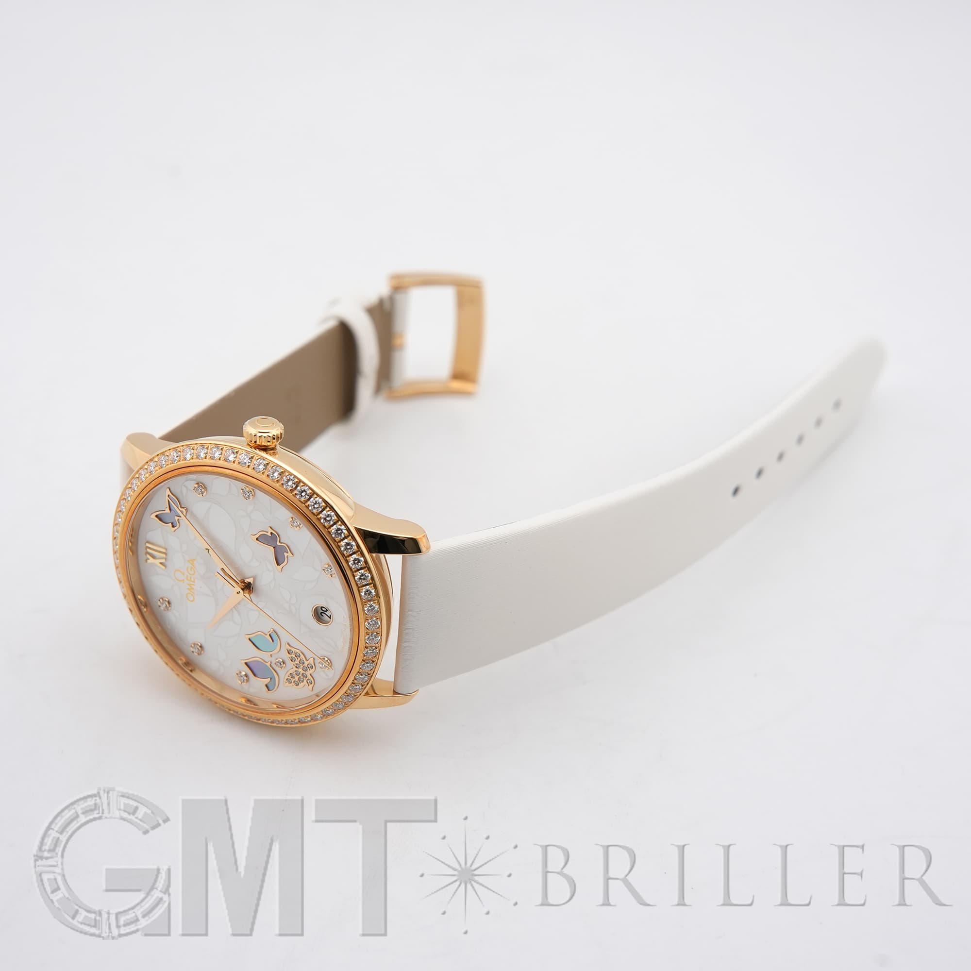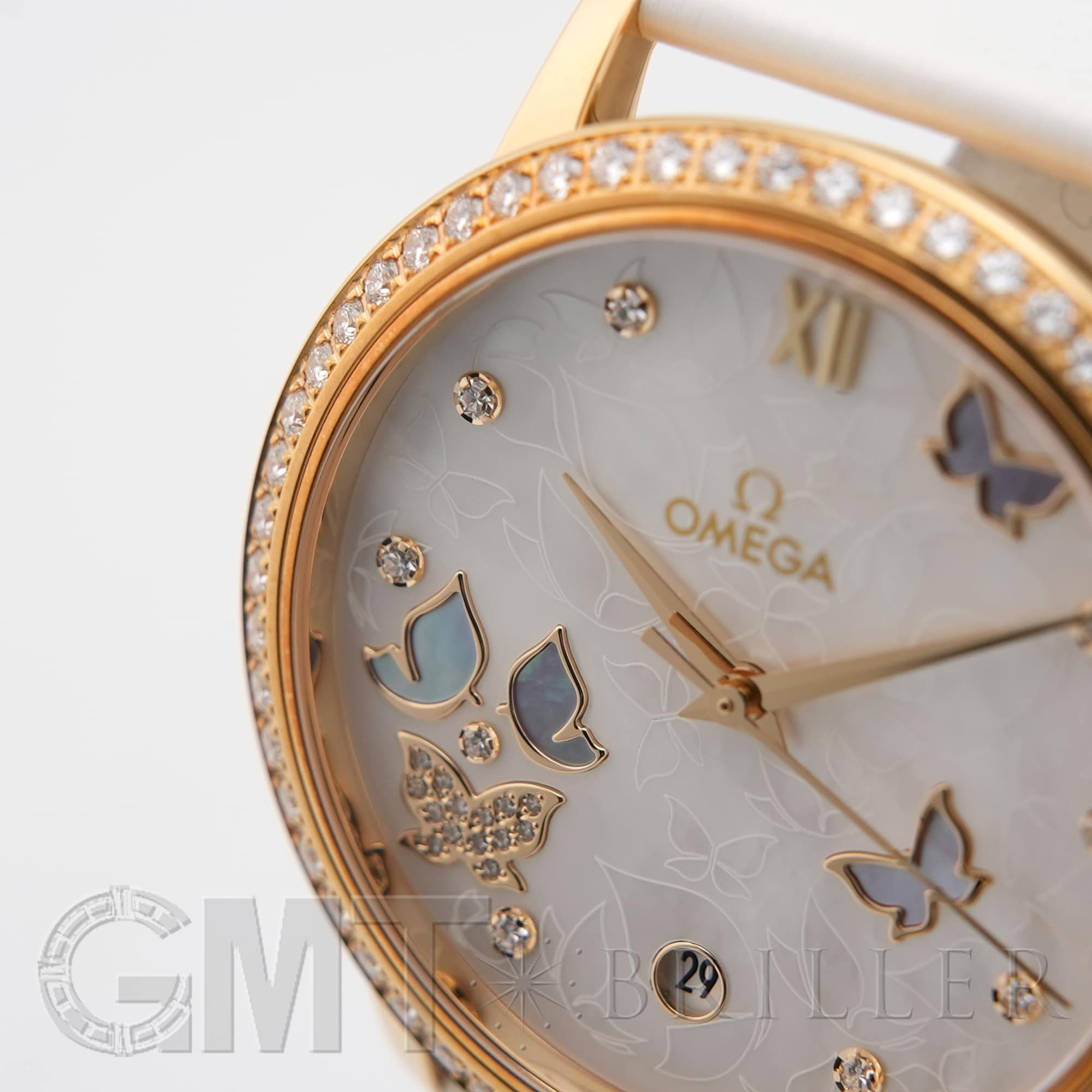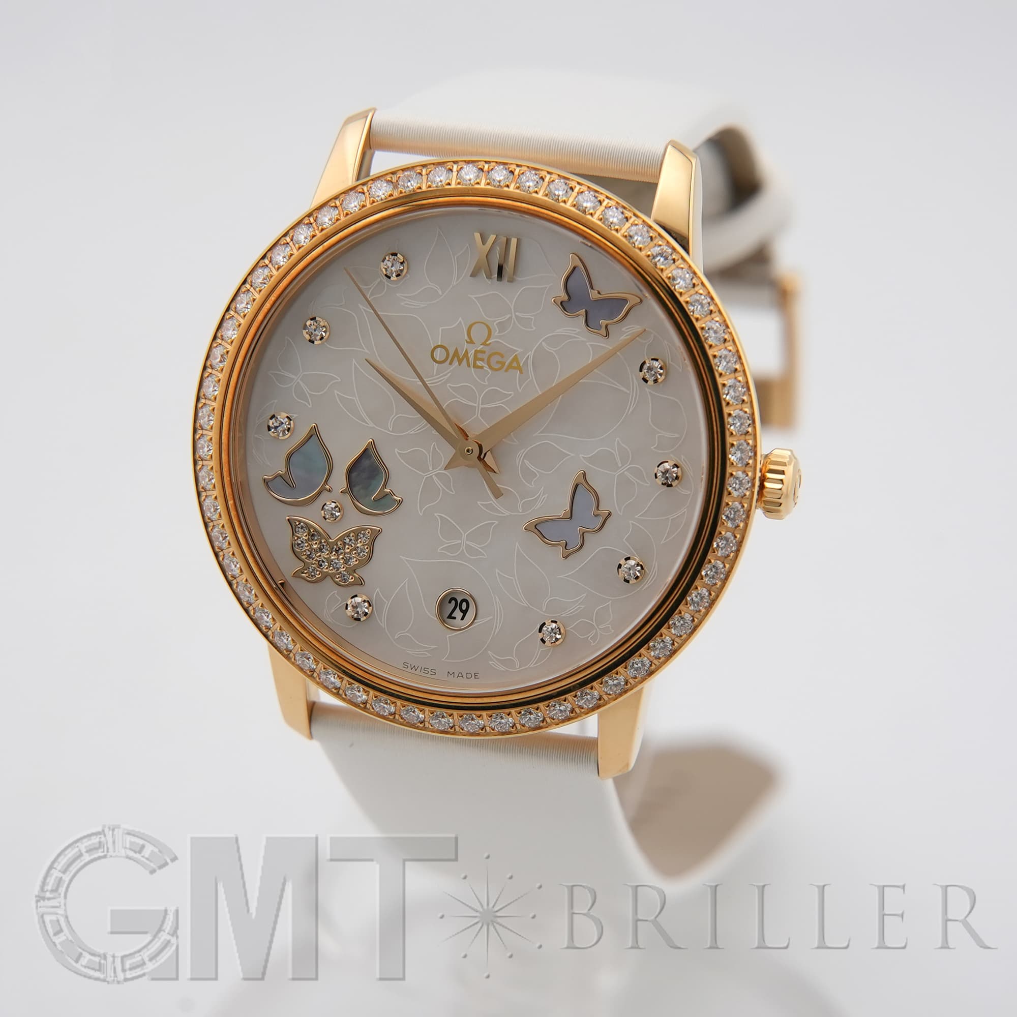 オメガ デヴィル プレステージ 424.57.37.20.55.001 OMEGAオメガの伝統が息づく「デ・ヴィル プレステージ」より、息を呑むほど優美なバタフライのデザイン。イエローゴールドのケースと、ベゼルを埋め尽くすダイヤモンドが、圧倒的なオーラで手元を照らします。ホワイト・マザーオブパールの文字盤には、ダイヤモンドと共に繊細な蝶の舞が描かれ、見るたびに心がときめく幻想的な仕上がりに。ホワイトのサテンレザーストラップがゴールドの華やかさを上品に引き立てます。時を刻むジュエリーとして、貴女の日常を最も輝く瞬間へと変える傑作です。オメガ 時計の買取り・下取りも行っておりますので、お気軽にご相談ください。