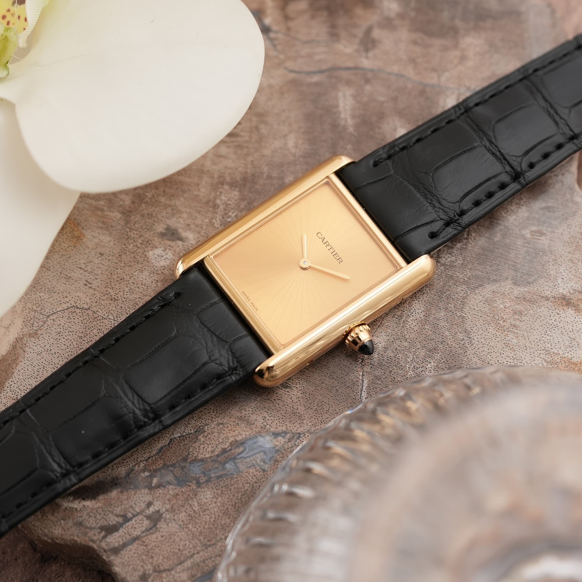 1847年、フランス・パリで創業した世界的ジュエラー「カルティエ」。 時計史においても数々の名作を生み出してきた、格式あるメゾンです。 「タンク ルイ カルティエ」は、創業者ルイ・カルティエ自身がデザインし、 実際に愛用していたことでも知られる、タンクコレクションの原点ともいえるモデル。 こちらはその意匠を受け継ぐミディアムモデルで、丸みを帯びた長方形ケースと一体化したブレードが、柔らかく洗練された印象を演出します。 時代を超えて愛されるクラシカルな美しさの中に、さりげない華やかさと成熟した気品が漂い、時代を超えて愛され続ける、永久的な美しさを体現した一本です。