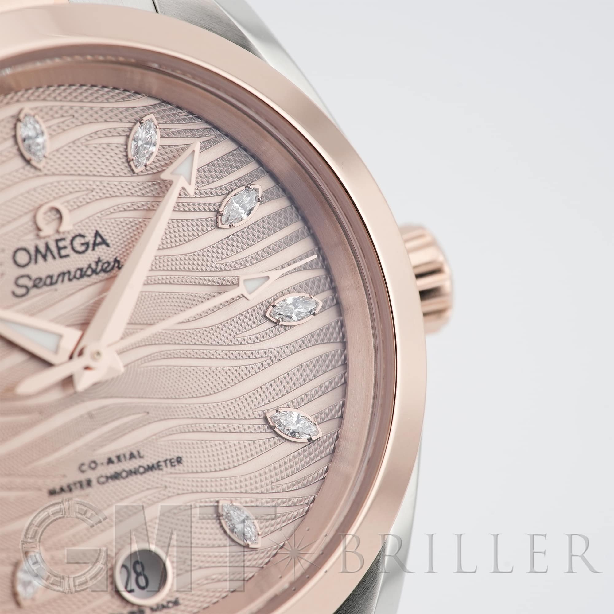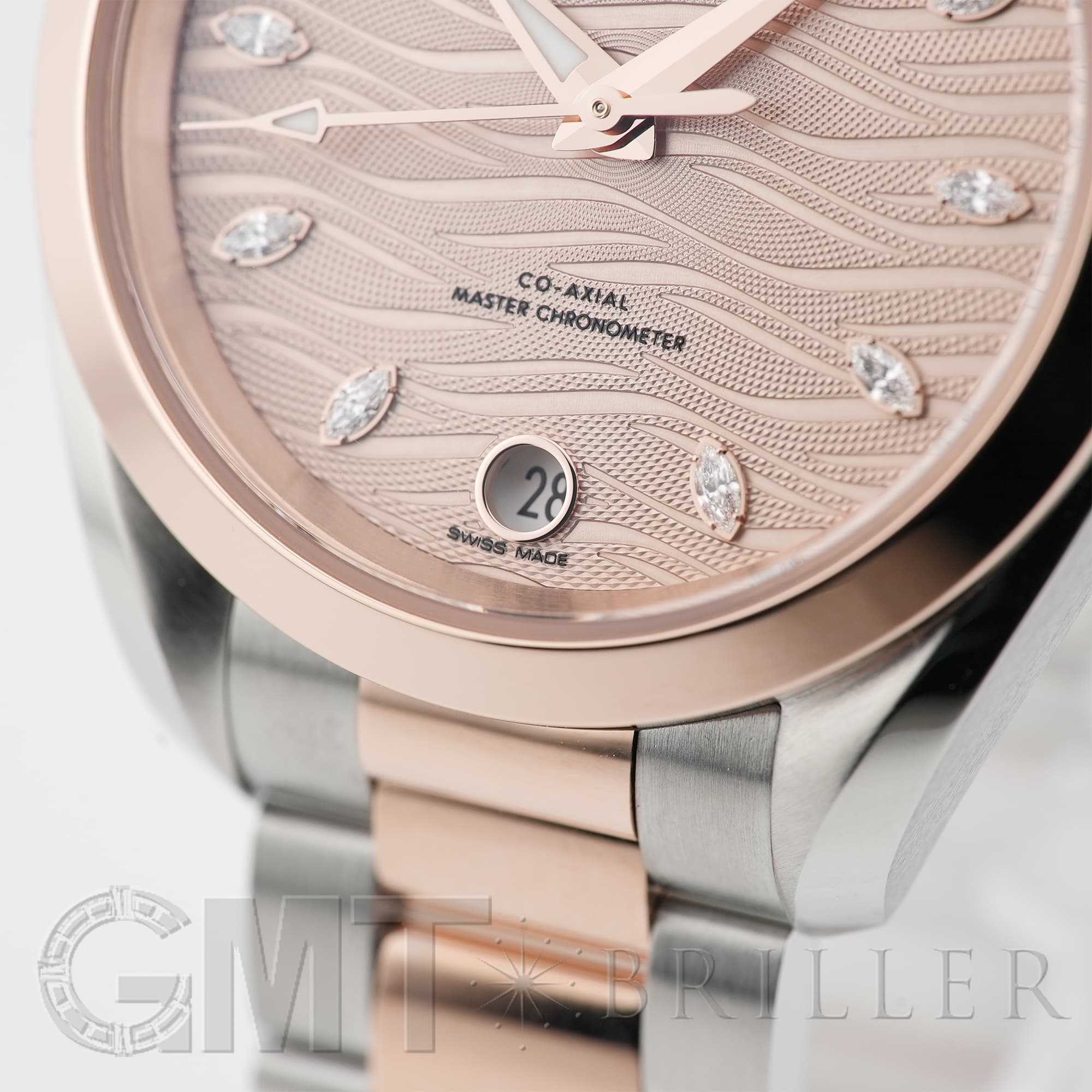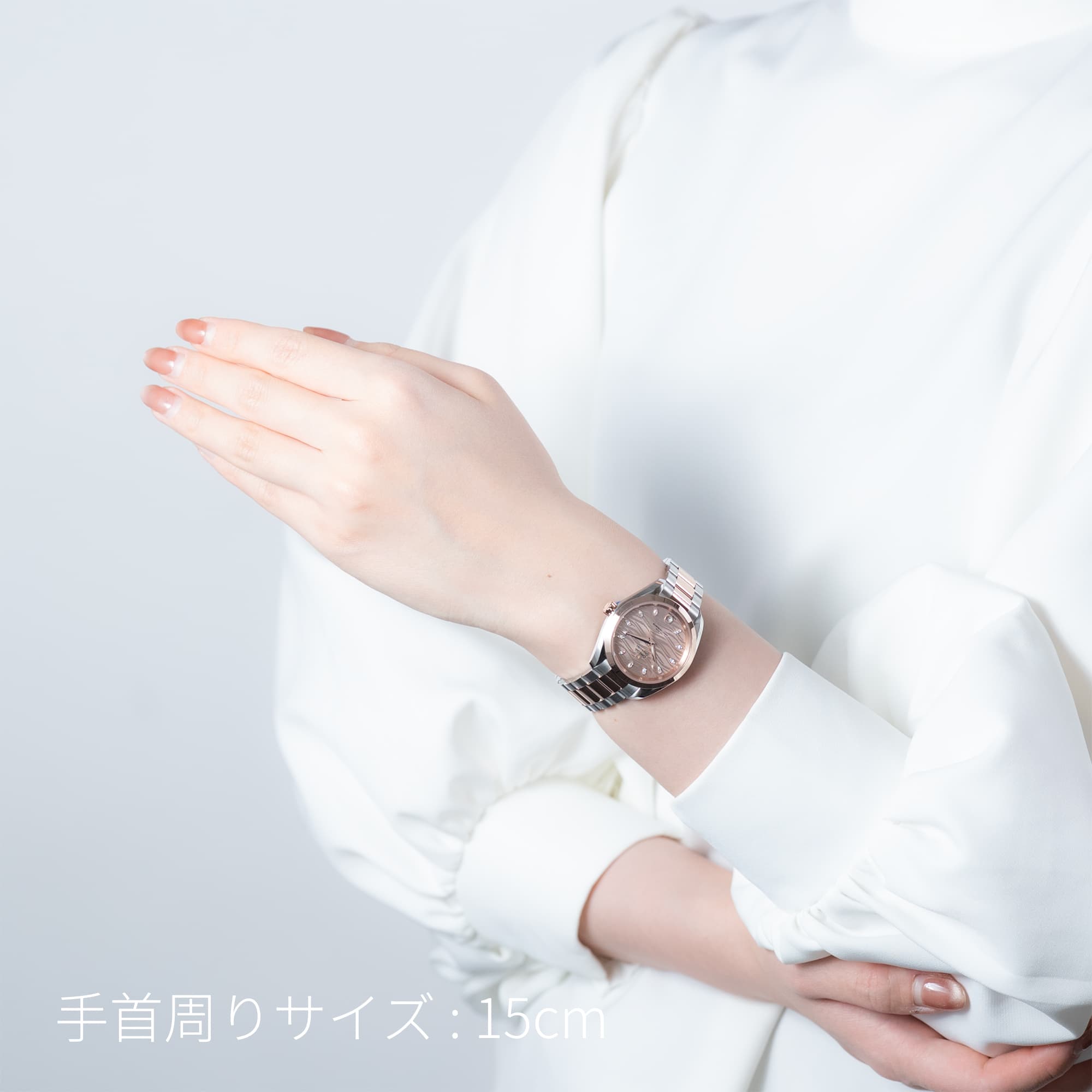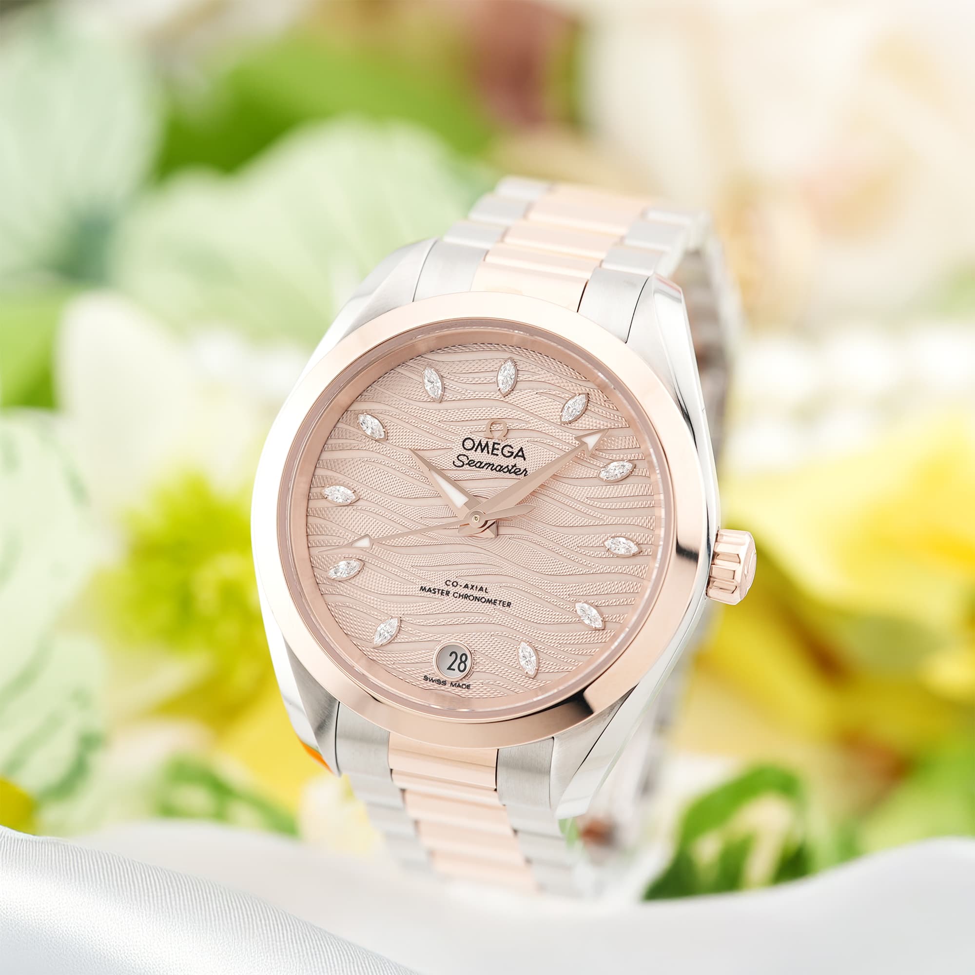 海と都会のエレガンスを融合したレディース向け「アクアテラ」。グレーを基調に、ほのかなローズニュアンスも感じられる柔らかな色調のダイアル。立体的なウェーブパターンダイアルが光を受けて繊細な陰影を描き、華やかな存在感。11石のダイヤモンドインデックスと洗練された針が視認性とジュエリー性を両立。34mmケースとSS×セドナゴールドのコンビ仕様が女性の手元に程よい高級感を演出します。しなやかなブレスレットは手首に自然に沿い、日常使いでも快適な装着感。Cal.8800 マスター クロノメーター搭載、約55時間パワーリザーブと15,000ガウス耐磁性能を確保。150m防水とサファイアクリスタル風防、日付表示を備えた実用性の高い一本。エレガントからデイリーまで幅広く活躍する、上品さと機能性を兼ね備えたモデルです。