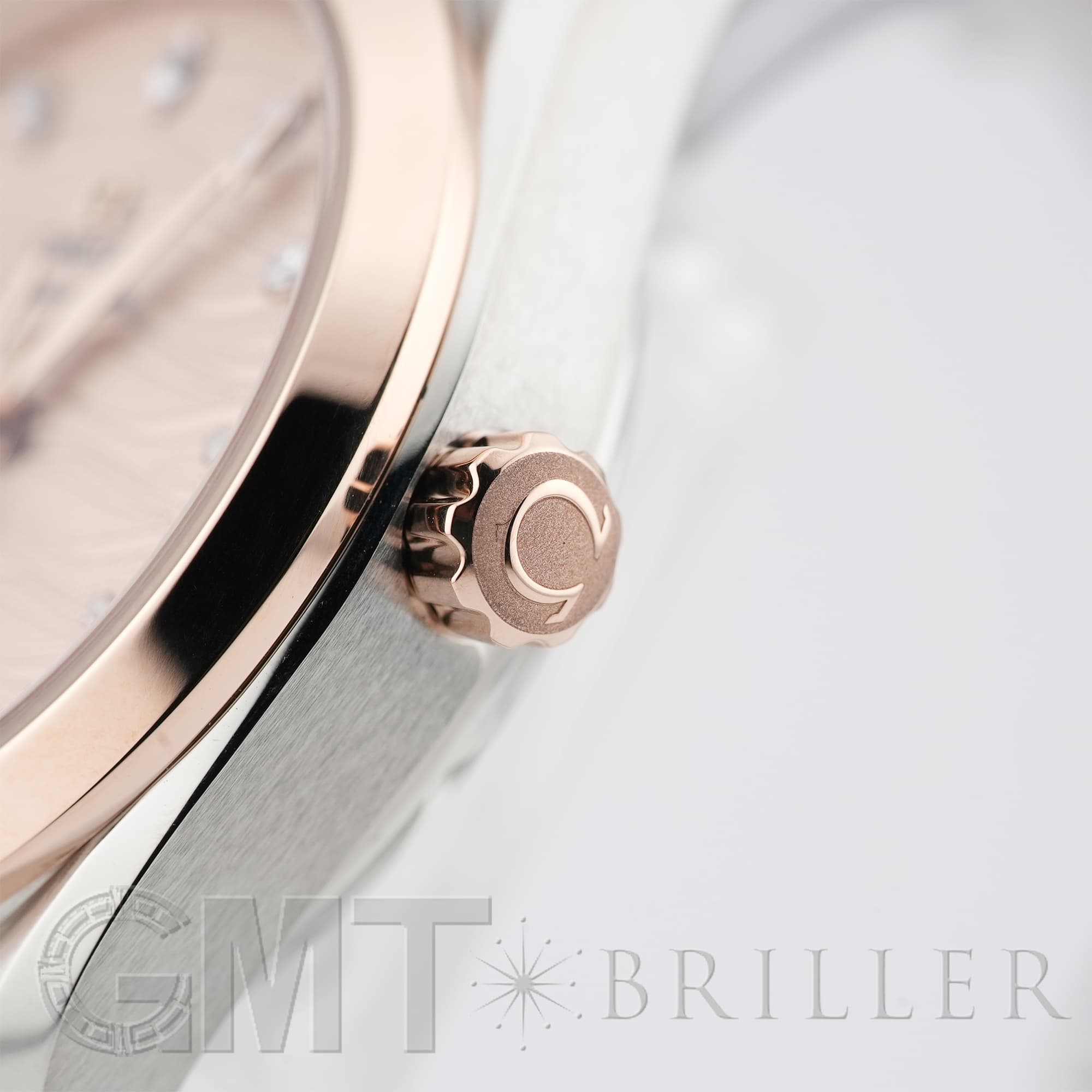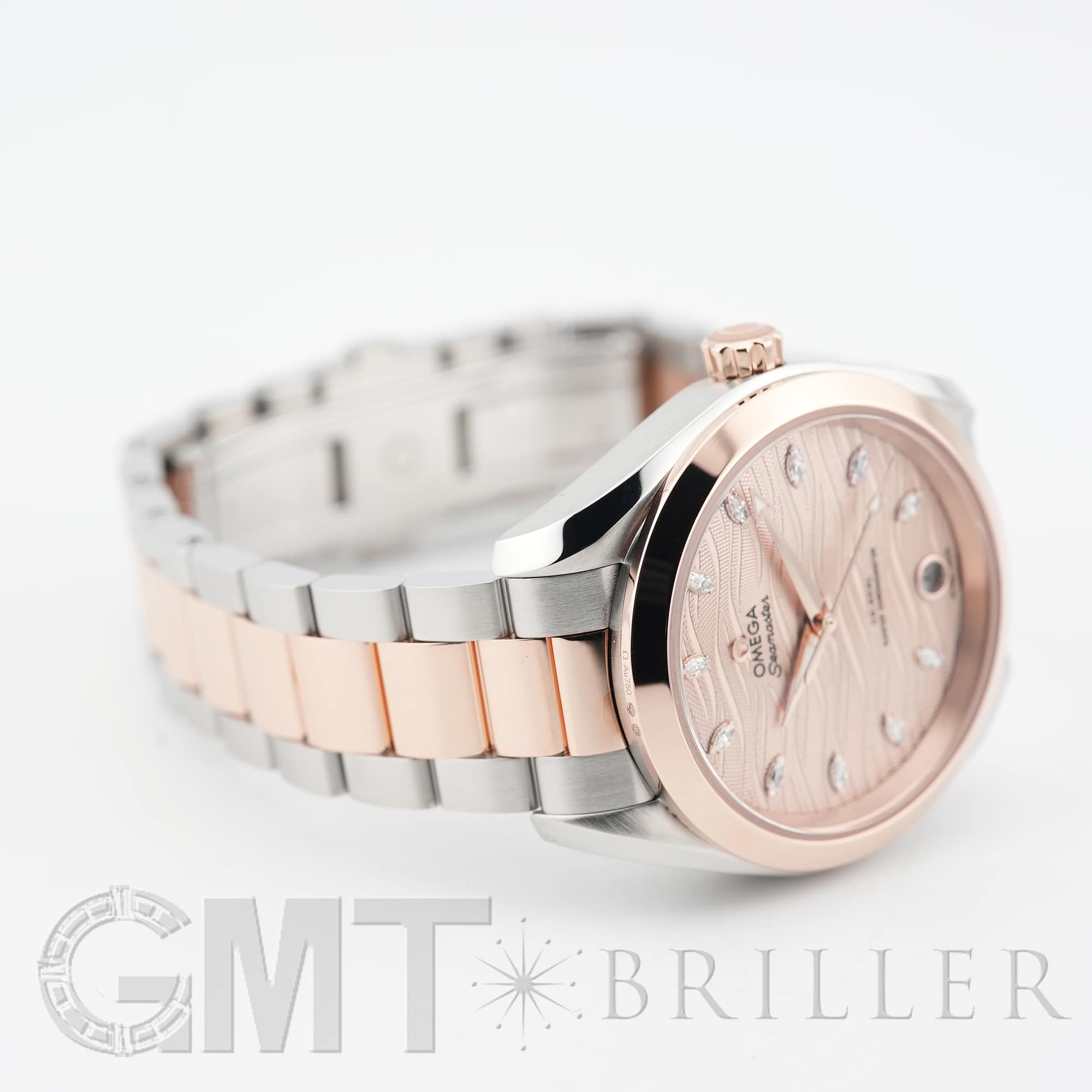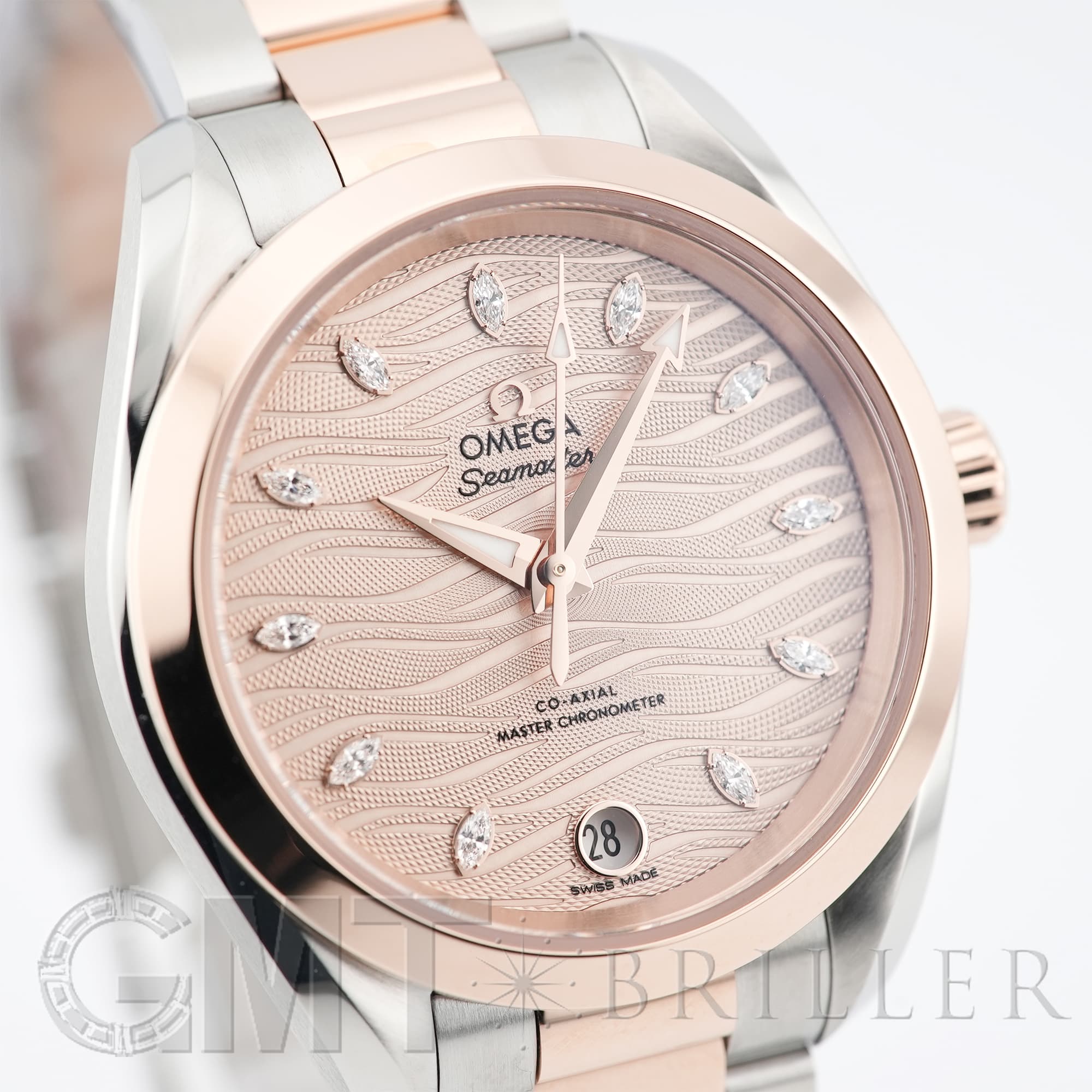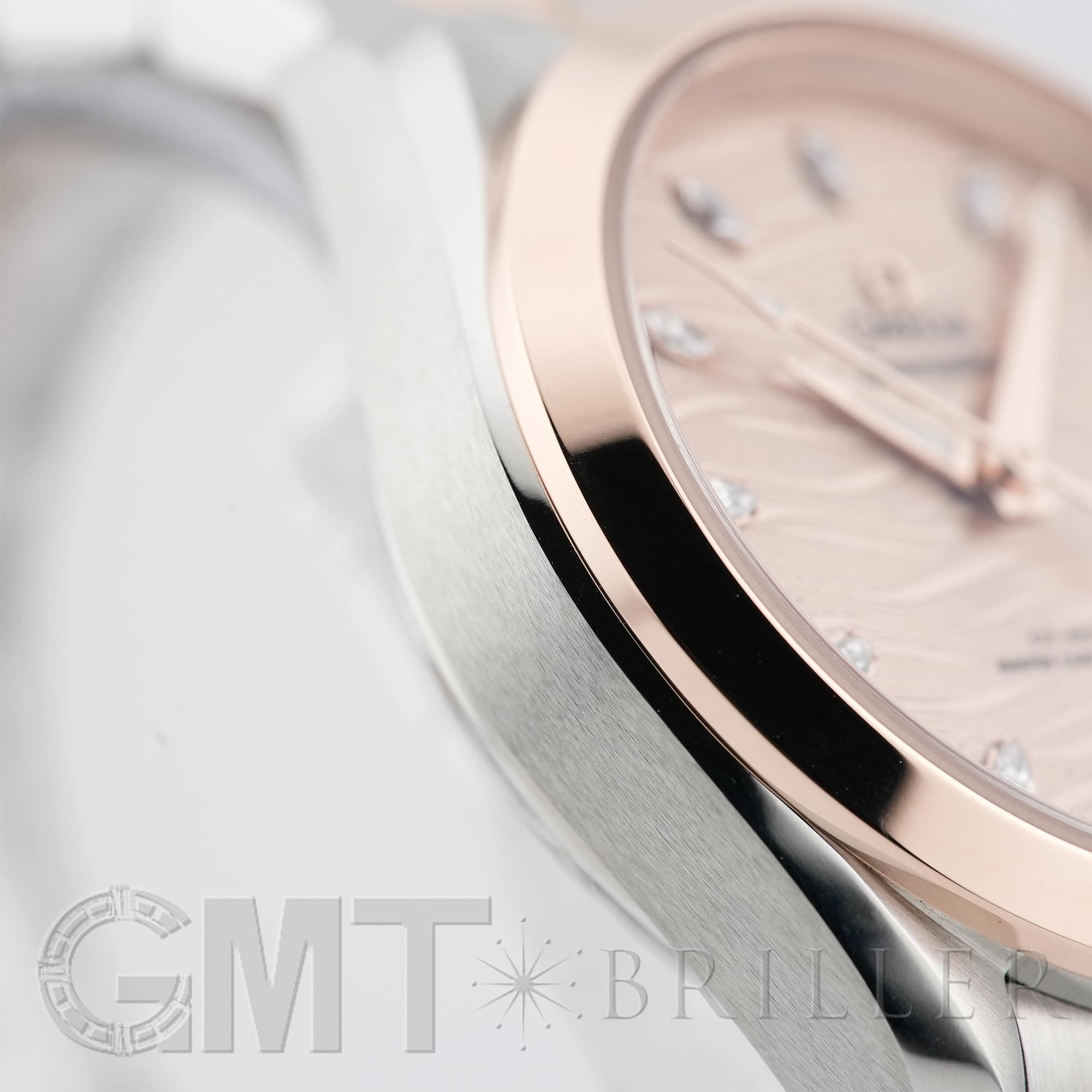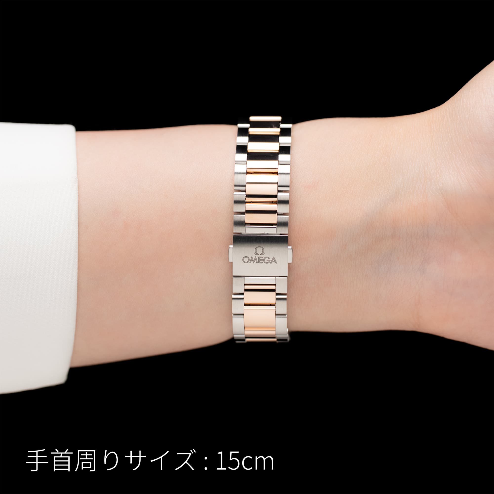 海と都会のエレガンスを融合したレディース向け「アクアテラ」。グレーを基調に、ほのかなローズニュアンスも感じられる柔らかな色調のダイアル。立体的なウェーブパターンダイアルが光を受けて繊細な陰影を描き、華やかな存在感。11石のダイヤモンドインデックスと洗練された針が視認性とジュエリー性を両立。34mmケースとSS×セドナゴールドのコンビ仕様が女性の手元に程よい高級感を演出します。しなやかなブレスレットは手首に自然に沿い、日常使いでも快適な装着感。Cal.8800 マスター クロノメーター搭載、約55時間パワーリザーブと15,000ガウス耐磁性能を確保。150m防水とサファイアクリスタル風防、日付表示を備えた実用性の高い一本。エレガントからデイリーまで幅広く活躍する、上品さと機能性を兼ね備えたモデルです。