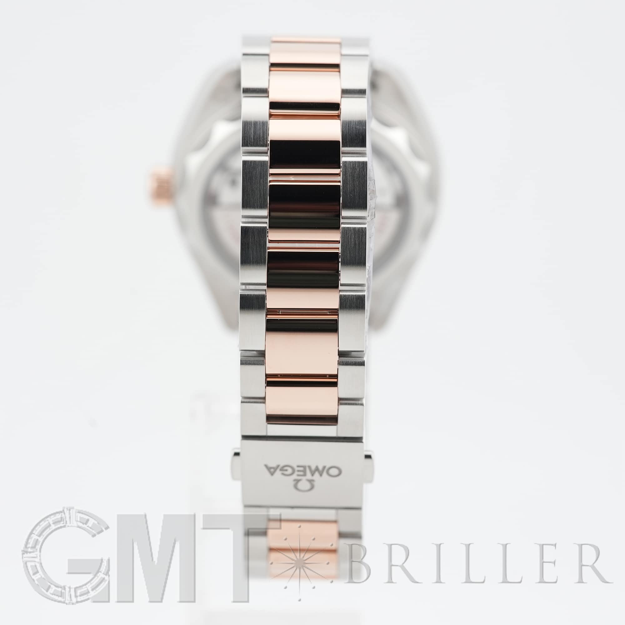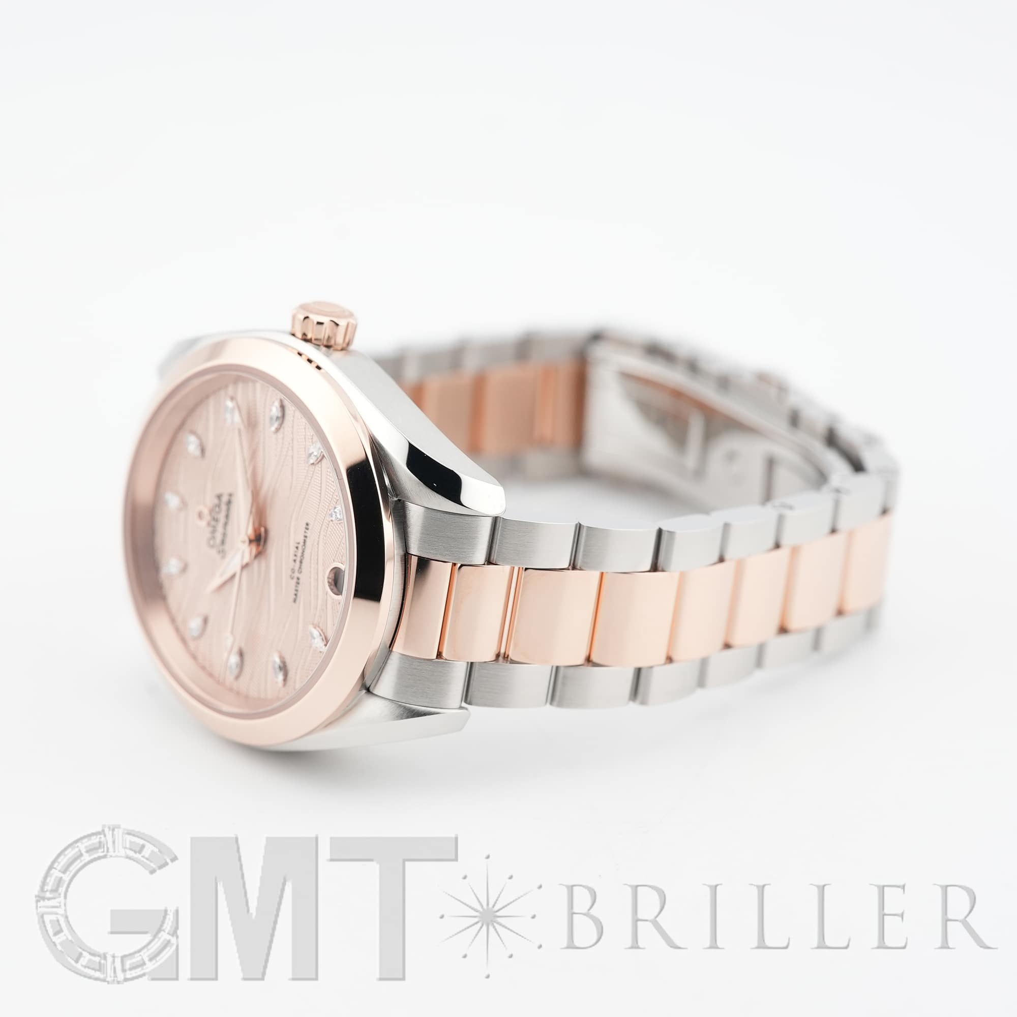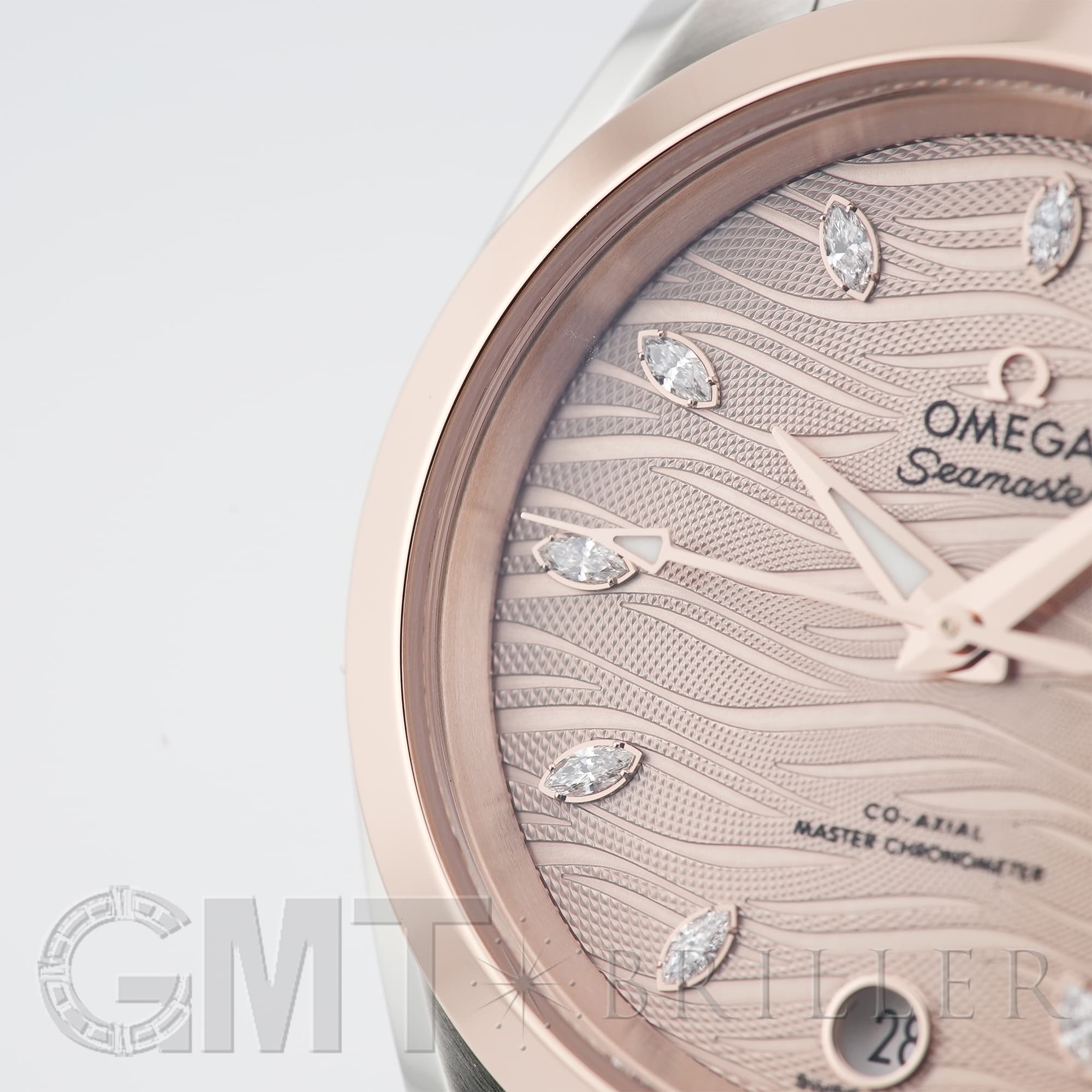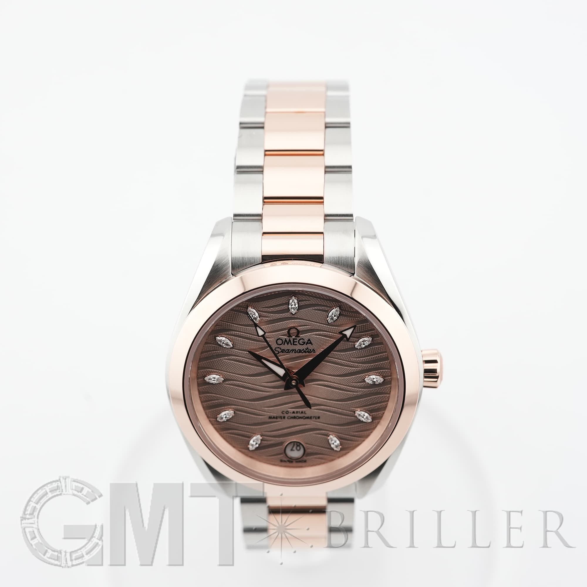 海と都会のエレガンスを融合したレディース向け「アクアテラ」。グレーを基調に、ほのかなローズニュアンスも感じられる柔らかな色調のダイアル。立体的なウェーブパターンダイアルが光を受けて繊細な陰影を描き、華やかな存在感。11石のダイヤモンドインデックスと洗練された針が視認性とジュエリー性を両立。34mmケースとSS×セドナゴールドのコンビ仕様が女性の手元に程よい高級感を演出します。しなやかなブレスレットは手首に自然に沿い、日常使いでも快適な装着感。Cal.8800 マスター クロノメーター搭載、約55時間パワーリザーブと15,000ガウス耐磁性能を確保。150m防水とサファイアクリスタル風防、日付表示を備えた実用性の高い一本。エレガントからデイリーまで幅広く活躍する、上品さと機能性を兼ね備えたモデルです。