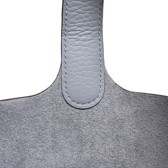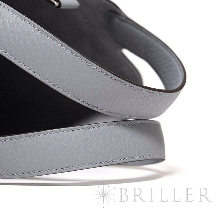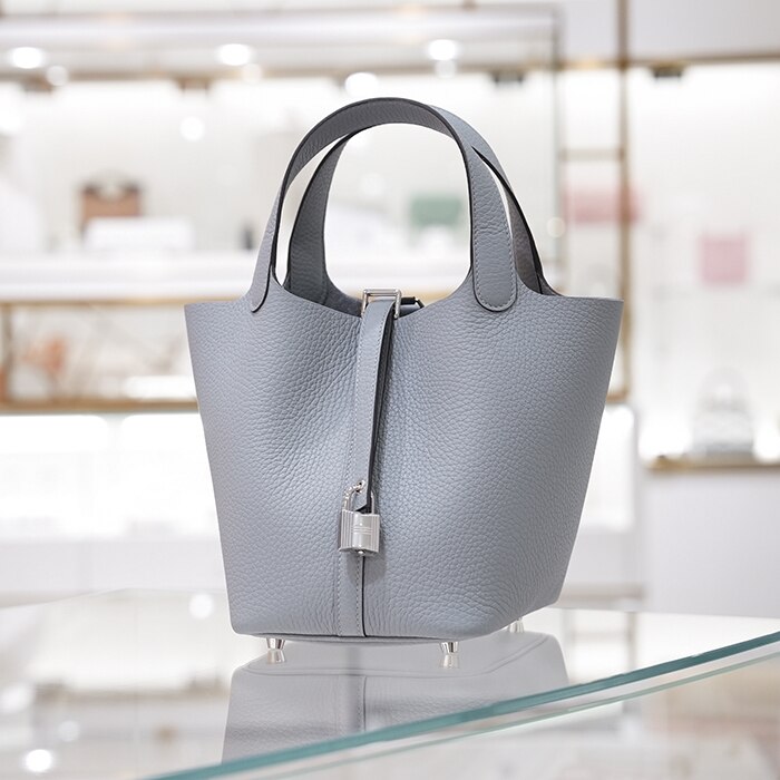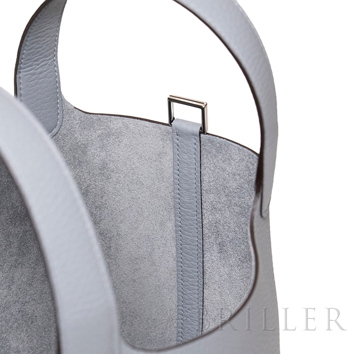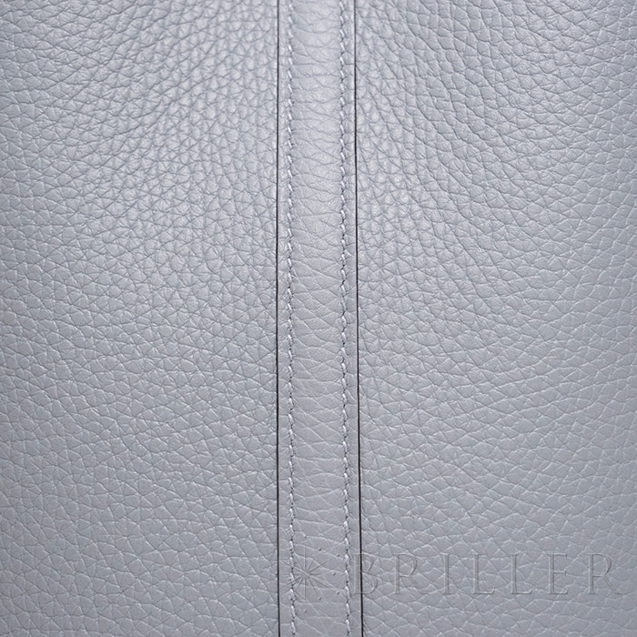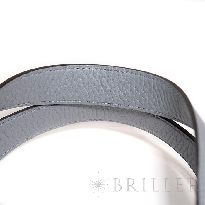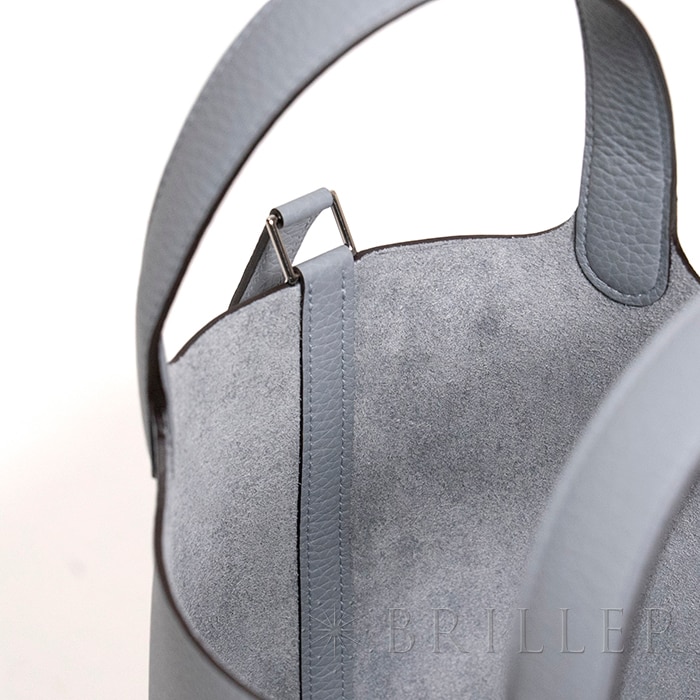 2003年に登場したピコタンは、牛馬用の飼料袋を着想源としたシンプルなフォルムが特徴のバッグ。木製の穀物計量器に由来する名称を持ち、2008年頃よりカデナ付きの「ピコタンロック」へと発展しました。PMサイズは日常使いやサブバッグとして扱いやすい大きさです。素材のトリヨンクレマンスはしっとりとした柔らかさがあり、傷が目立ちにくい点も魅力。2025年SSの新色グリパンタンは奥行きのあるブルーグレーで、シルバー金具と調和し落ち着いた印象に仕上がっています。