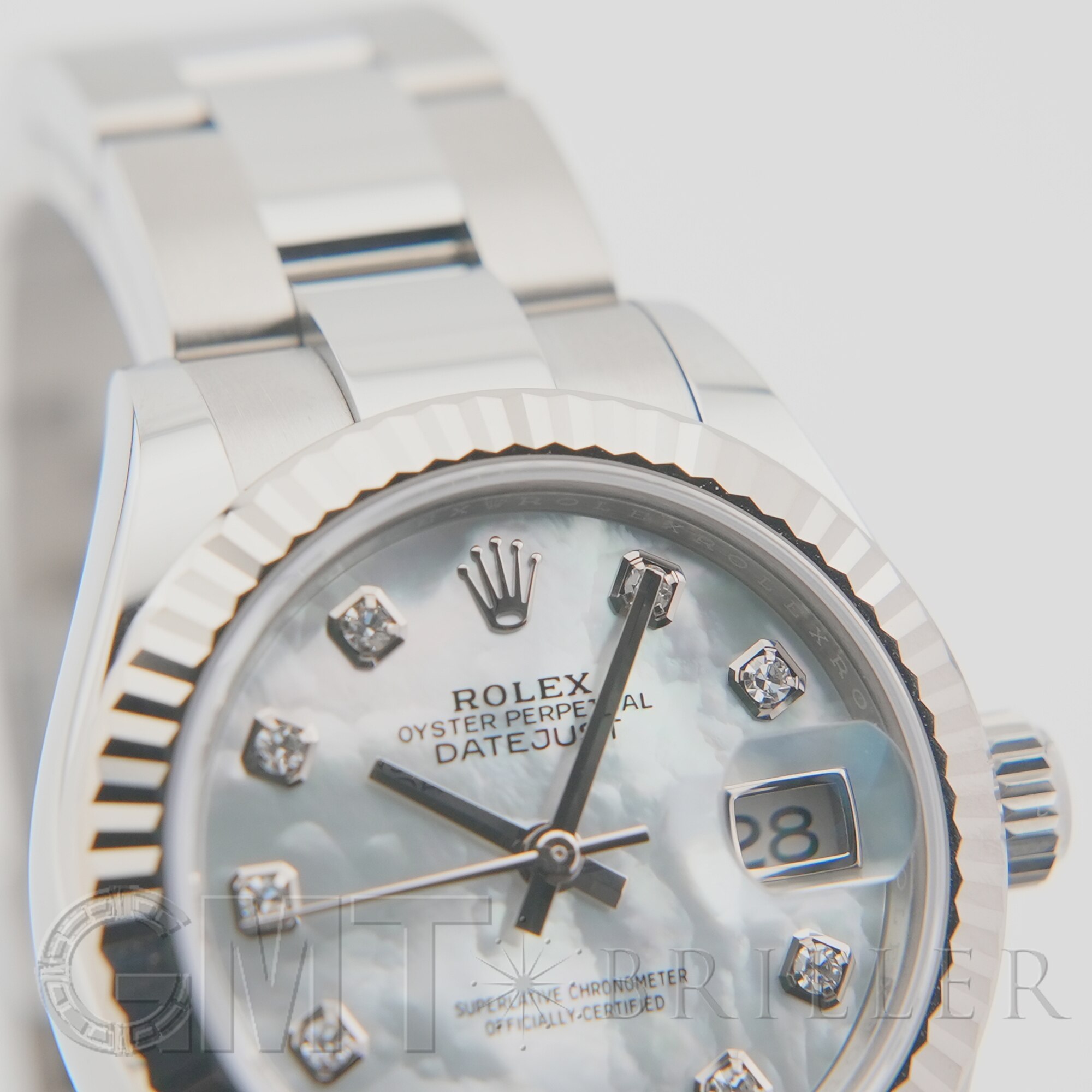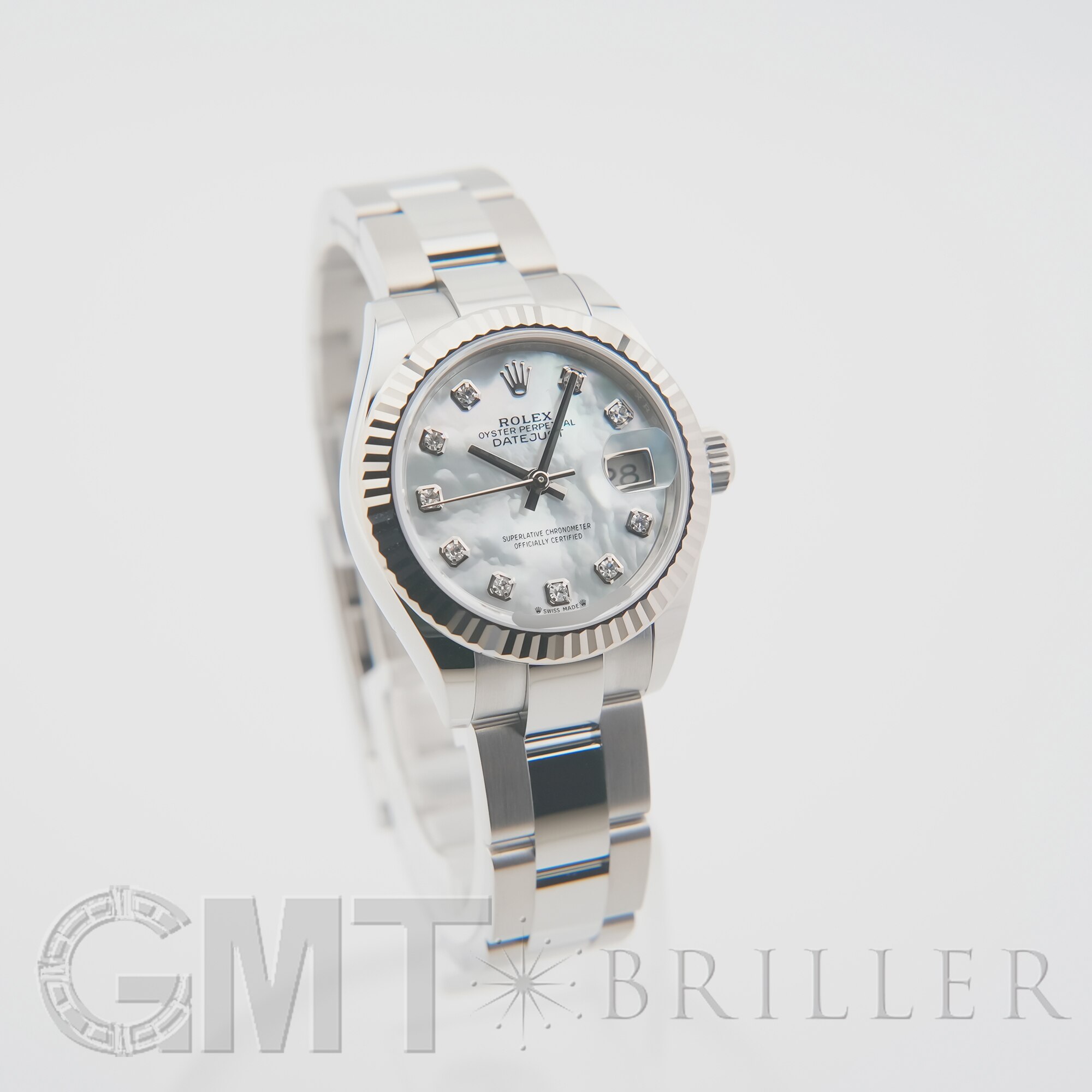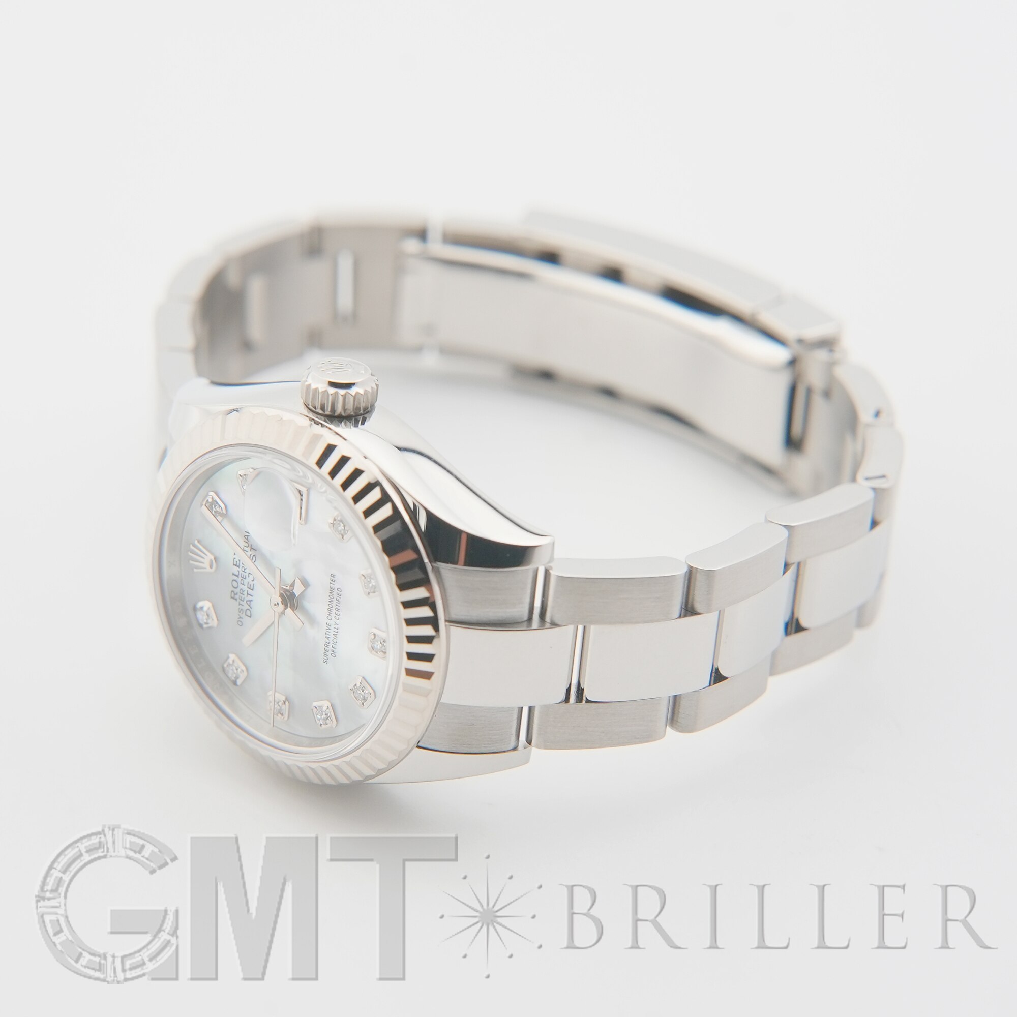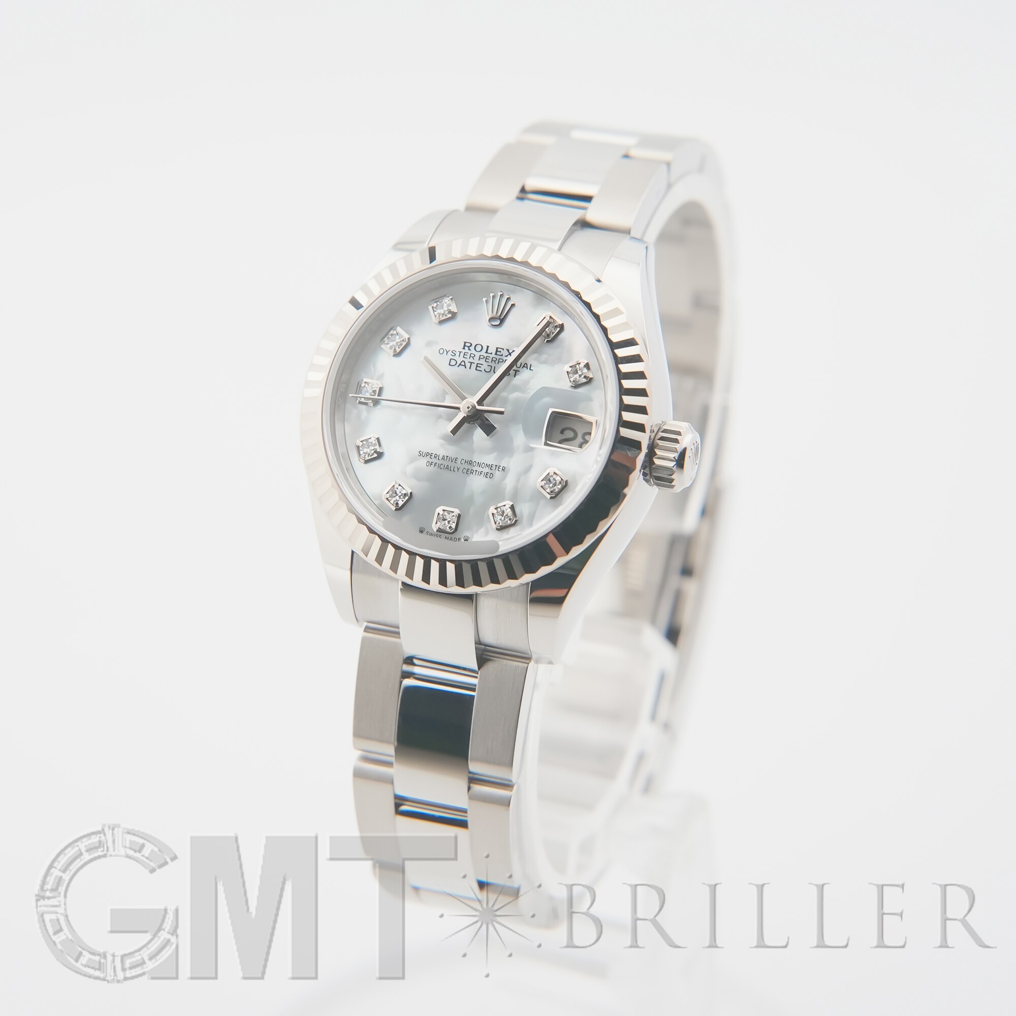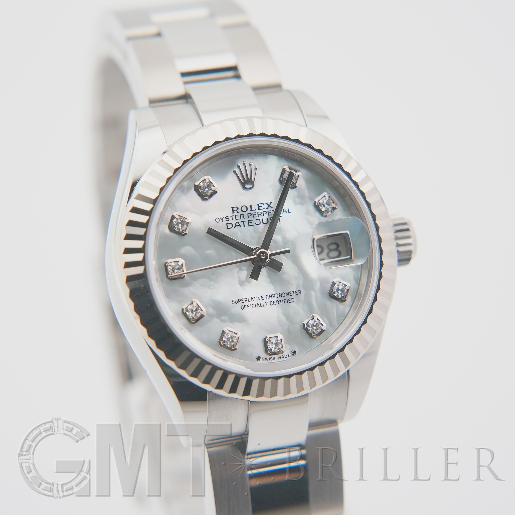 ロレックスの「デイトジャスト」279174。前モデル「179174」の後継として2017年に誕生し、ケースサイズは26mmから28mmへとサイズアップ。より現代的なバランスへと進化しています。自社製ムーブメントCal.2236を搭載し、優れた精度と約55時間のパワーリザーブを実現。フルーテッドベゼルに加え、こちらはシンプルでスポーティな印象のオイスターブレスレットを採用しています。ホワイトシェル文字盤にダイヤモンドをセッティングした華やかさと実用性を兼ね備えた一本です。