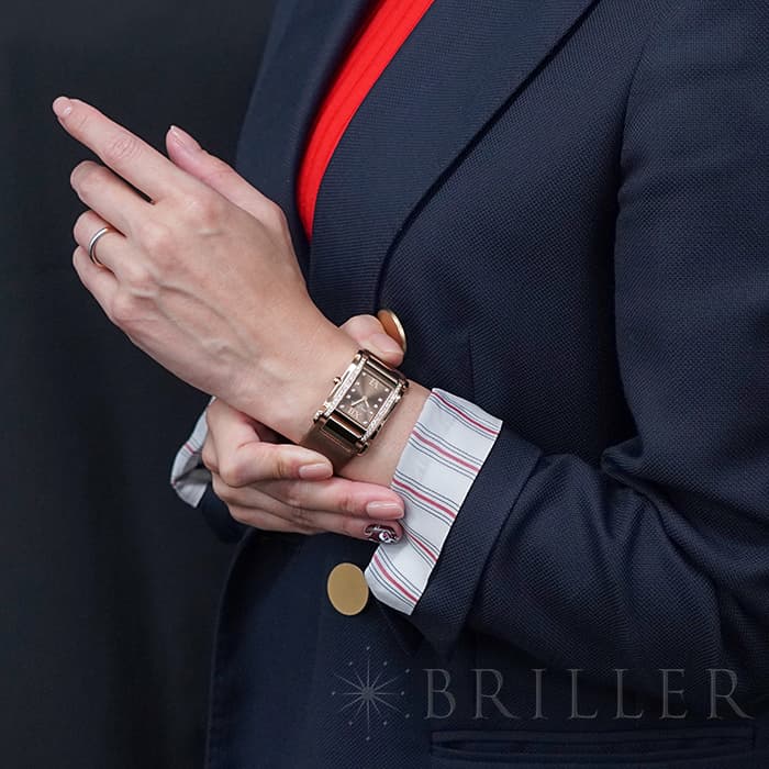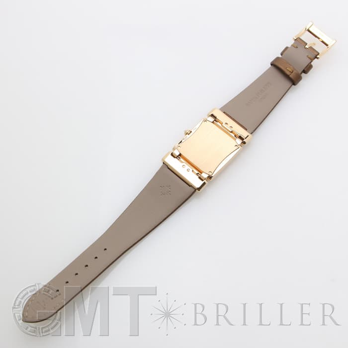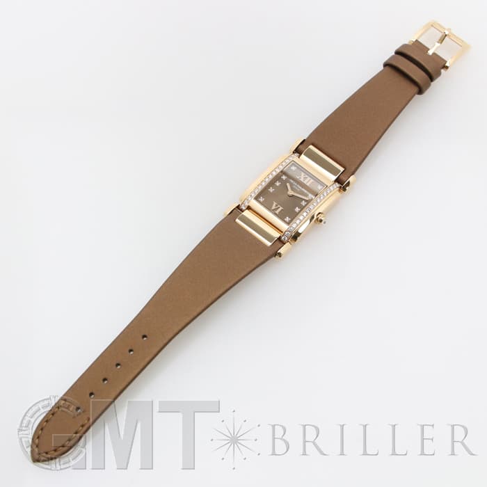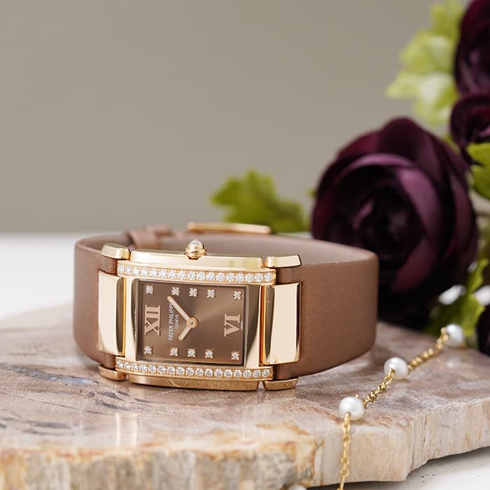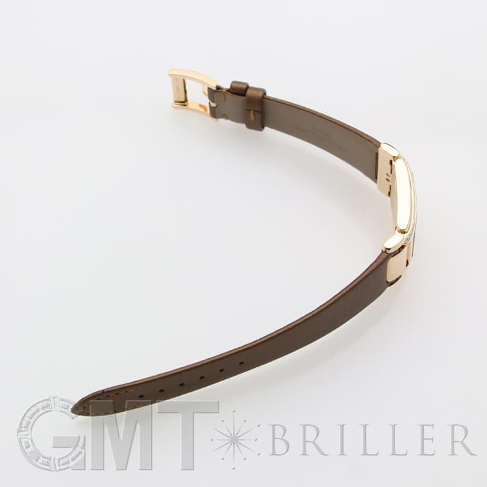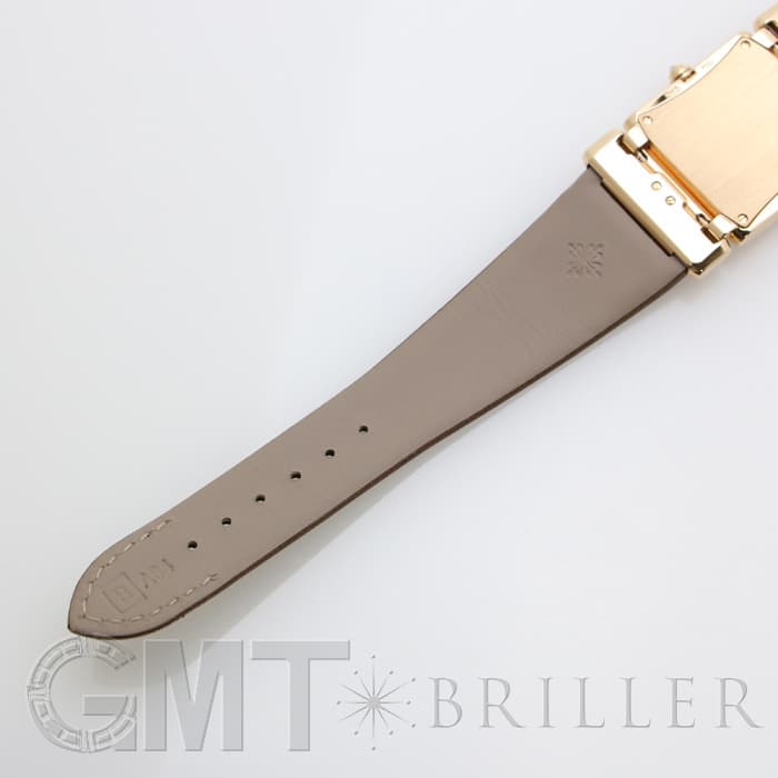 磨き上げられた美しいローズゴールドのブレスレット、ケースからブレスレットが同じような幅でジュエリーのように楽しめます。パテックフィリップの上質で透明度の高いダイヤモンドが周囲の目を独り占めするような主役になるデザインで、パーティーなどの集まりでひときわ華やかに手元を彩ります。ブラウンのサテン素材のレザーベルトが付属しますので、時計をファッションとしても楽しめる1本になっています。
