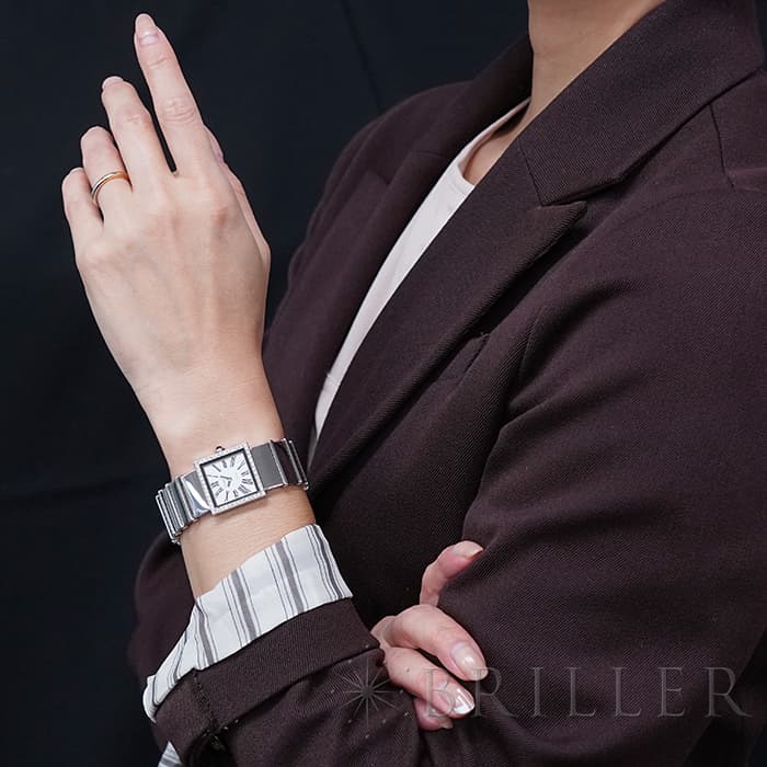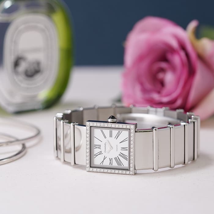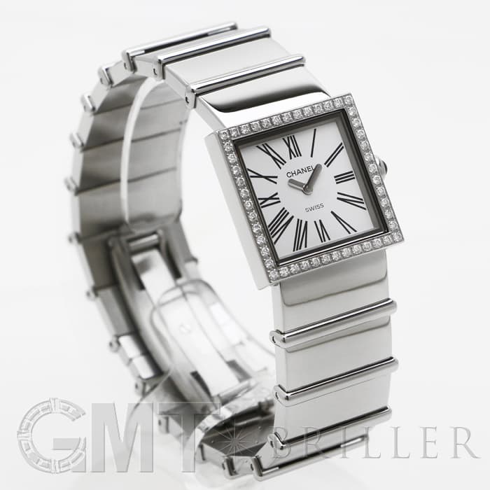 シャネルがリリースしたスクエアケースのレディース時計「マドモアゼル」ベゼルにダイヤモンドを配し、素材のステンレスはポリッシュ加工を施してあるので、大変美しい仕上がりになっています。