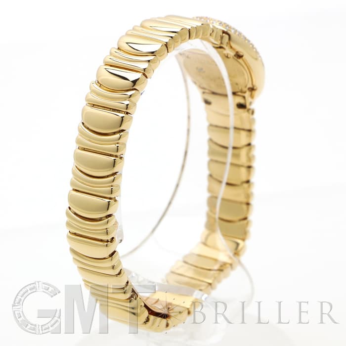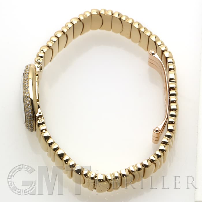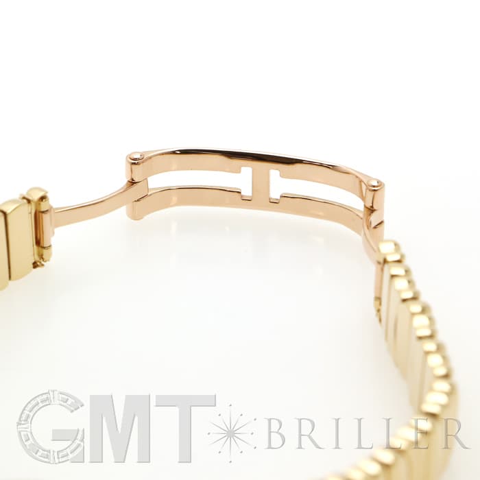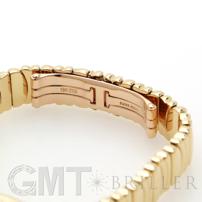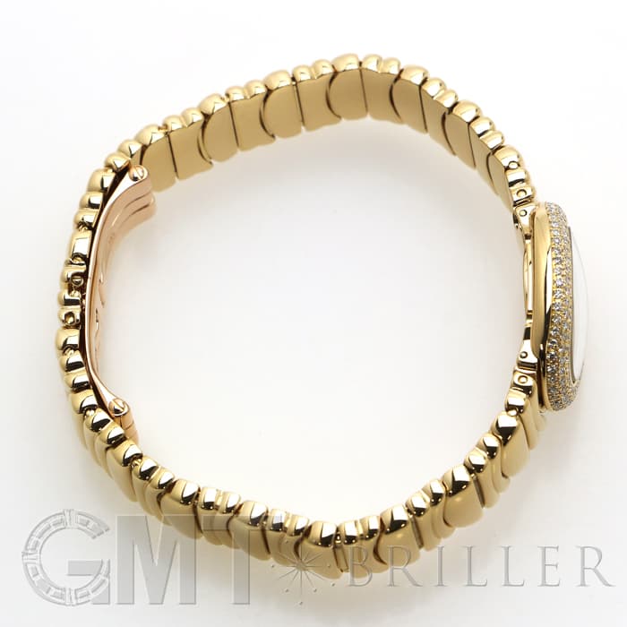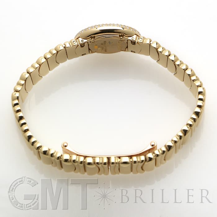 ラウンドケースにセッティングされたダイヤモンド、またブレスの素材など余すことなく煌びやかに輝く宝石のようなモデルです。ブレスレットのバックルは、内側に折りたたむように留めるので、この時計の持つデザイン性を損ねることなく着けることができます。時刻はケースバックのプッシュボタンを押して調整をするタイプで、敢えてリューズを持たないフォルムにすることで、柔らかな曲線が生かされたアンティークのような雰囲気になっています。