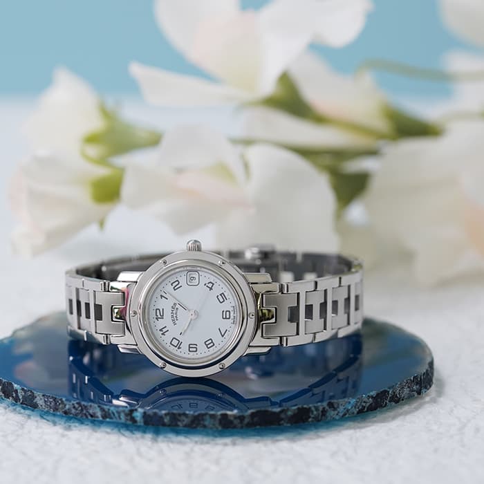 その由来は船の窓からインスピレーションを受けたベゼルに表れています。エルメスの特徴である「H」が連なったようなブレスや裏蓋に記されたロゴの四輪馬車など所々にエルメスらしさがあります。
