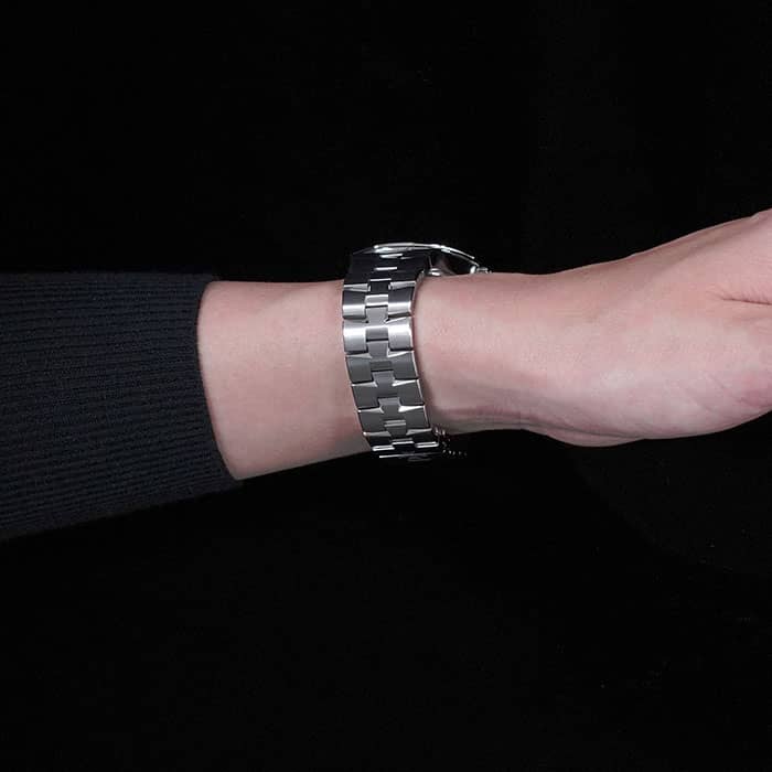 通常の3針モデルとは異なり9時位置にスモールセコンドを配しています