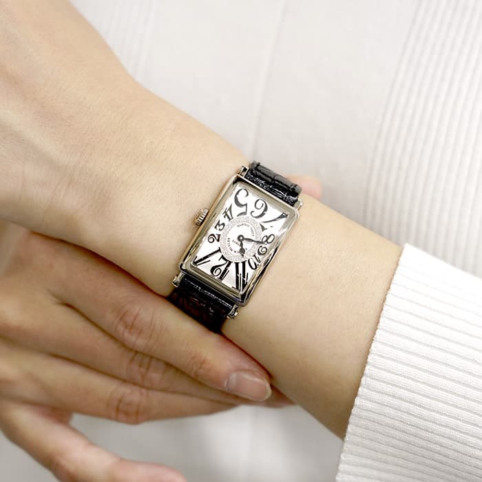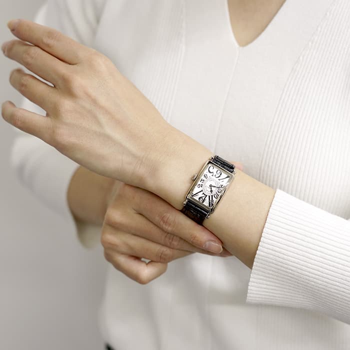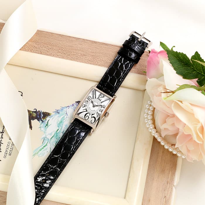 レクタンギュラーケースにスペードの針、文字の際まで配置されたビザン数字が、フランク・ミュラーらしい独創的で美しいデザインに仕上げています。