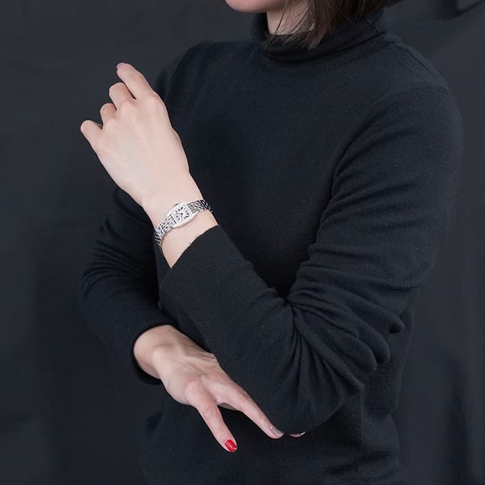 また、ベゼルとラグにダイヤモンドがセッティングされておりますので、ジュエリーのようにドレスアップした華やかな会集まりにもおすすめのレディースウォッチです。