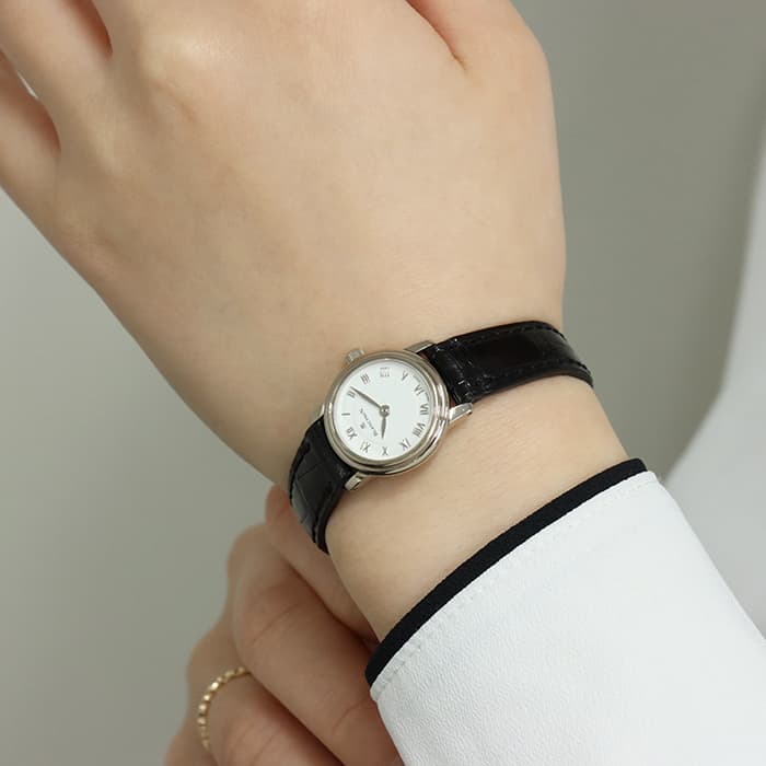 ホワイトの文字盤とローマンインデックスのシンプルなデザインは