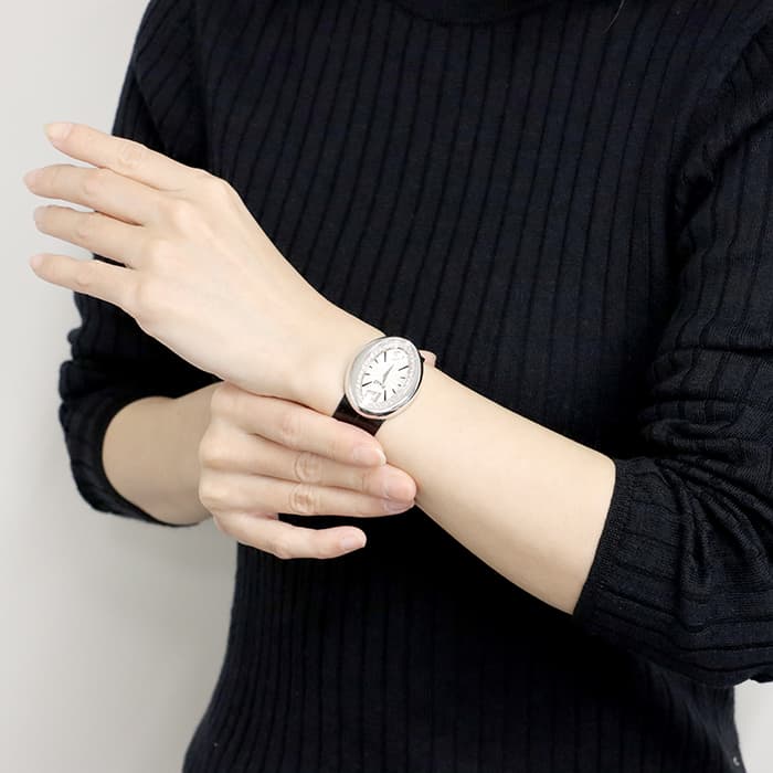 ベゼルを回転させて縦・横・斜めの3パターンにフォルムが変わると、数字が12時6時で現れたり、バー状のインデックスになったり、エレガントに表情を変え、1本の時計で3通りの雰囲気をお楽しみいただける独創的な時計です。ベゼルの内側に文字盤のコントラストを強調するようにダイヤモンドが多数セットされ、ラグジュアリーな雰囲気を醸し出し、華やかに手元を彩ります。