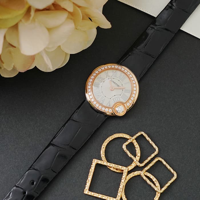 ピンクゴールドのラウンドケースにハイジュエラー「カルティエ」厳選のダイヤモンドを合計約0.56ctセッティングした気品あふれる「バロン ブラン ドゥ カルティエ」。