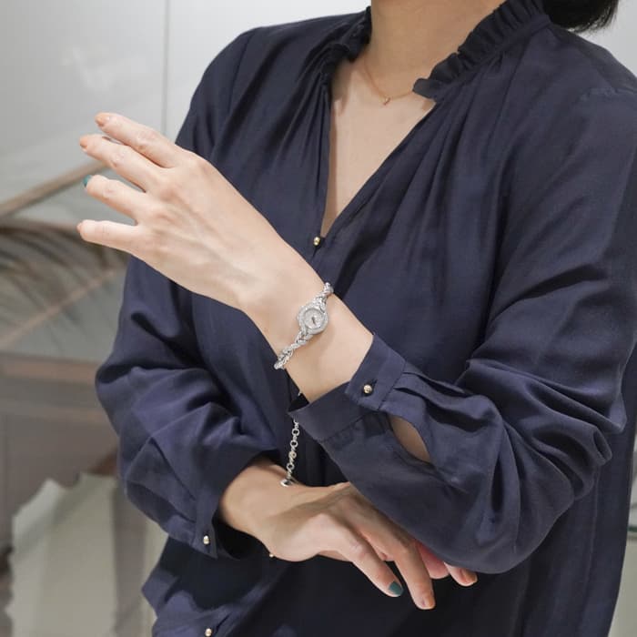 文字盤には約0.22ctになる71個のラウンド・ブリリアントカット・ダイヤモンド、 ストラップには約1.4ctになるウンド・ブリリアントカット・ダイヤモンドをセッティング。