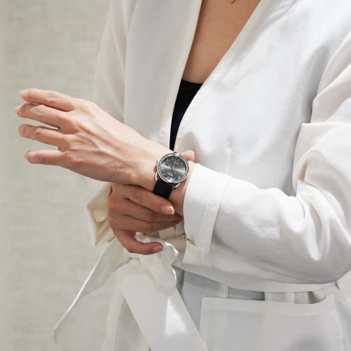 線形の数字で描かれたインデックスは気品漂う雰囲気を作り出しており、エルメスならではのエレガントさをお楽しみいただけます。